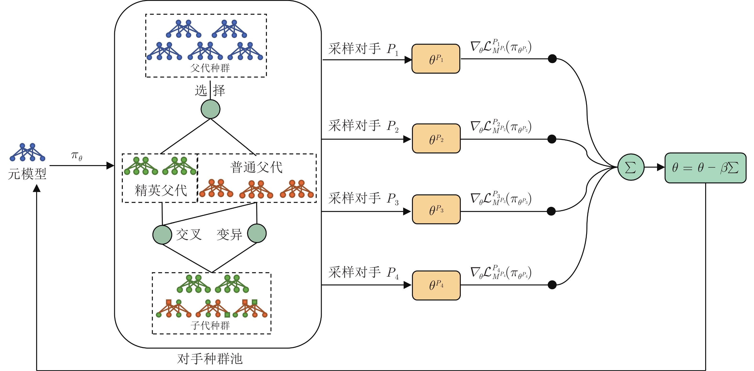 围绕两人零和博弈所开展的一系列研究, 近年来在围棋、德州扑克等问题中取得了里程碑式的突破. 现有的两人零和博弈求解方案大多在理性对手的假设下围绕纳什均衡解开展, 是一种力求不败的保守型策略, 但在实际博弈中由于对手非理性等原因并不能保证收益最大化. 对手建模为最大化博弈收益提供了一种新途径, 但仍存在建模困难等问题. 结合元学习的思想提出了一种能够快速适应对手策略的元策略演化学习求解框架. 在训练阶段, 首先通过种群演化的方法不断生成风格多样化的博弈对手作为训练数据, 然后利用元策略更新方法来调整元模型的网络权重, 使其获得快速适应的能力. 在Leduc扑克、两人有限注德州扑克(Heads-up limit Texas Hold'em, LHE)和RoboSumo上的大量实验结果表明, 该算法能够有效克服现有方法的弊端, 实现针对未知风格对手的快速适应, 从而为两人零和博弈收益最大化求解提供了一种新思路.