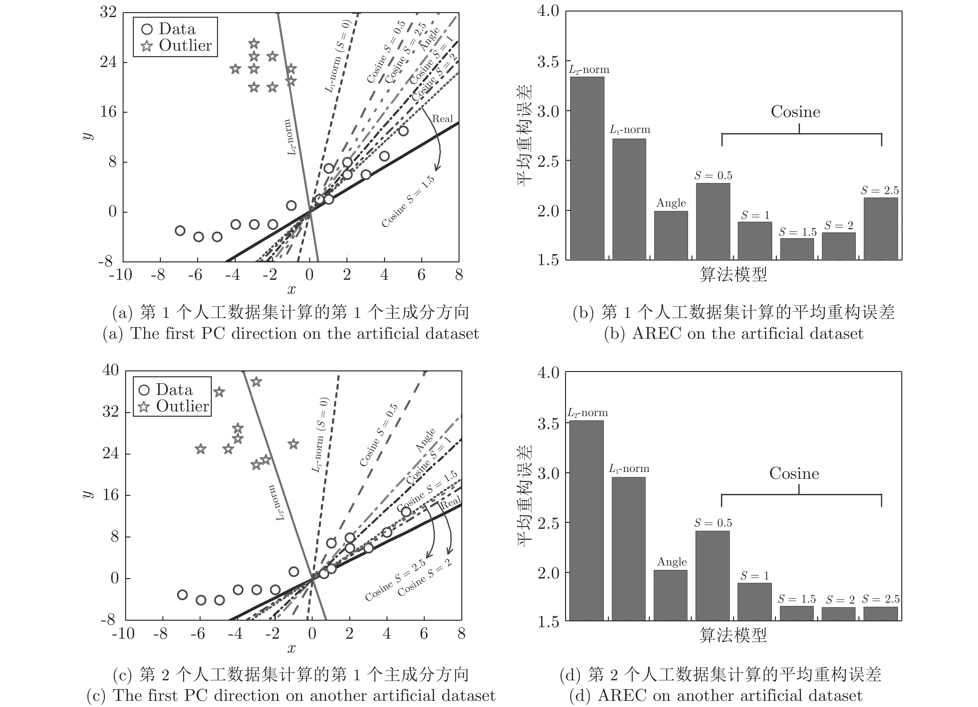 主成分分析(Principal component analysis, PCA) 是一种广泛应用的特征提取与数据降维方法, 其目标函数采用L2范数距离度量方式, 对离群数据及噪声敏感. 而L1范数虽然能抑制离群数据的影响, 但其重构误差并不能得到有效控制. 针对上述问题, 综合考虑投影距离最大及重构误差较小的目标优化问题, 提出一种广义余弦模型的目标函数. 通过极大化矩阵行向量的投影距离与其可调幂的2范数之间的比值, 使得其在数据降维的同时提高了鲁棒性. 在此基础上提出广义余弦二维主成分分析(Generalized cosine two dimensional PCA, GC2DPCA), 给出了其迭代贪婪的求解算法, 并对其收敛性及正交性进行理论证明. 通过选择不同的可调幂参数, GC2DPCA可应用于广泛的含离群数据的鲁棒降维. 人工数据集及多个人脸数据集的实验结果表明, 本文算法在重构误差、相关性及分类率等性能方面均得到了提升, 具有较强的抗噪能力.