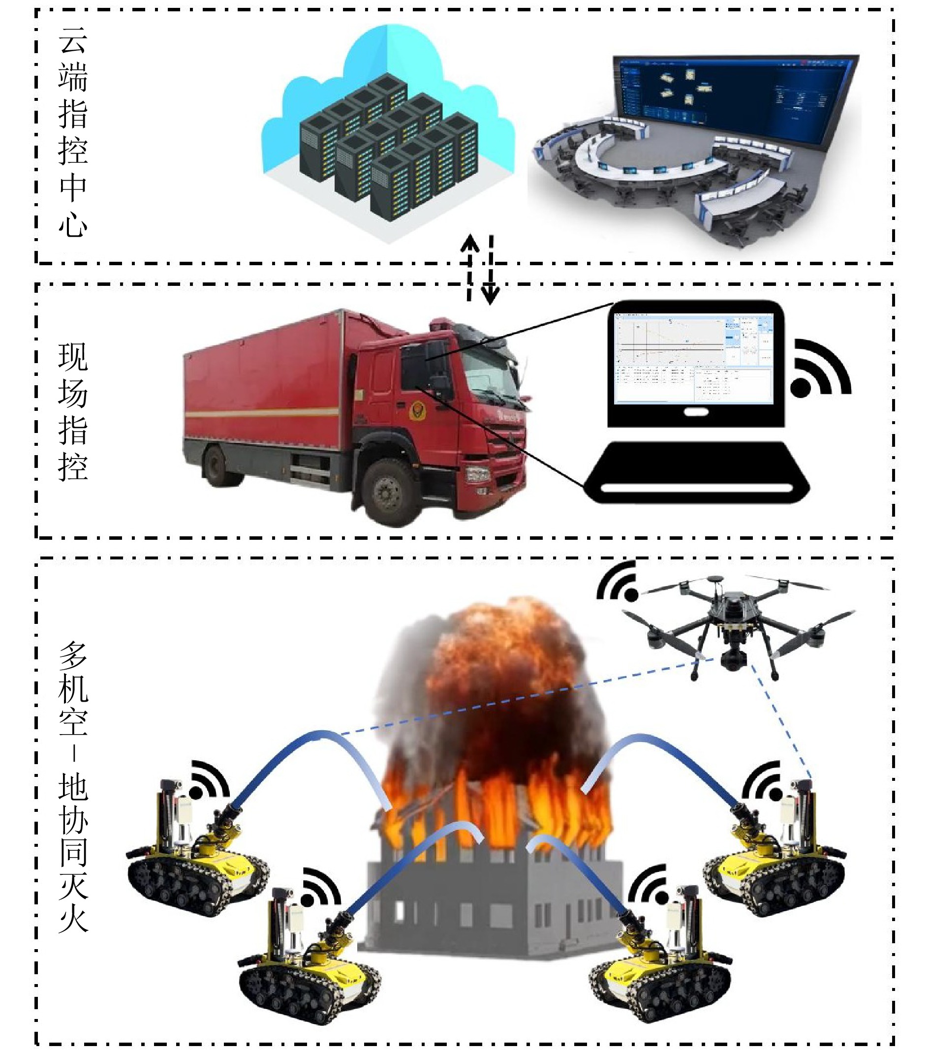 复杂火灾场景下传统消防手段存在全局感知能力不足、协同能力弱等问题, 因此提出一种基于无人机空中引导的多消防机器人协同作业系统. 通过构建空−地异构协同架构, 融合无人机全局态势感知与地面消防机器人精准作业能力, 实现火灾动态环境下的高效协同灭火. 通过融合先验地图、高空侦察信息和多视角观测信息, 构建适用于灭火指控的多图层火场地图, 在保障关键信息获取的同时兼顾建图效率. 同时结合水柱轨迹模型、多视角观测信息及结构层数据, 实现水柱轨迹和落点的准确检测. 然后设计队列式与多形态主从编队模式, 配合快速队形重构算法生成编队参考信号. 进而, 基于提出的柔性预定性能函数设计无人机位姿矢量控制器, 以及基于改进视距导引法设计多消防机器人编队控制器. 最后, 开展空−地多机协同控制算法的仿真验证, 并将系统集成到开诚RXB-MC80BD消防机器人上进行应用测试.