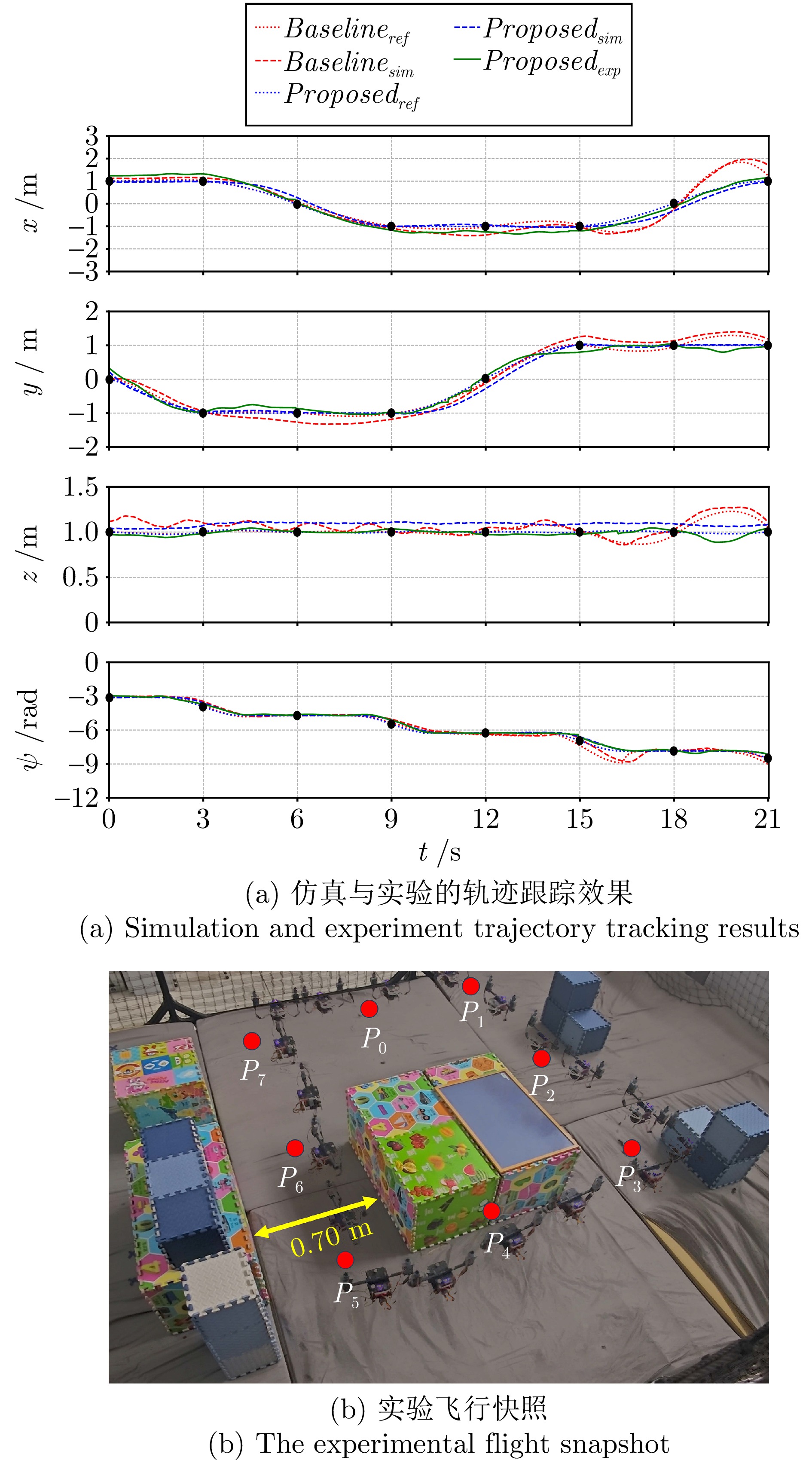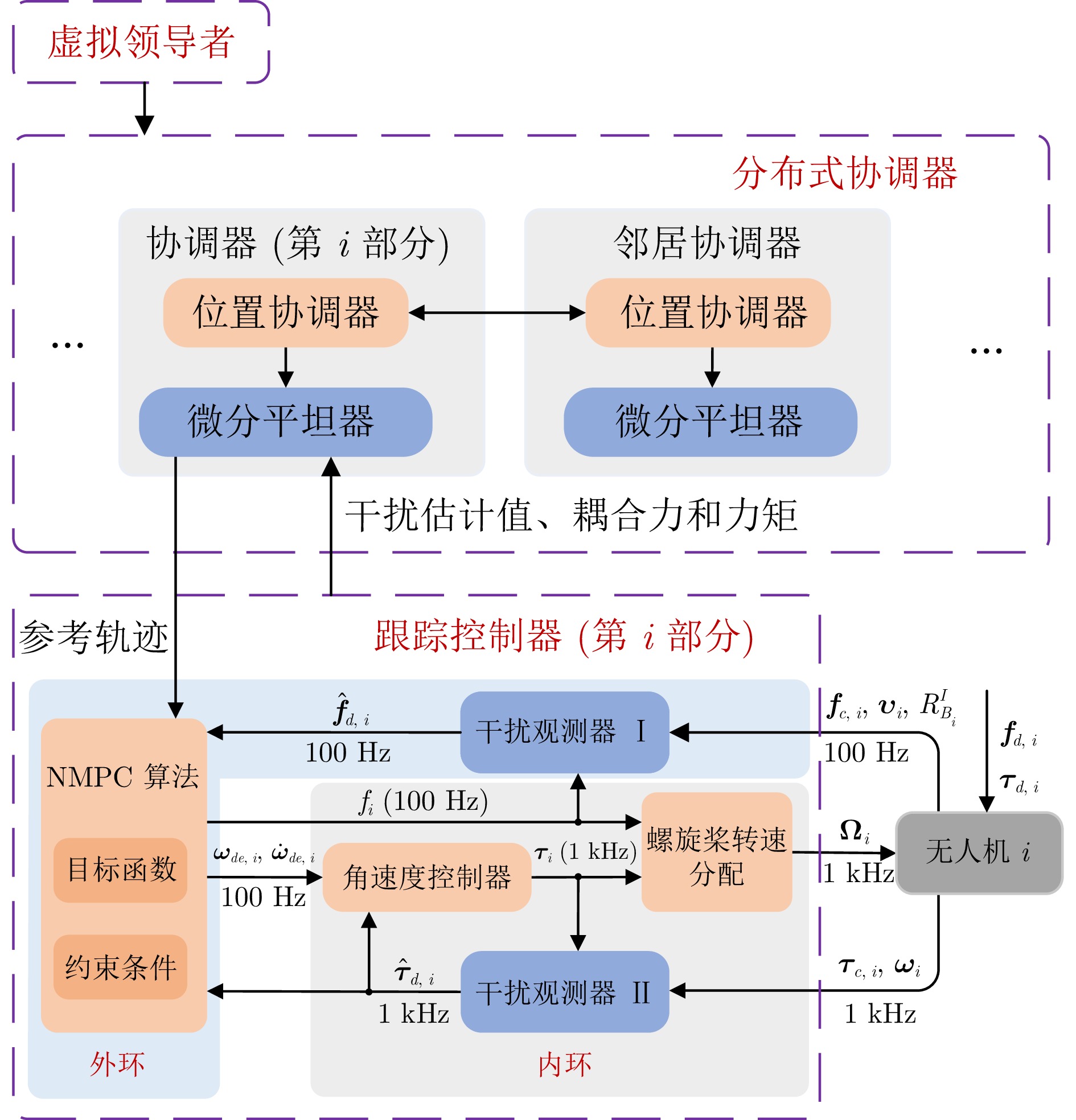 多四旋翼无人机协同编队运输技术因其高容错性和强灵活性等特点, 近年来受到广泛关注. 针对受到螺旋桨转速约束和外界环境干扰影响的多四旋翼无人机系统, 提出一种分层控制方案以实现多无人机协同编队运输. 该方案设计主要包含分布式协调器设计和跟踪控制器设计. 在分布式协调器中, 位置协调器基于虚拟领导者的位置、速度等信息生成各带载无人机的期望位置, 然后微分平坦器输出无人机的期望无偏轨迹; 跟踪控制器采用非线性模型预测控制、角速度控制以及螺旋桨转速分配算法相结合的策略, 为各带载无人机生成合理的螺旋桨转速指令, 确保无人机精确跟踪其期望轨迹. 在所提方案作用下, 多带载无人机能维持期望编队队形并跟踪虚拟领导者, 从而实现多无人机协同编队运输. 特别地, 当省略位置协调器时, 该方案可简化为单无人机轨迹跟踪控制器. 数值仿真包括单机轨迹跟踪和多机协同运输两个场景, 结果表明: 在单机跟踪任务中, 所提方案展现出良好的跟踪精度; 在多机运输场景下, 多无人机能够有效实现协同编队运输.
