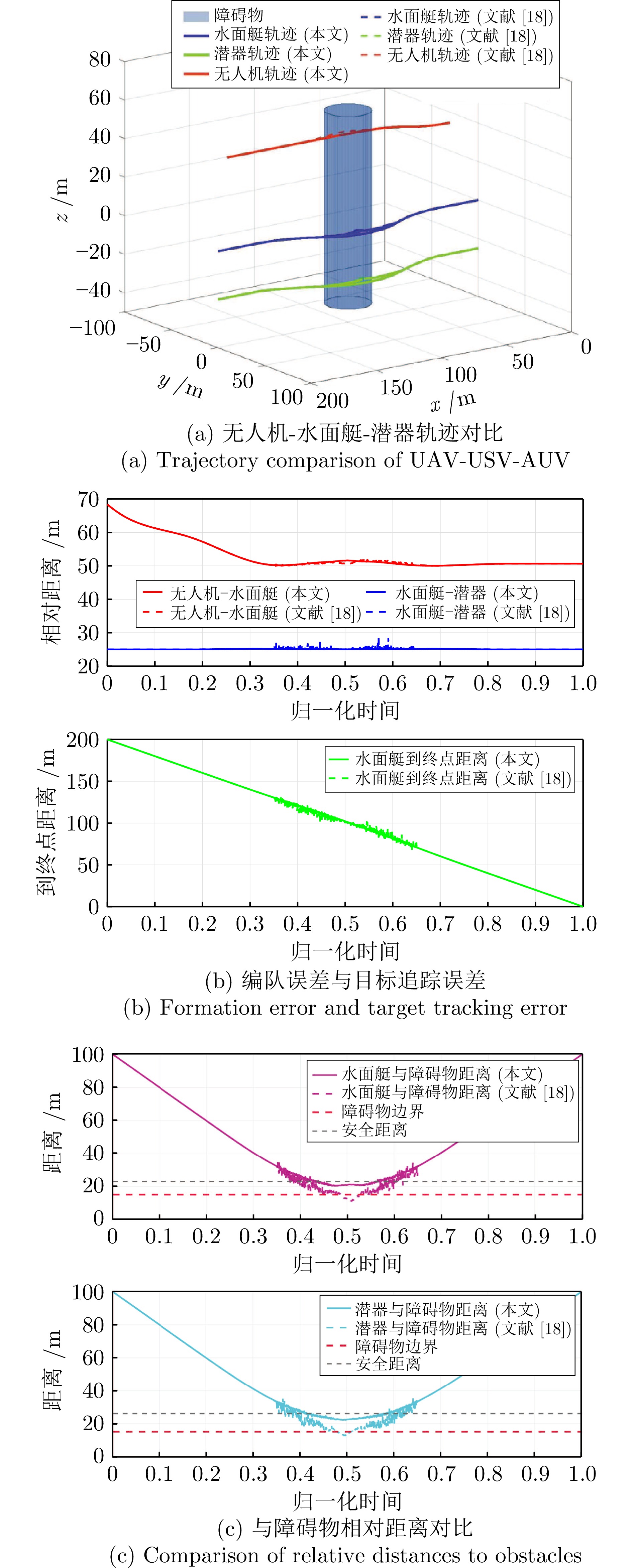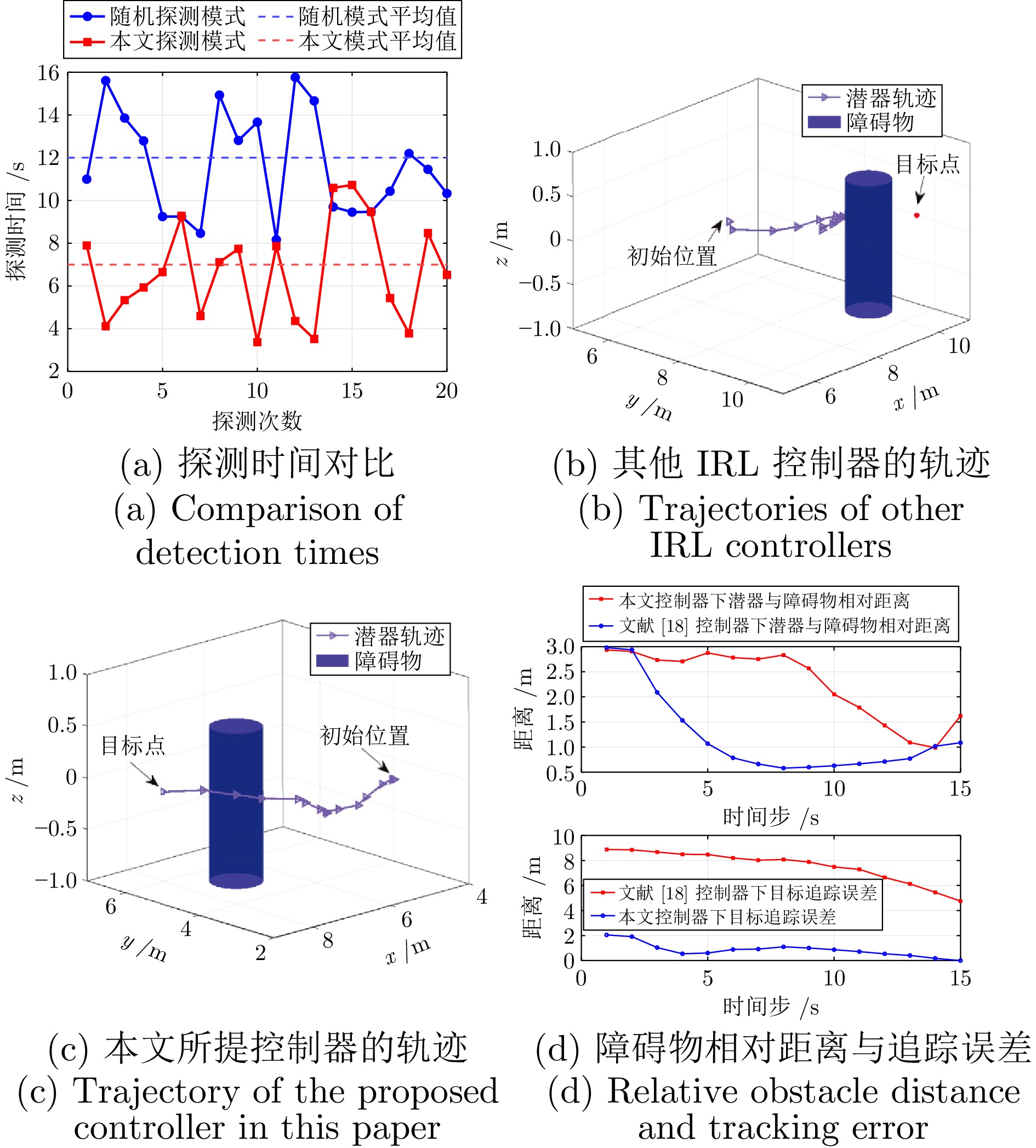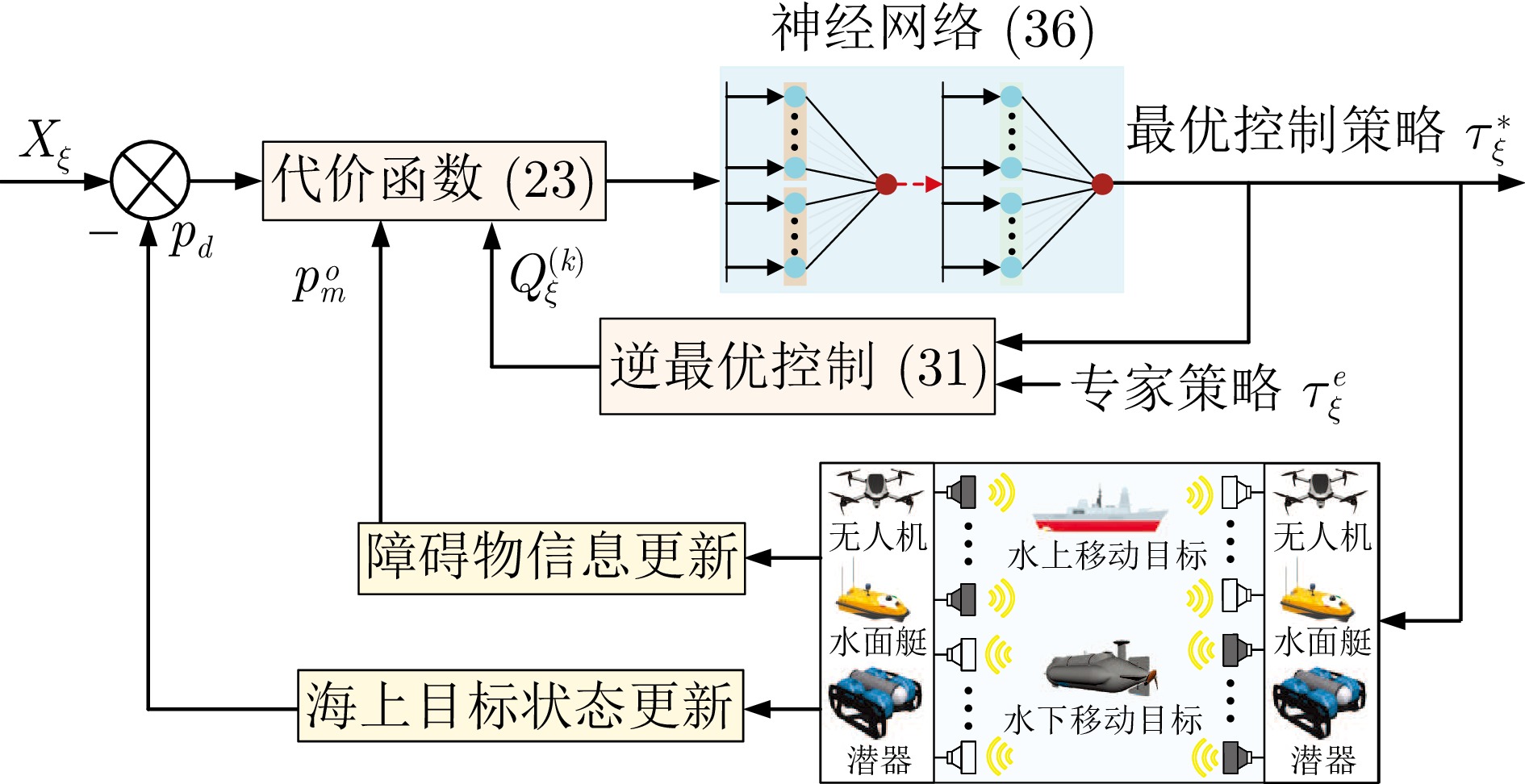 提出一种基于空−海−潜跨域无人平台协同的海上目标探测追踪策略. 首先, 构建无人机−水面艇−潜器协同的海上跨域无人系统; 进一步, 针对海上目标的高机动性以及无人平台自身约束, 采用测度理论解析无人机−水面艇−潜器最佳探测编队队形, 实现目标探测概率最大化; 当探测到目标后, 设计基于逆强化学习的无人机−水面艇−潜器编队控制器, 实现障碍物环境下水面/水下目标的可靠有效追踪. 最后, 通过仿真与实验验证了所提方法的有效性. 结果表明, 所提探测模式可以实现有限时间内移动目标探测概率最大化, 同时所提逆强化学习编队控制器可以在保持队形稳定的基础上, 结合动态避障策略, 实现复杂环境下跨域无人平台安全协同追踪.