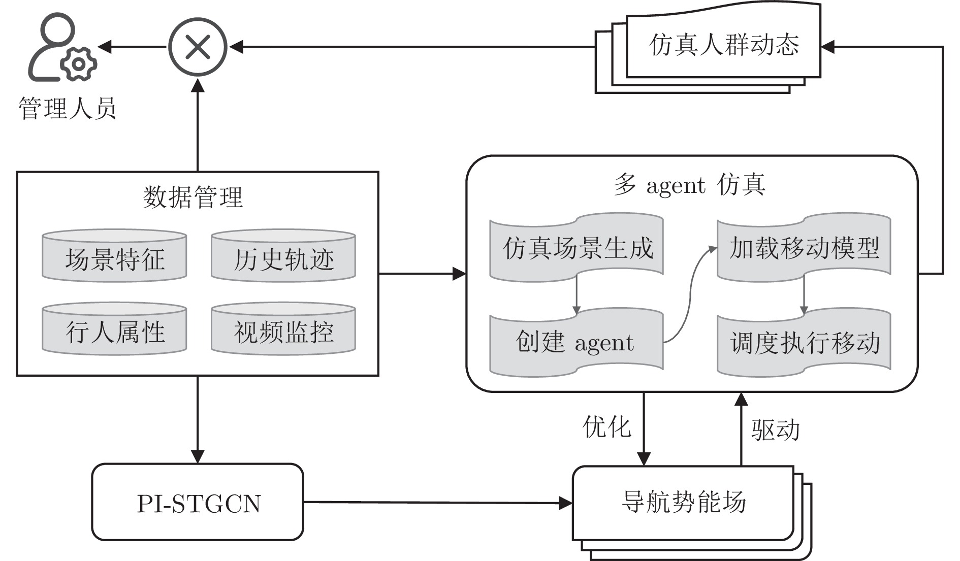 人群移动是影响城市公共安全及应急管理的重要因素, 如何对其进行高精度的建模仿真和有效干预是亟待解决的问题. 为此, 提出一种物理信息机器学习驱动的微观人群移动建模仿真与干预决策框架. 基于平行智能思想, 该框架构建“数据感知−融合建模−动态仿真−智能干预”四层闭环结构, 形成从建模仿真到策略生成、执行及反馈修正的完整链路. 针对人群的移动仿真与引导决策问题, 分别提出基于物理信息时空图卷积网络的导航势能场模型和物理信息多智能体深度确定性策略梯度算法, 有效解决了传统方法中模型准确性较差、仿真与干预孤立以及决策依赖人工经验的问题. 最后, 基于真实数据集开展仿真实验验证了所提框架的有效性.