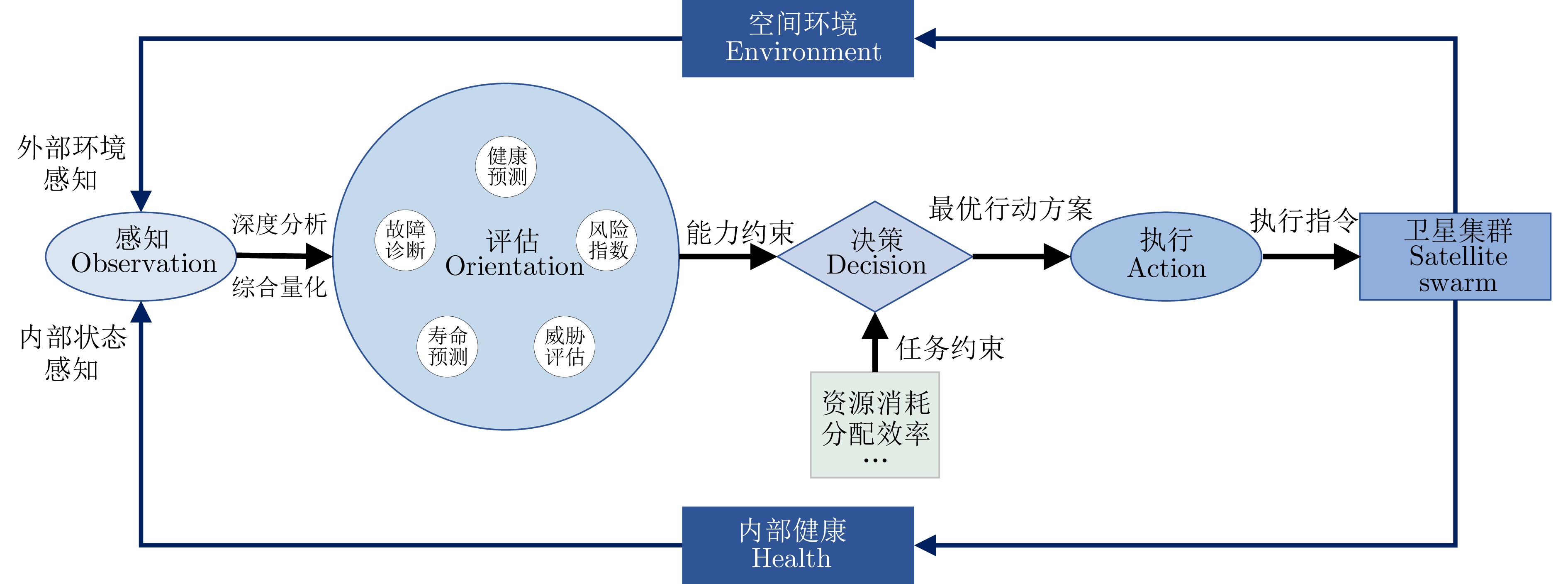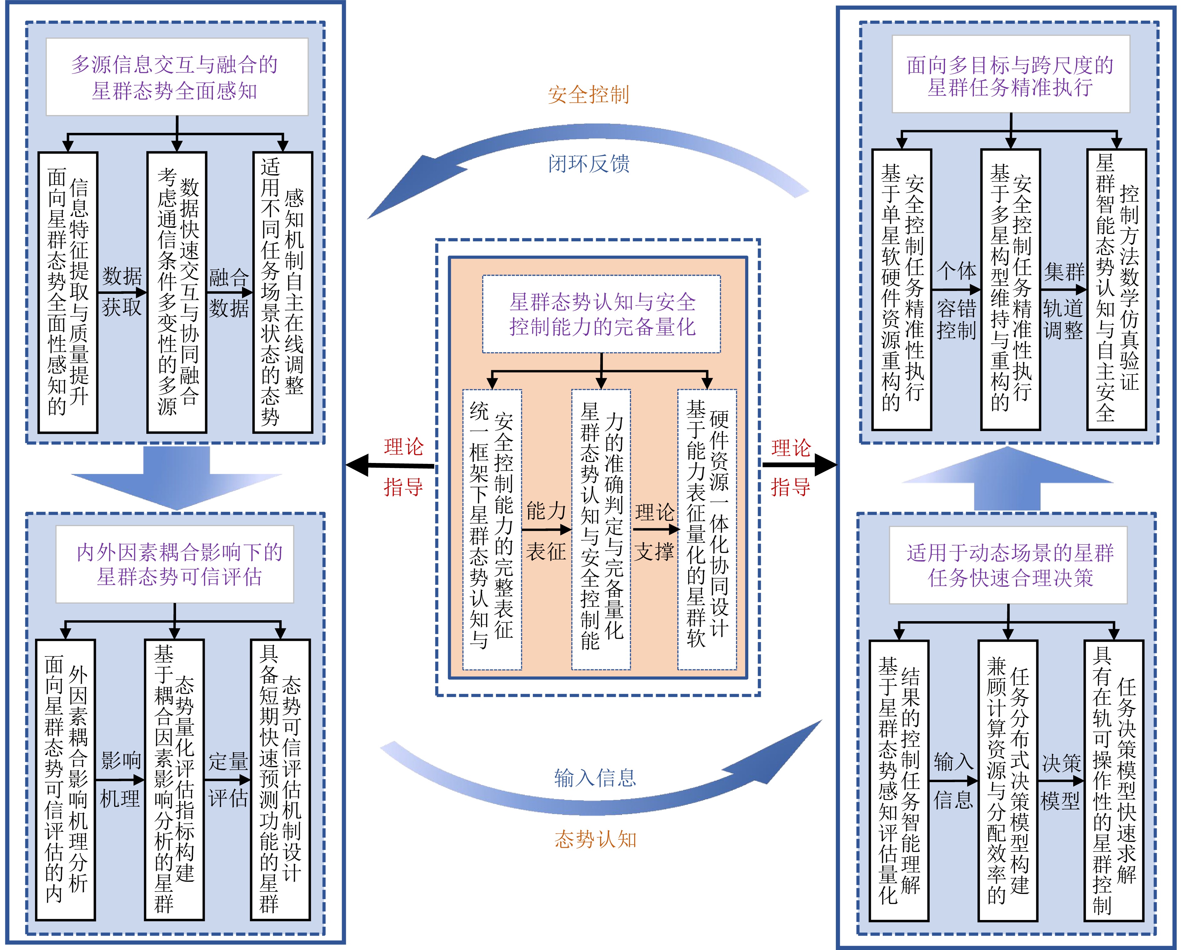 围绕下一代空间基础设施体系建设的重大战略需求, 针对复杂任务下卫星集群的态势认知与安全控制技术展开探讨. 首先, 分析国内外卫星集群的发展现状与面临挑战, 指出当前研究在理论体系完备性、感知信息全面性、评估可信度、决策合理性及执行精准性等方面存在不足. 其次, 重点阐述星群OODA体系架构, 分别探讨感知、评估、决策与执行各环节的关键技术与研究进展. 最后, 对星群态势认知与安全控制技术的未来发展进行展望, 提出需构建能力量化表征模型, 发展多源信息交互与融合的态势全面感知、内外因素耦合影响下的可信评估以及动态场景下的快速合理决策和多目标跨尺度任务的精准执行, 以提升星群自主安全运行能力, 为下一代空间基础设施建设提供理论和技术基础.