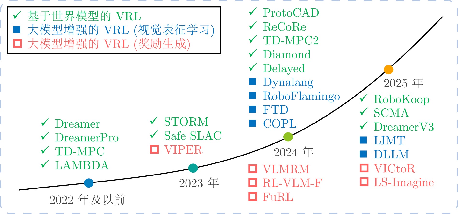 视觉作为强化学习智能体感知环境的主要途径, 能够提供丰富的细节信息, 从而支持智能体实现更复杂、精准的决策. 然而, 视觉数据的高维特性易导致信息冗余与样本效率低下, 成为强化学习应用中的关键挑战. 如何在有限交互数据中高效提取关键视觉表征, 提升智能体决策能力, 已成为当前研究热点. 为此, 系统梳理视觉强化学习方法, 依据核心思想与实现机制, 将其归纳为五类: 图像增强型、模型增强型、任务辅助型、知识迁移型以及离线视觉强化学习, 深入分析各类方法的研究进展及代表性工作的优势与局限. 同时, 综述DMControl、DMControl-GB、DCS和RL-ViGen四大主流基准平台, 总结视觉强化学习在机器人控制、自动驾驶以及多模态大模型等典型场景中的应用实践. 最后, 结合当前研究瓶颈, 探讨未来发展趋势与潜在研究方向, 以期为该领域提供清晰的技术脉络与研究参考.