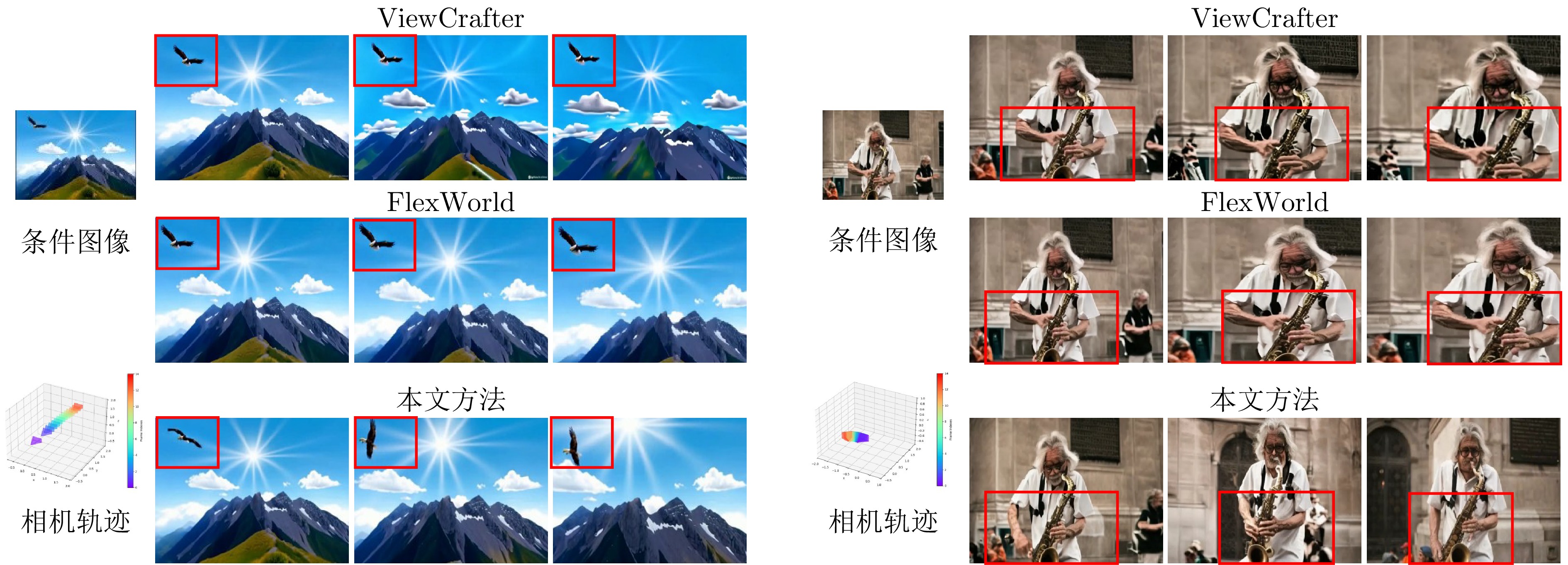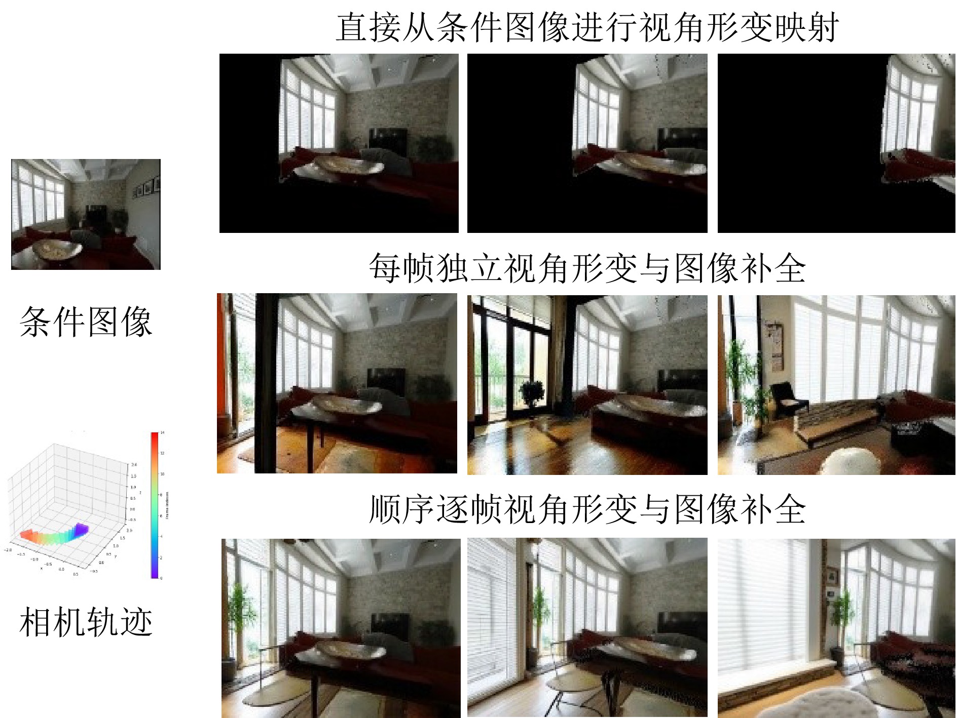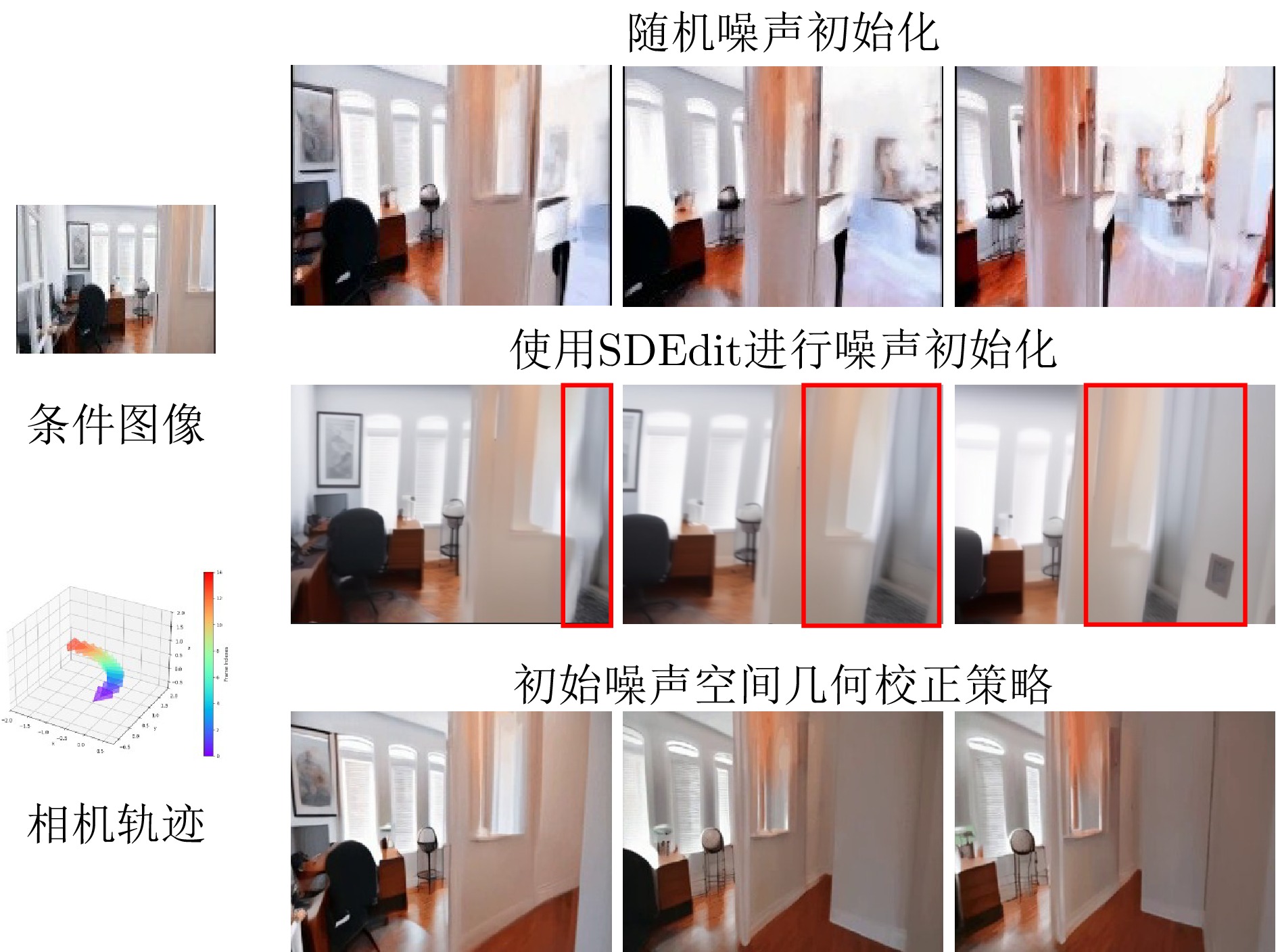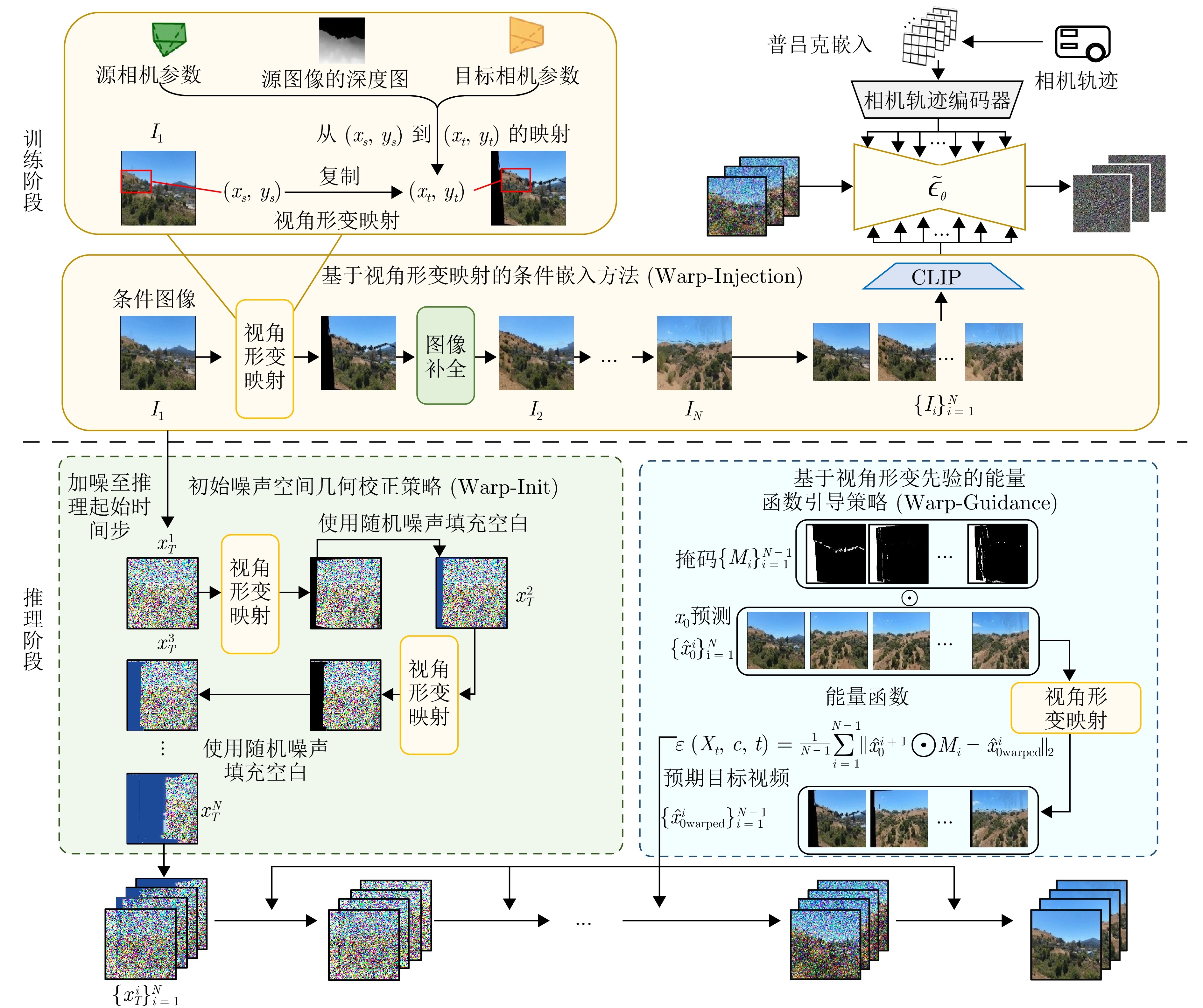 近年来, 视频扩散模型在相机可控的图像到视频生成任务中取得了突破性进展. 然而, 现有方法在维持3D空间结构一致性方面仍面临显著挑战, 其生成视频普遍存在空间结构模糊化、多视角下物体形态畸变等缺陷, 这些问题严重制约了生成视频的视觉可信度. 为解决这一问题, 提出在视频扩散模型的训练和推理阶段均引入额外的3D空间先验信息, 以增强生成视频的空间结构一致性. 具体而言, 在模型训练阶段, 设计基于视角形变映射的条件嵌入方法(Warp-Injection), 通过进行逐帧视角形变映射与图像补全构建具备高度空间一致性的参考帧序列, 并将其作为结构先验条件嵌入扩散模型的训练过程. 在推理阶段, 首先提出初始噪声空间几何校正策略(Warp-Init): 对条件图像加噪进行首帧初始化, 此后通过迭代式视角形变映射构建符合3D一致性约束的初始噪声序列. 在此基础上, 进一步在去噪过程中引入基于视角形变先验的能量函数引导策略(Warp-Guidance), 通过减小生成帧与视角形变映射后的预期目标视频之间的距离来实现对视频3D空间一致性的校正. 在标准RealEstate10K数据集上的实验结果表明, 相较于当前最优模型, 本文方法在FVD指标上取得18.03的显著优化, 同时将3D结构估计的失败率(COLMAP error rate) 降低至5.20%. 可视化分析进一步证明, 本文方法能有效维持生成视频的3D空间结构一致性.