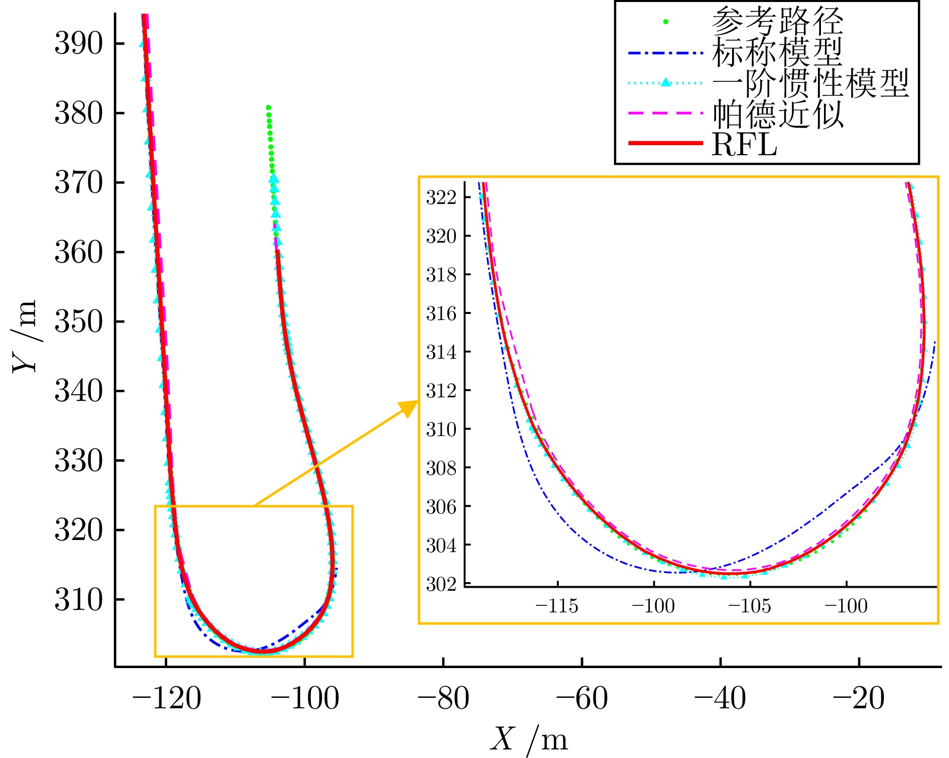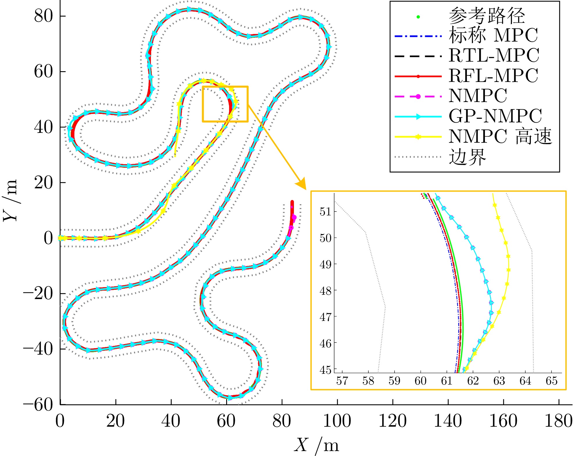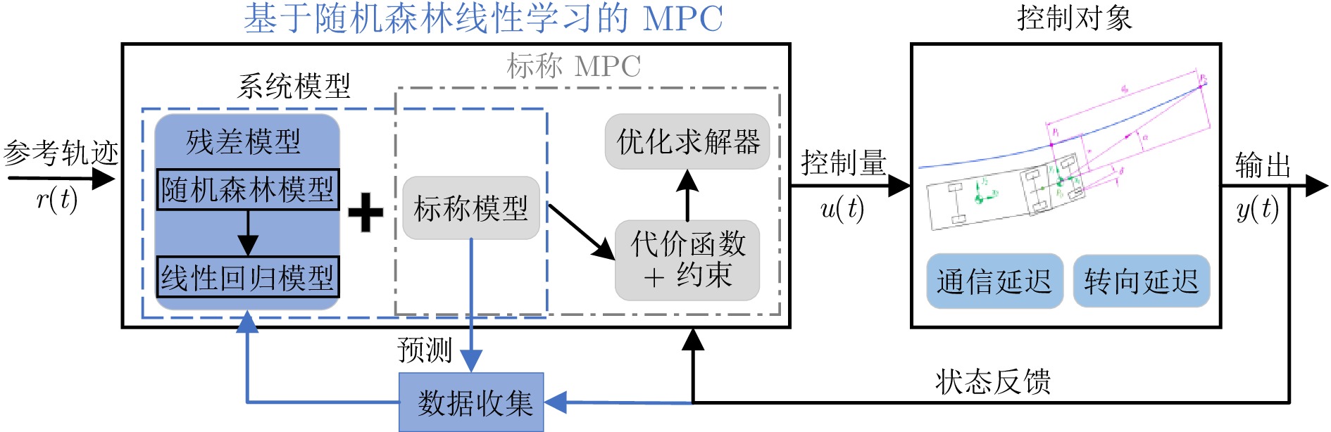 近年来, 模型预测控制(MPC)在自动驾驶领域大量应用, 但依然面临车辆动力学非线性建模、实时滚动优化等困难. 基于数据驱动建立车辆动力学模型的MPC通过收集系统的输入输出数据, 直接学习动力学模型, 但依然需要额外处理环节解决实时滚动优化问题. 为此, 提出一种基于随机森林学习车辆动力学模型的方法. 先将车辆动力学模型分解为标称模型和残差模型, 然后利用两层随机森林学习残差模型. 上层用于切换不同线性模型, 下层拟合叶子节点的线性模型. 由于标称模型和残差模型均为线性模型, 滚动优化可直接使用二次规划求解器实时求解. 同时, 基于随机森林的残差模型使用多帧历史状态作为特征输入, 学习得到的残差模型保留动力学系统动态响应的延迟特性, 因此可有效消解延迟影响. 仿真测试和实车实验结果表明, 提出的MPC的跟踪精度和实时性均优于标称MPC和基于高斯过程的MPC, 并对车辆执行机构延迟具有优良的适应性.