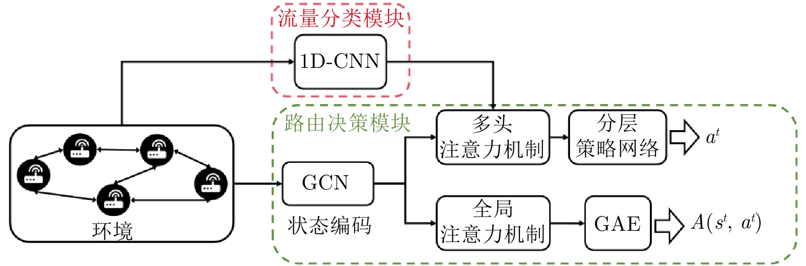路由是优化网络资源分配的重要方法. 然而, 传统路由算法依赖静态策略优化单一服务质量指标, 难以应对多类型流量爆发性增长下的差异化需求. 尽管深度强化学习为动态网络环境下的路由优化提供了新思路, 现有方法仍缺乏对流量类型的精细化感知能力, 无法灵活调整路由策略. 为此, 本文针对不同类型流量的差异化路由需求, 设计一种基于分层策略强化学习的流量感知路由算法. 首先, 引入流量分类模块, 实现对不同流量差异化业务需求的精细感知. 其次, 利用图卷积网络对网络拓扑进行高效建模, 并在此基础上设计分层决策网络以及差异化奖励函数, 引导智能体生成自适应路由决策, 实现对各流量类别路由策略的动态调整. 同时, 在演员-评论家框架中引入全局注意力机制, 增强智能体对网络状态时空依赖关系的建模能力, 并通过广义优势估计和近端策略优化算法提升训练的效率与稳定性. 最后, 在多种拓扑网络上验证了所提算法的有效性.