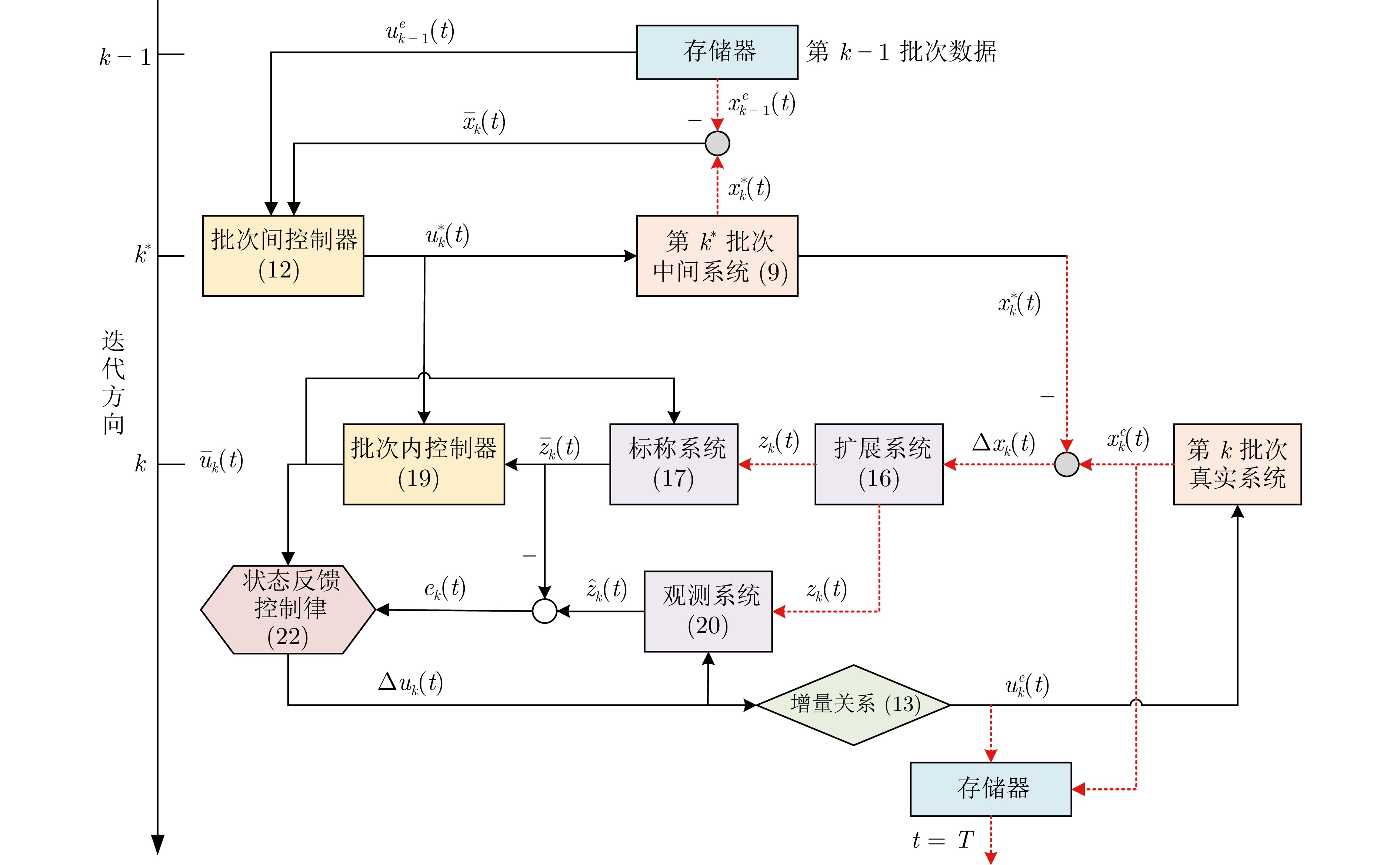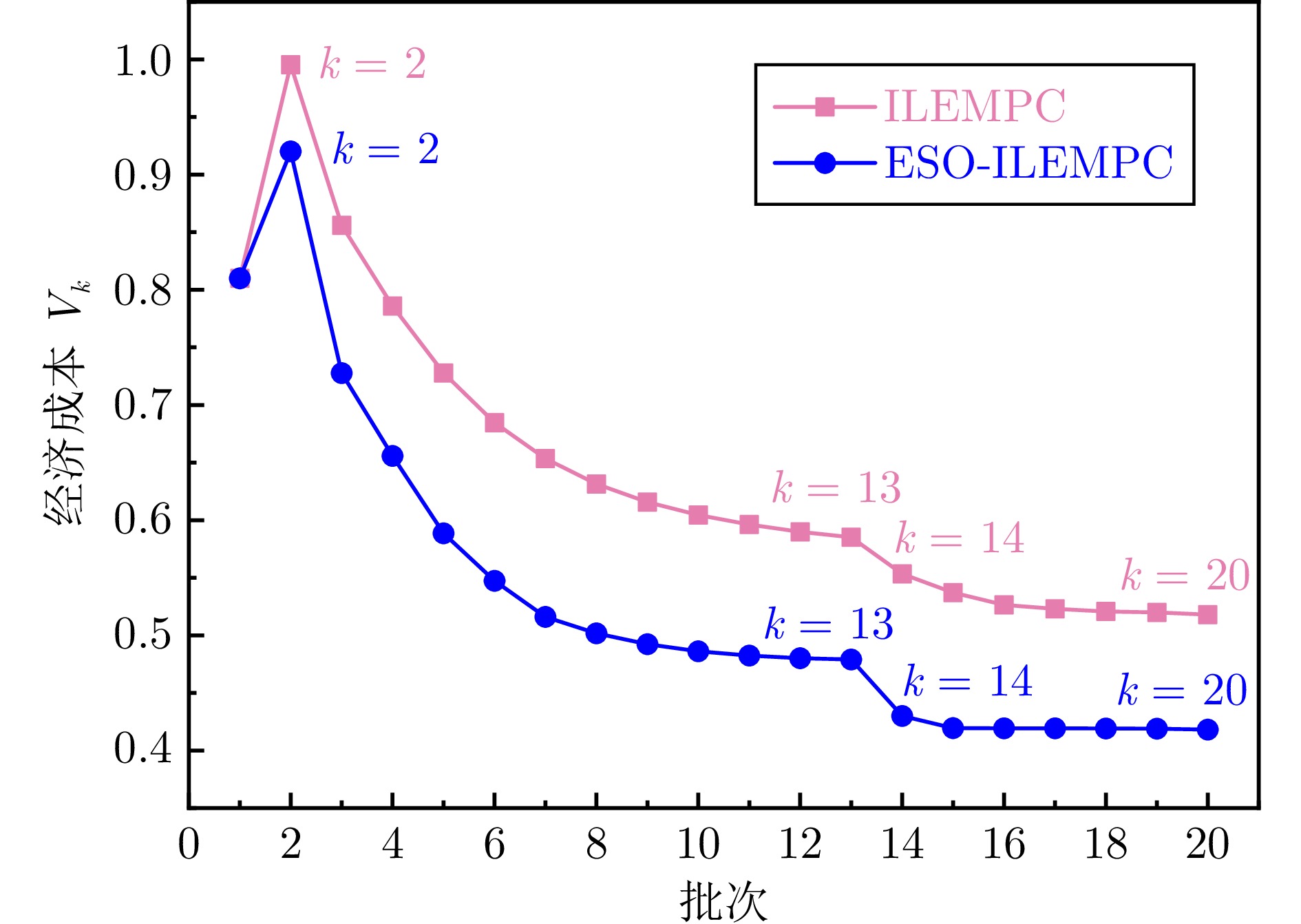 迭代学习模型预测控制作为一种重要的批次过程先进控制方法, 具备较强的学习能力和闭环性能. 传统的迭代学习模型预测控制算法能有效消除重复扰动影响, 同时对小范围实时扰动鲁棒性较强. 当被控系统存在较大实时干扰时, 经济性能和系统稳定性通常难以保障. 对此, 提出一种面向非重复扰动的自适应迭代学习经济模型预测控制策略, 沿迭代方向和时间方向对系统动态进行分解, 将系统扰动拆分为重复部分和非重复部分, 分别建立批次间和批次内的动态经济优化问题. 批次间执行基于迭代学习控制的离线经济优化, 消除重复扰动影响; 批次内引入扩展状态观测器对非重复扰动进行估计, 基于批次间优化结果在线实施经济模型预测控制, 在抑制实时扰动的同时提高系统动态经济性. 论文结合观测器稳定性分析方法, 对所提自适应迭代学习经济模型预测控制策略的稳定性进行理论证明, 并通过间歇反应器仿真实验对算法实施有效性进行验证.
