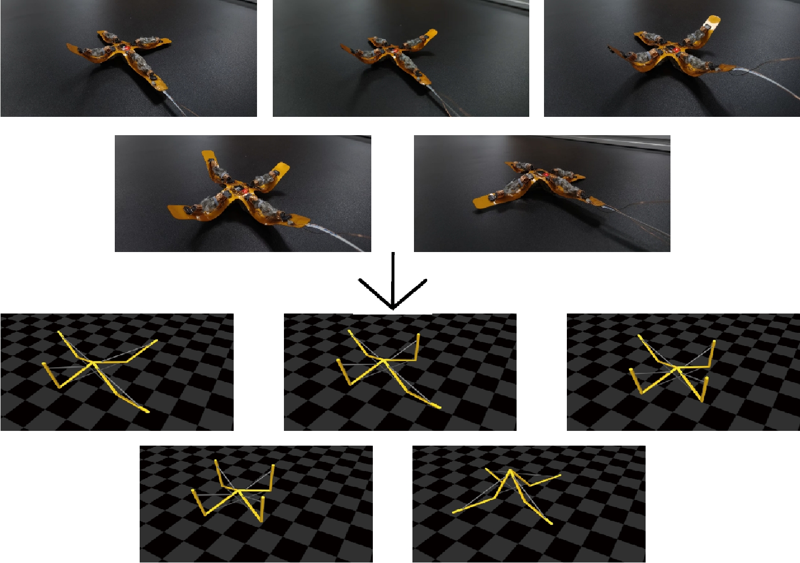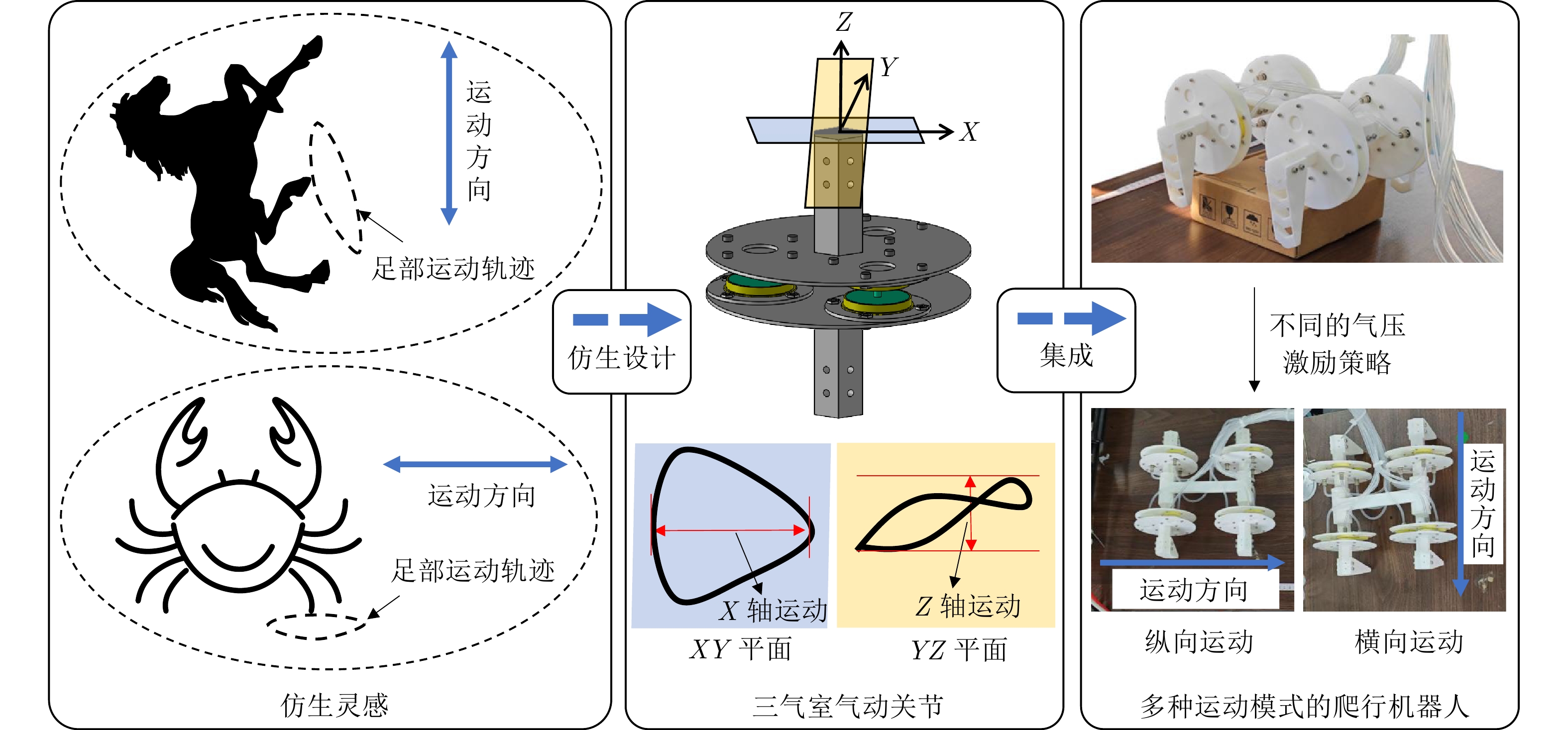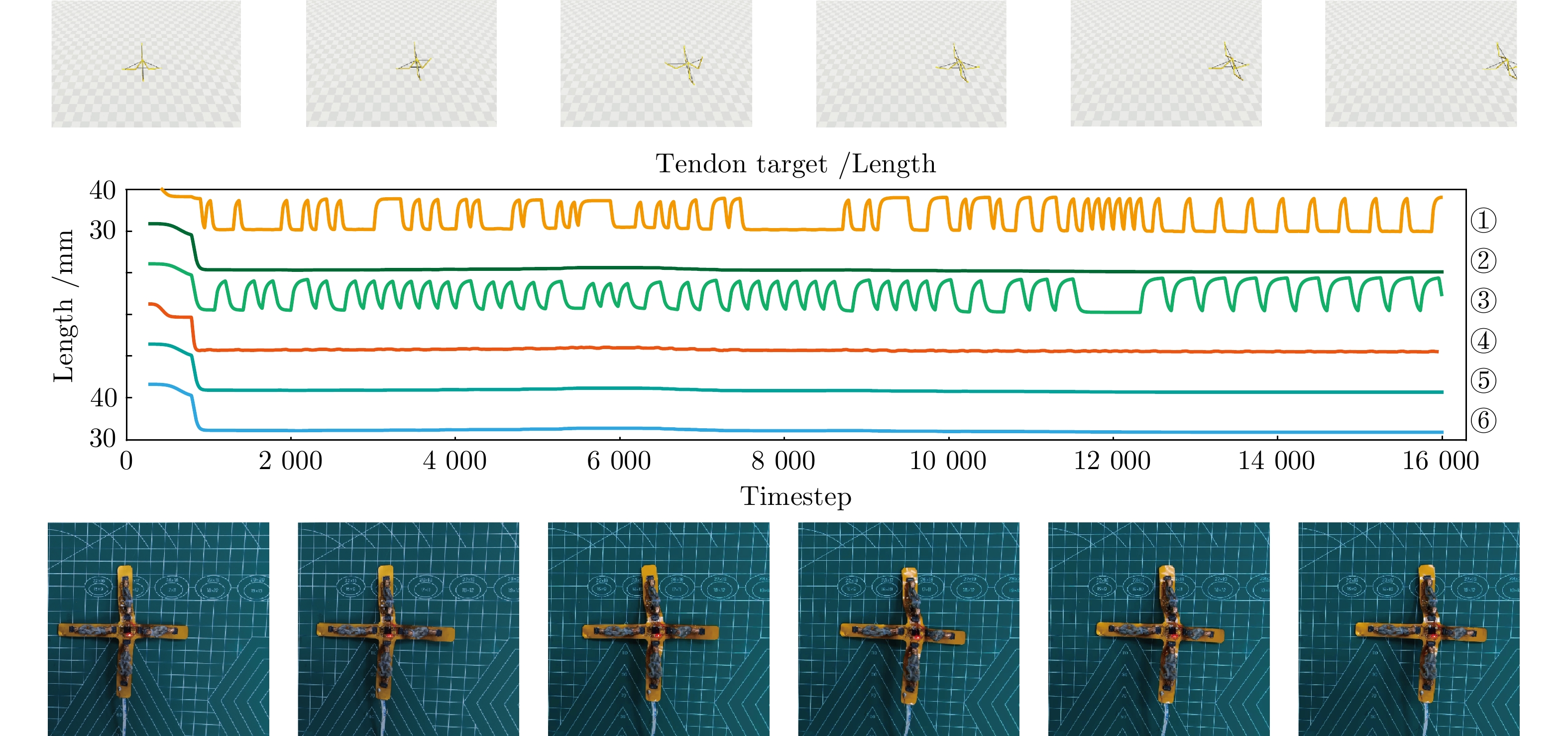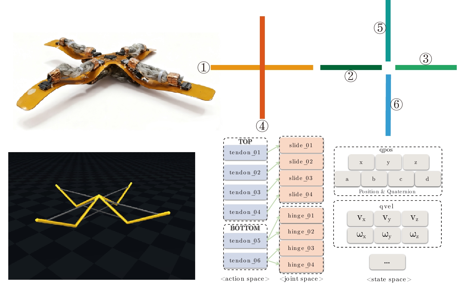 形态智能通常指机器人利用“身体”的物理特性、几何结构以及动力学特征等简化复杂的计算(如控制器设计), 具备良好环境适应性的特点, 是实现具身智能的核心机制. 本文针对六杆张拉整体完全折叠问题, 提出一种利用形态智能机理简化控制方法, 实现部分绳驱下机器人整体的等效折叠. 首先基于“端点聚拢”形态构造折叠目标, 通过结构对称性分析得到四种折叠模式及对应的绳长变化量. 再通过图论回路空间分析, 识别由几何构型产生的冗余绳长变化量, 基于此确定折叠过程中的被控绳. 然后在静力学框架下建立电机输入与绳长变化映射关系并给出可达性判据, 以此得到每种模式下简化控制策略. 最后通过MATLAB准静态仿真及实物实验, 验证了所提方法的有效性. 四种折叠模式下的简化控制策略均能实现机器人完全折叠, 驱动绳的数量可由传统方法的24降低至9. 展现了形态智能在简化机器人控制器设计方面的潜力.