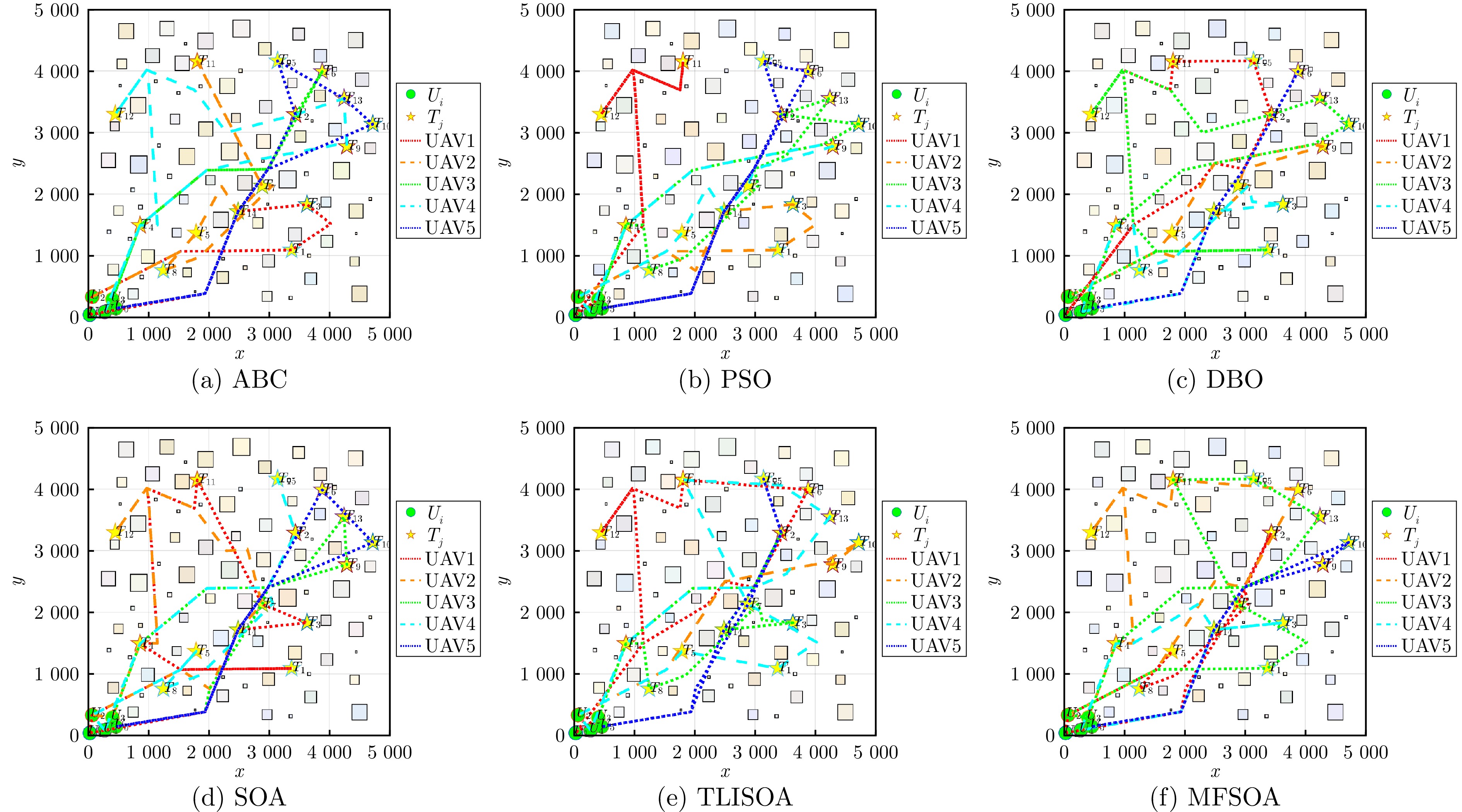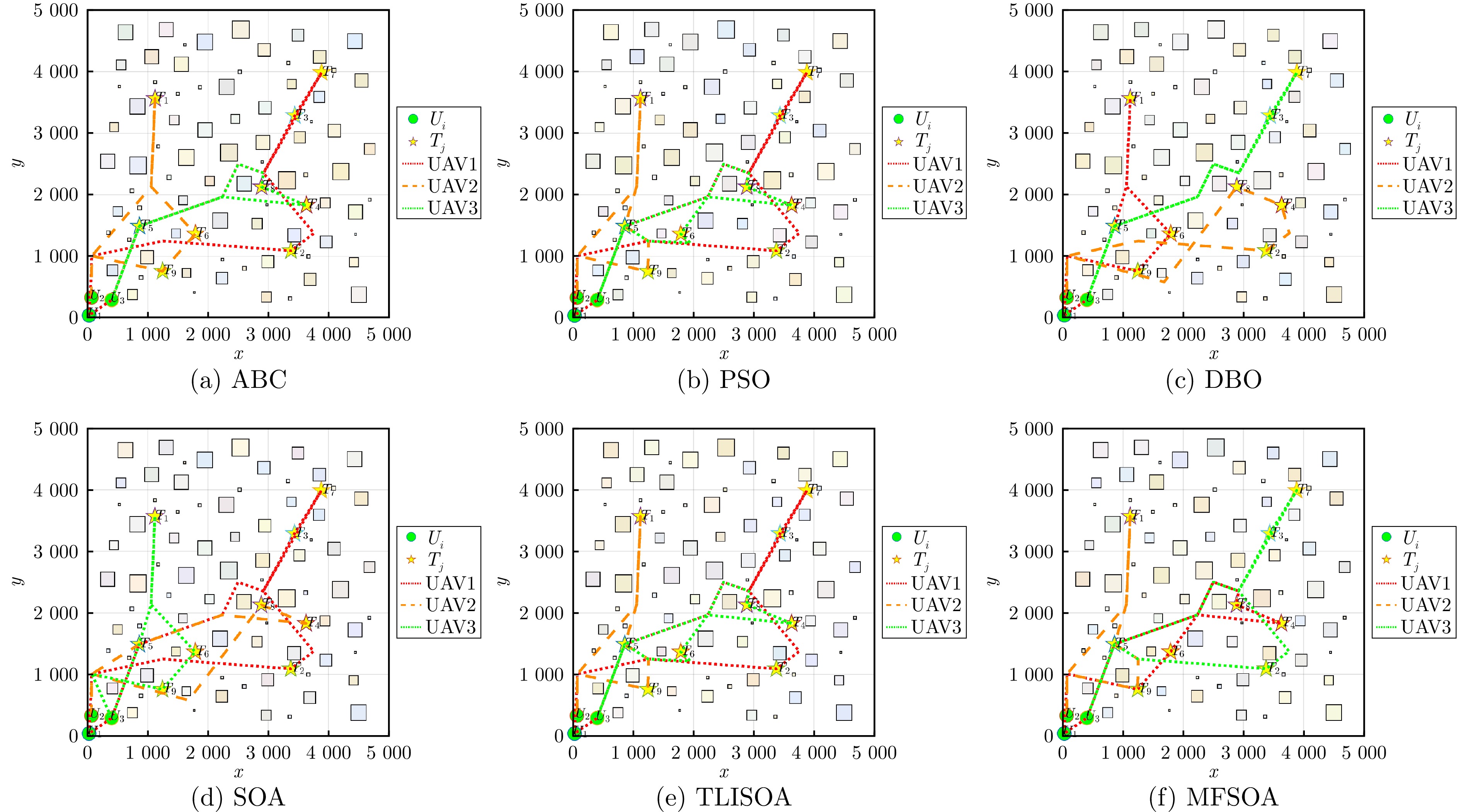 针对多无人机在多重约束下的协同任务分配问题, 提出一种面向多无人机协同任务分配的多策略融合海鸥优化算法(MFSOA). 该算法由时间代价、能耗代价、负载均衡、任务时序及多约束条件构建多无人机协同任务分配目标优化模型. 为提升算法寻优效率, 采用Tent混沌映射增强种群多样性, 结合精英进化策略优化迭代过程中的种群质量; 通过设计多方向自适应迁徙策略增强算法全局寻优能力, 避免算法陷入局部最优; 构建基于精英个体的攻击策略平衡算法的全局探索与局部开发能力, 提升算法的寻优稳定性. 实验结果表明, MFSOA在多场景下均表现出优异的综合性能, 其寻优能力相较对比算法提升约3%~13%, 验证了该算法求解多无人机协同任务分配问题的有效性与可靠性.