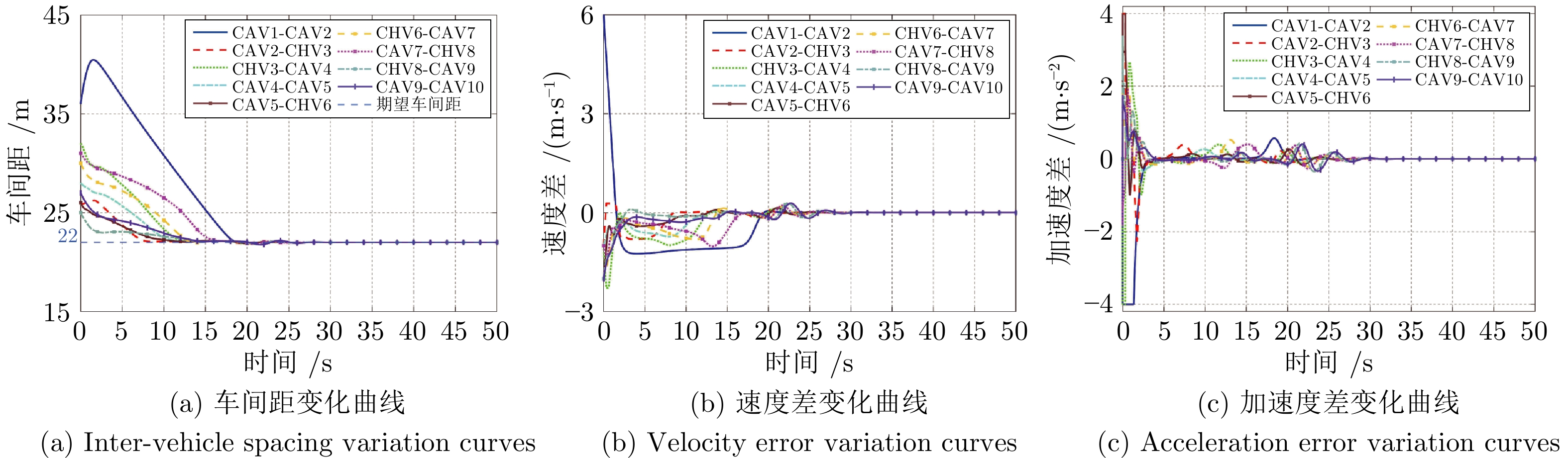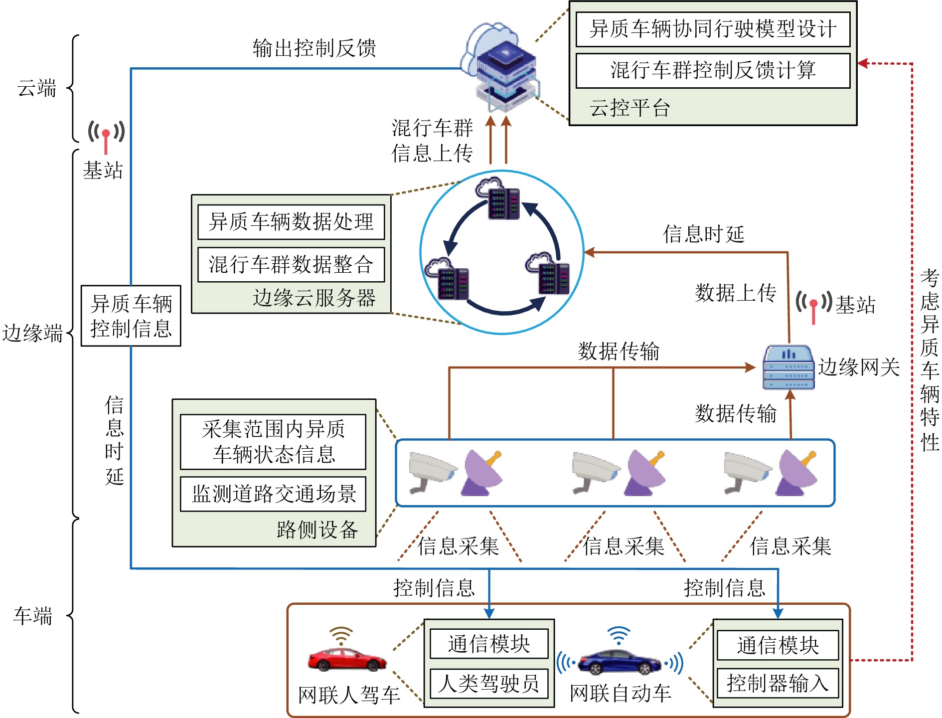 随着车联网技术的进步, 由网联人驾车与网联自动车组成的混行车群规模正逐渐增大, 导致混行车群间的协同与交互难度增加, 进而影响混行车群行驶状态的一致性. 为解决此问题, 提出一种云−边−端协同下考虑多车影响的混行车群集中式协同控制方法. 首先, 为有效处理和分析较大规模混行车群产生的海量异构数据, 设计混合交通场景下云−边−端协同架构. 然后, 考虑网联人驾车前方两辆车及紧邻后车状态的影响, 以及网联自动车前方所有车辆及紧邻后车状态的影响, 分别在云控平台建立基于分子动力学的网联自动车和固定权重的网联人驾车协同行驶模型. 再者, 根据混行车群间动态影响关系, 设计基于云−边−端协同架构的混行车群集中式协同控制方法, 并利用稳定性和串稳定性理论获得混行车群协同行驶一致性条件. 最后, 通过对比仿真实验验证了所提方法的有效性.