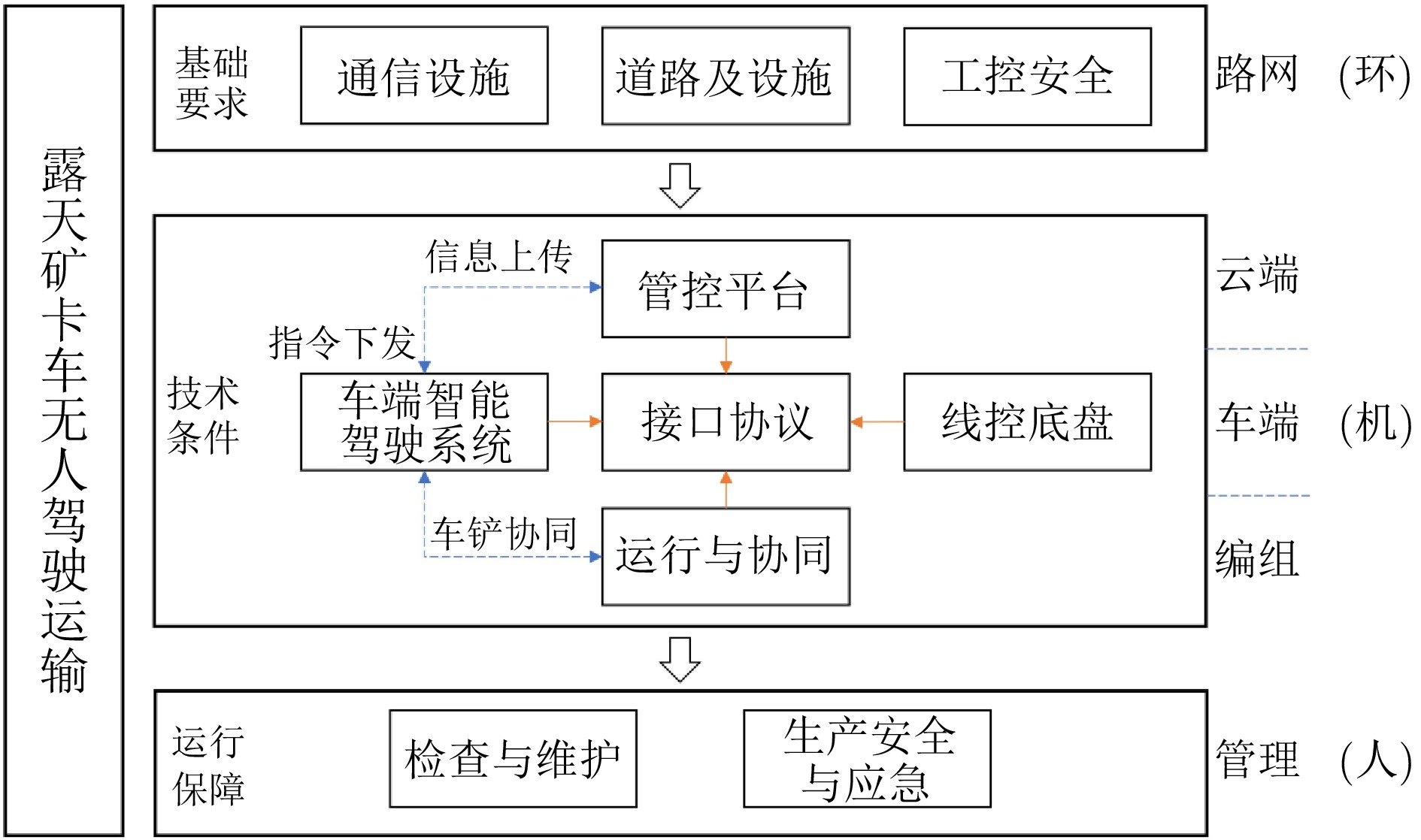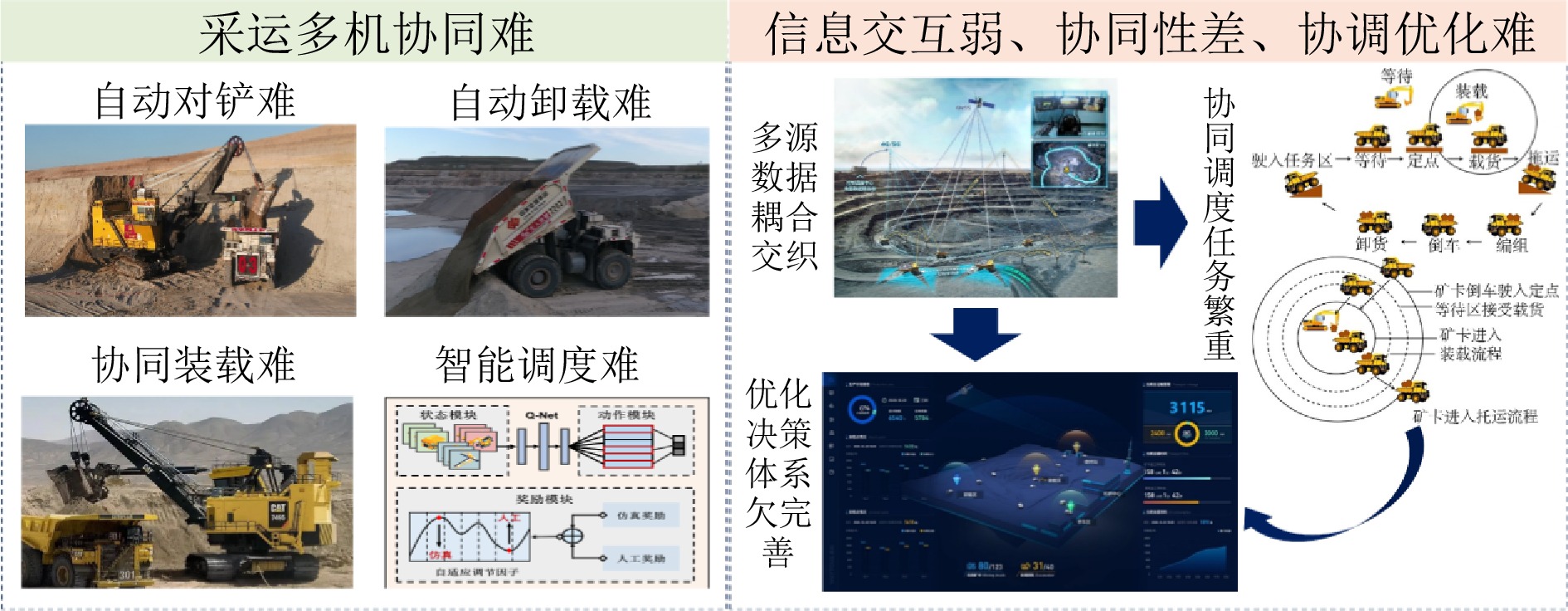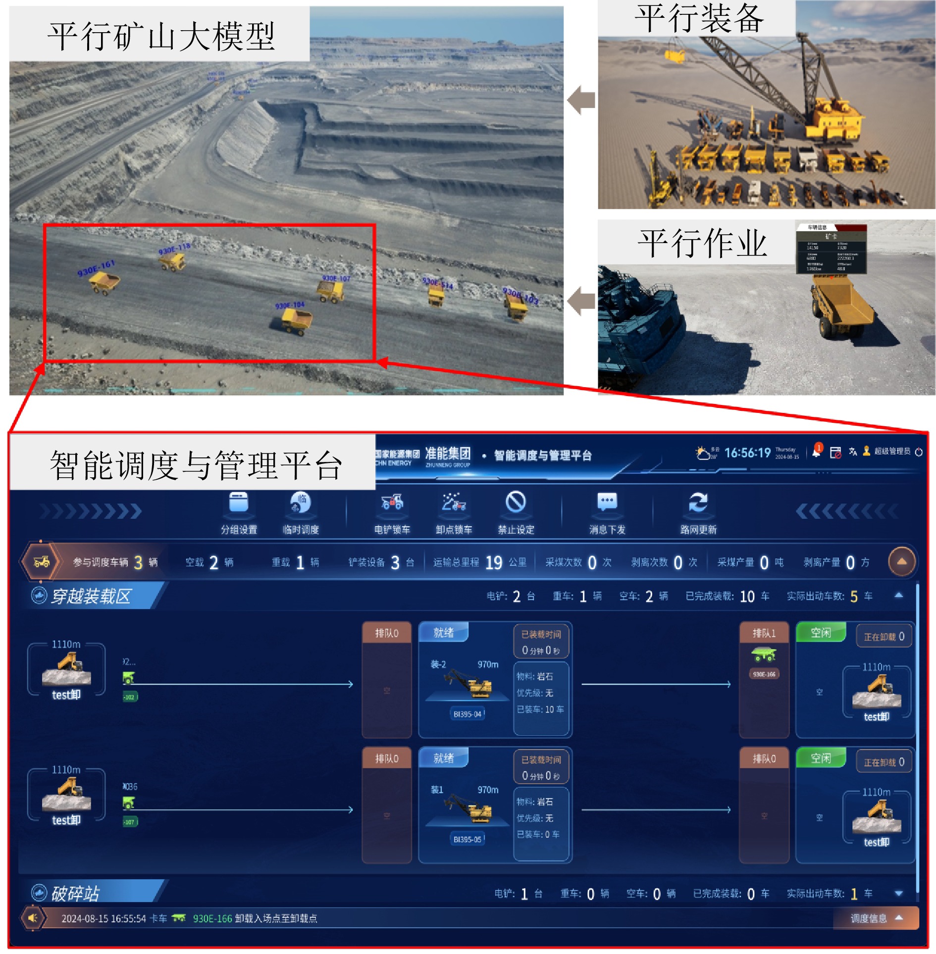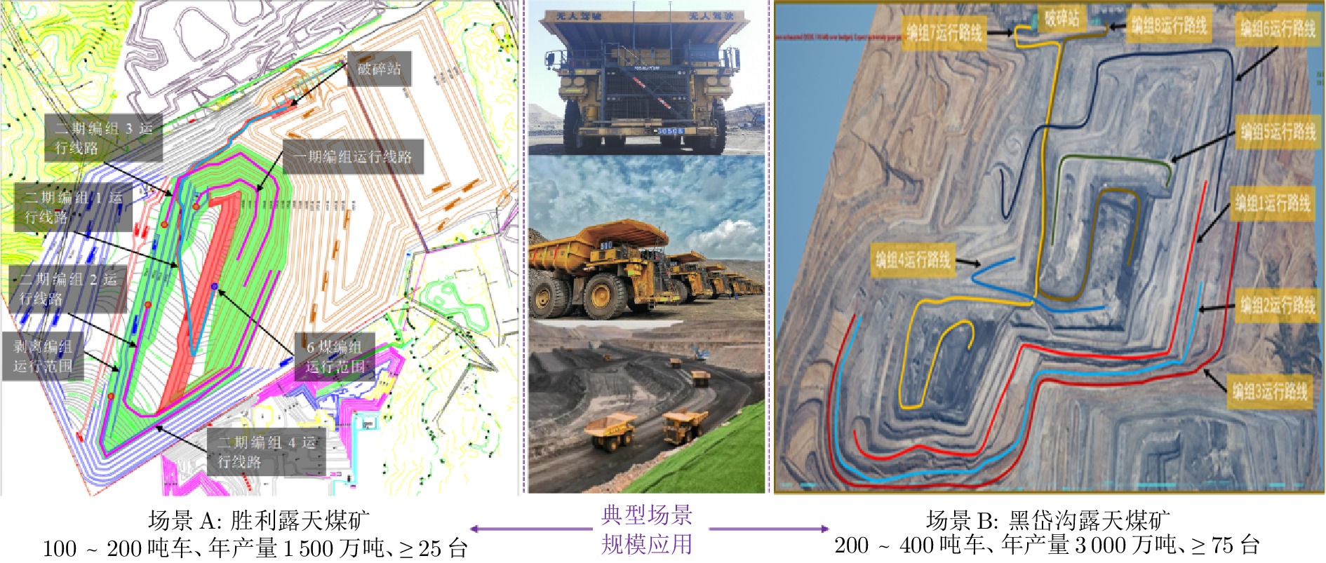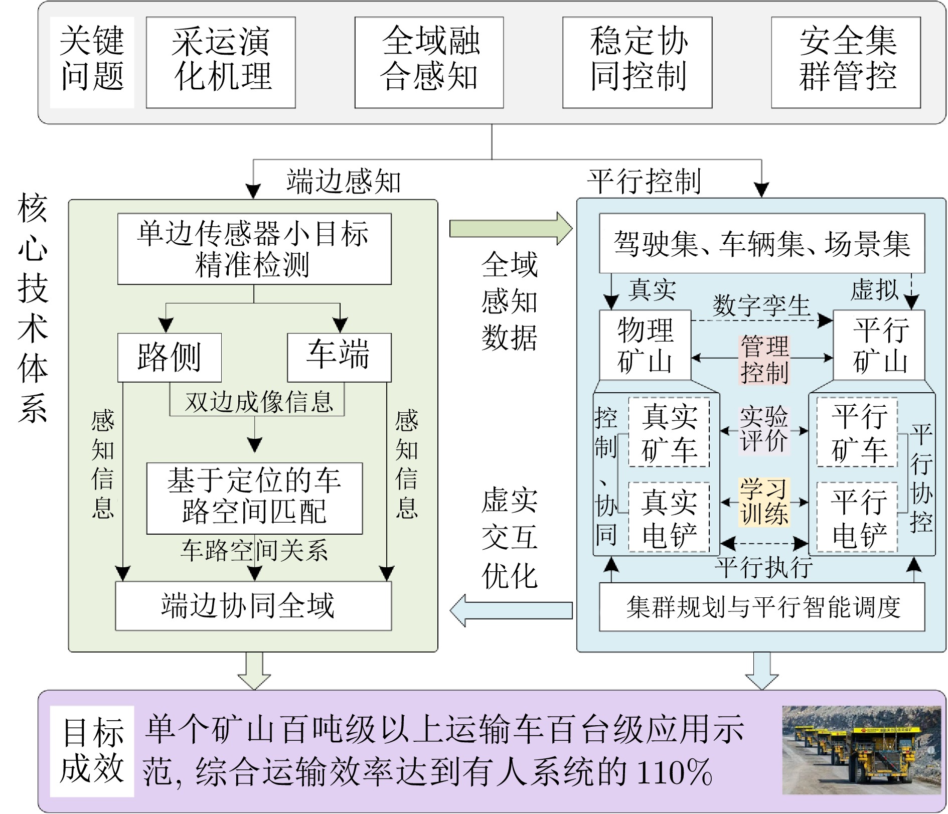 露天矿机器人化开采面临复杂环境数据不足、极端工况测试难、现场试验风险高、动态感知建模复杂及实验周期长等挑战. 为此, 提出基于“端边感知、平行控制”的露天矿机器人化采运智慧生产模式, 从车辆感控、车铲协同、集群调度与工程示范等多层面入手, 系统地突破提效开采机理、高精度全域感知、稳定协同控制与可靠群体管控等核心科学问题. 通过技术集成与工艺优化, 实现百吨级以上无人驾驶运输车的规模化运行, 形成我国露天煤矿高水平智能化的“双十” (10项创新技术、10项标准)、“双百” (100台车示范, 运输效率达有人系统110%)、“双千” (千台车监控平台、千小时无故障运行)中国方案, 有力支撑了我国矿山智能化绿色开采发展战略.