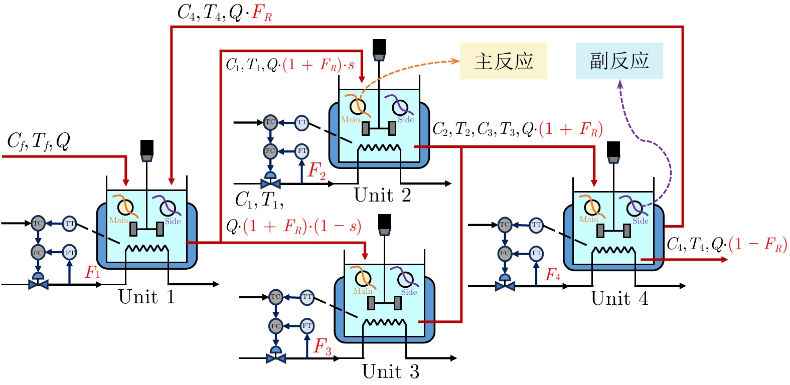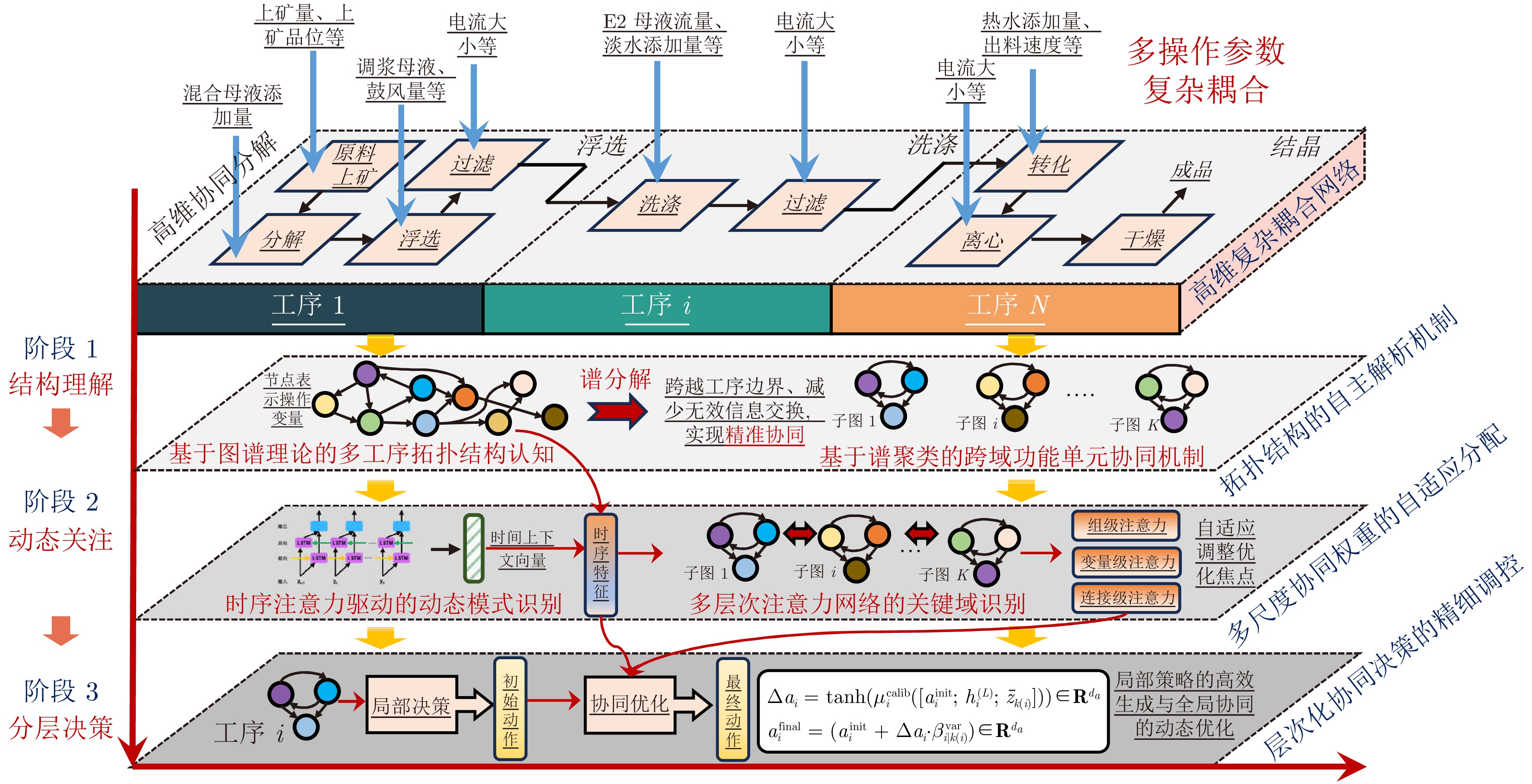 流程工业普遍存在多操作参数强耦合、工艺拓扑复杂及多工序协同困难等问题, 传统局部优化方法难以实现全局最优运行. 针对上述挑战, 提出一种基于图谱理论的流程拓扑结构感知的多智能体强化学习协同优化方法, 以实现复杂拓扑流程工业的多操作参数协同优化. 首先, 构建基于拉普拉斯谱分析的拓扑结构解析框架, 刻画多操作参数间的耦合关系, 为智能体任务分配与协同决策提供支撑; 随后, 设计融合长短期记忆网络与多头注意机制的时序感知模块, 提取历史状态轨迹中的关键时间依赖特征; 进一步, 引入多层次空间注意力机制, 在组织层、变量层及连续控制域实现优化关注度的动态自适应调节; 在此基础上, 构建局部−全局协同的分层强化学习决策架构, 实现多智能体协调控制与策略优化. 基于连续搅拌釜反应器系统及盐湖化工典型流程工业数据开展仿真实验, 验证了所提方法的有效性. 实验结果表明, 该方法较传统方法性能提升41.2%, 在收敛速度与策略稳定性方面表现更优, 为流程工业多操作参数协同优化提供新的技术路径.