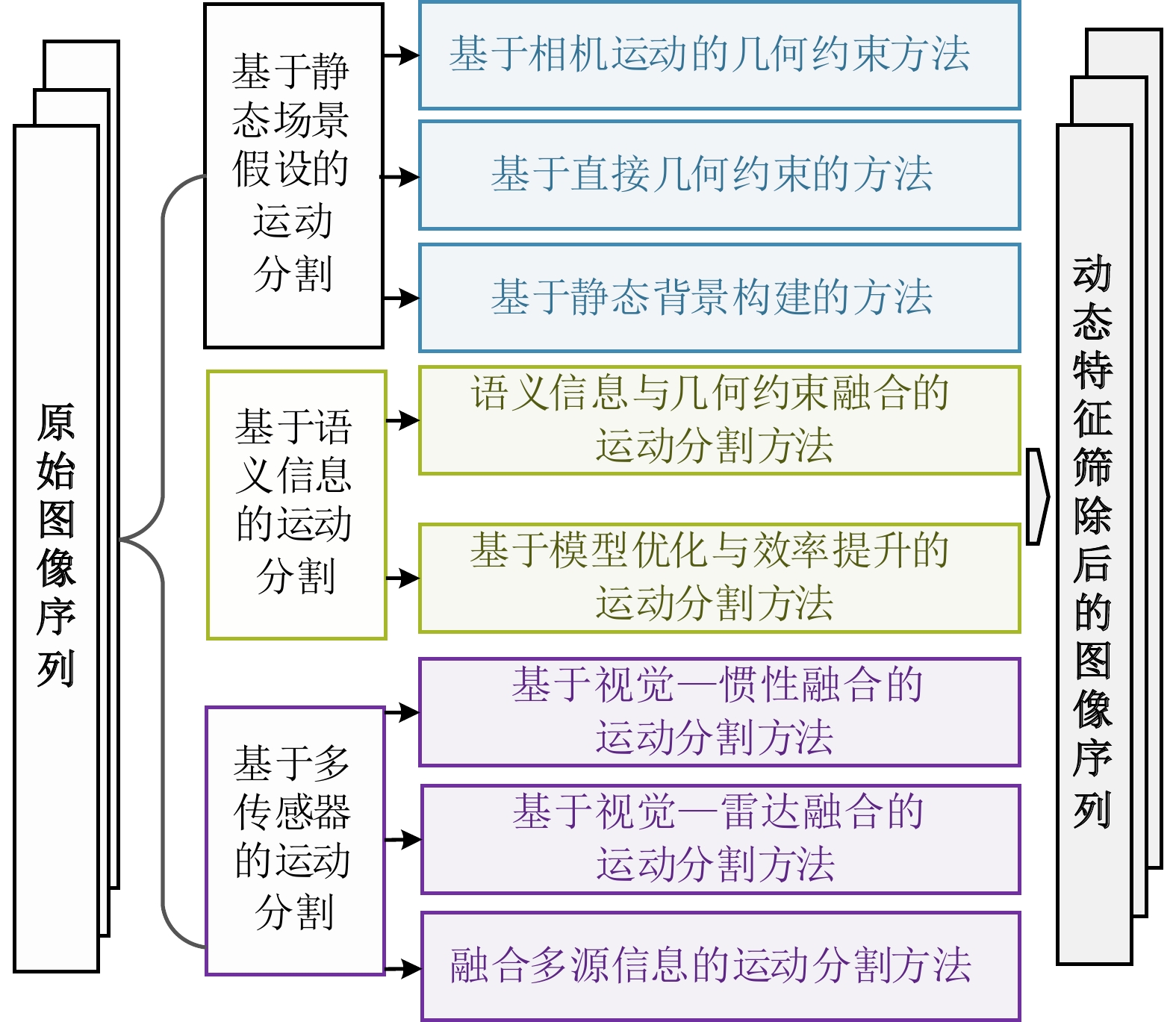作为移动机器人与自动驾驶领域的关键基础技术, 视觉同时定位与地图构建(V-SLAM)在动态环境中面临严峻挑战. 由动态物体引起的特征匹配错误常常导致定位偏差、地图失真以及系统鲁棒性受损. 运动分割技术是提高V-SLAM性能的重要手段, 但在复杂动态场景中准确区分静态和动态元素仍极具挑战性. 本文系统梳理V-SLAM运动分割研究进展, 根据对环境的潜在假设, 将现有方法分为三个主要研究范式, 并给出各范式的技术原理, 代表性策略的核心优势、本质局限及适用边界. 最后展望未来的研究方向.