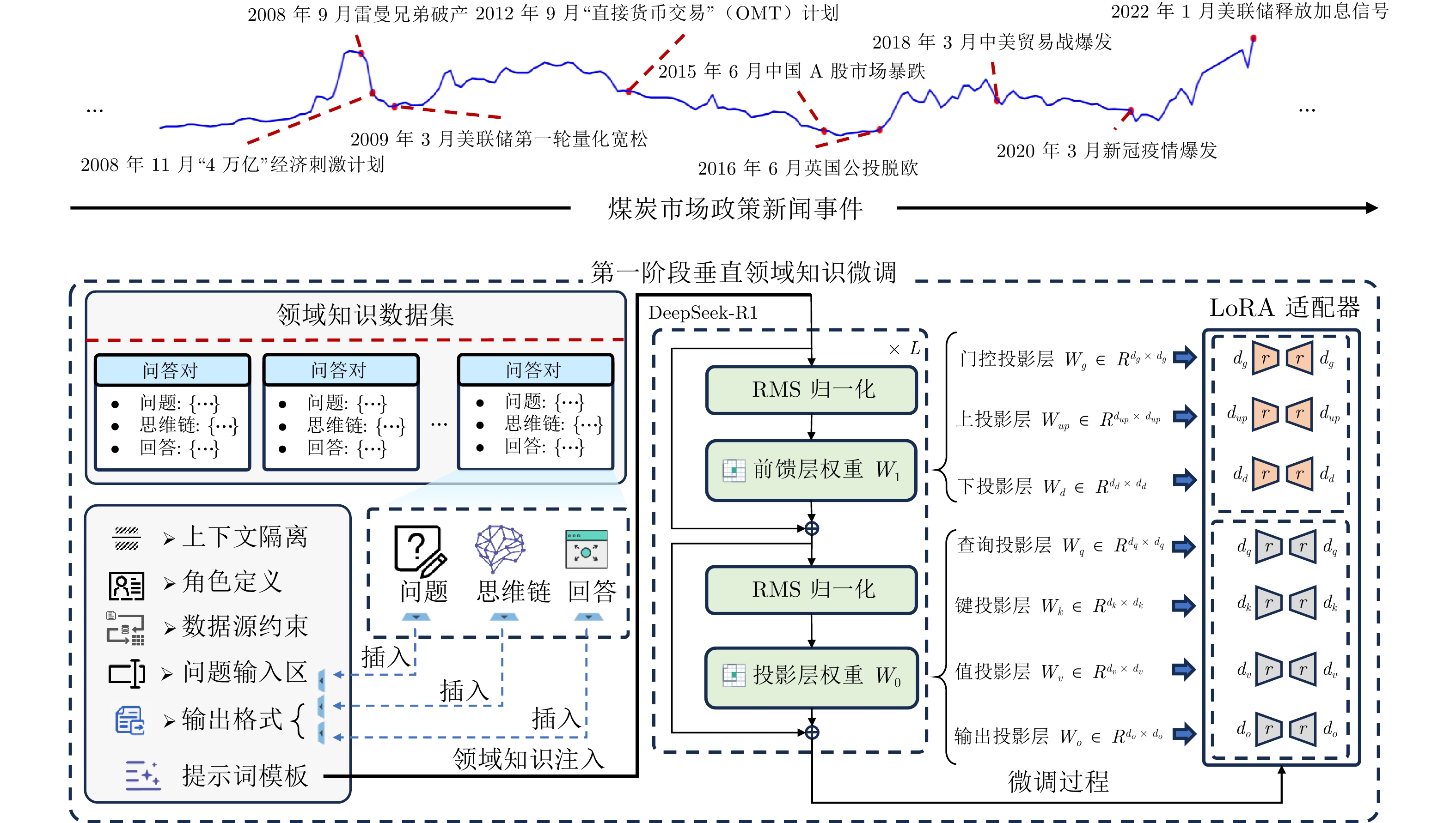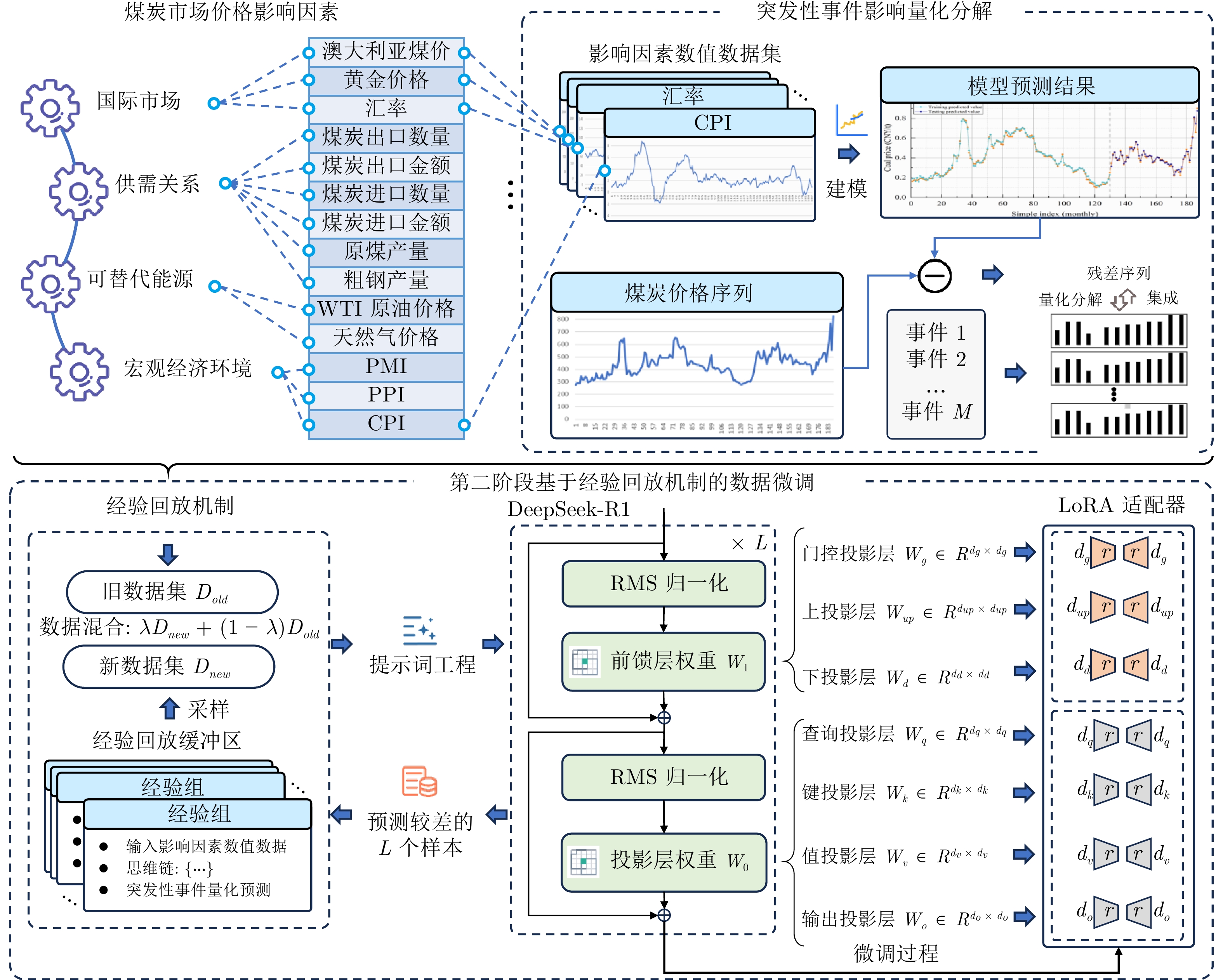 能源是现代工业运行的核心要素, 其价格波动对工业企业的成本结构和竞争力具有显著影响. 然而, 受政策变化和地缘冲突等突发事件影响, 工业能源价格呈现高频波动特征, 难以实现精准预测. 此外, 现有深度学习方法在事件量化、动态响应及可解释性方面存在不足, 导致预测结果的不确定性显著增加. 为此, 提出一种基于大模型量化突发事件影响的工业能源价格预测方法. 首先, 为实现突发事件的量化表征与显式推理路径提取, 构建领域知识微调与结构化数据微调的两阶段协同机制, 设计事件冲击函数驱动的多尺度事件解析器, 并结合注意力机制自适应调整衰减速率, 将事件影响分解为短期冲击、中期传导与长期趋势. 其次, 为统一事件量化与价格预测过程, 将量化结果作为外部输入增强模型响应能力, 并输入门控循环神经网络实现价格预测. 最后, 在秦皇岛港煤炭月度价格和布伦特原油月度价格两个真实工业数据集上开展系统实验, 验证了所提方法的有效性, 并进一步分析大模型推理文本对预测性能的贡献机制.