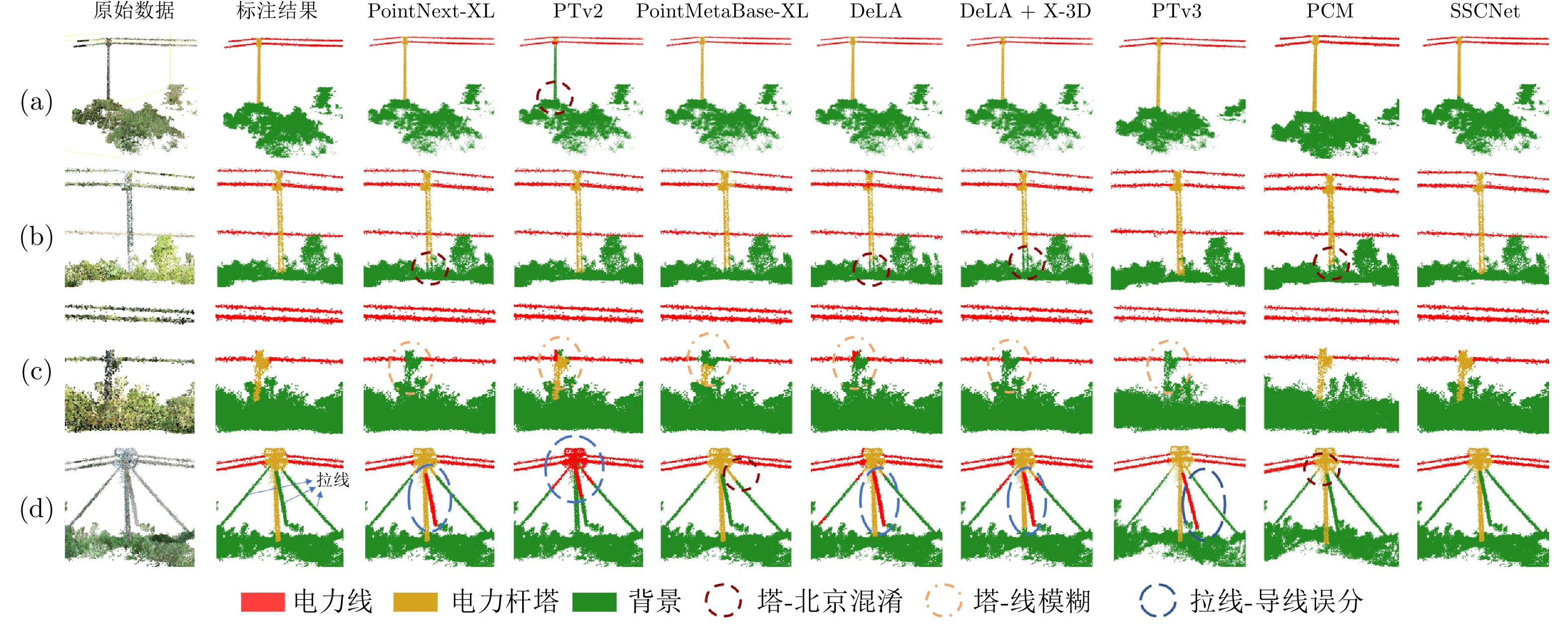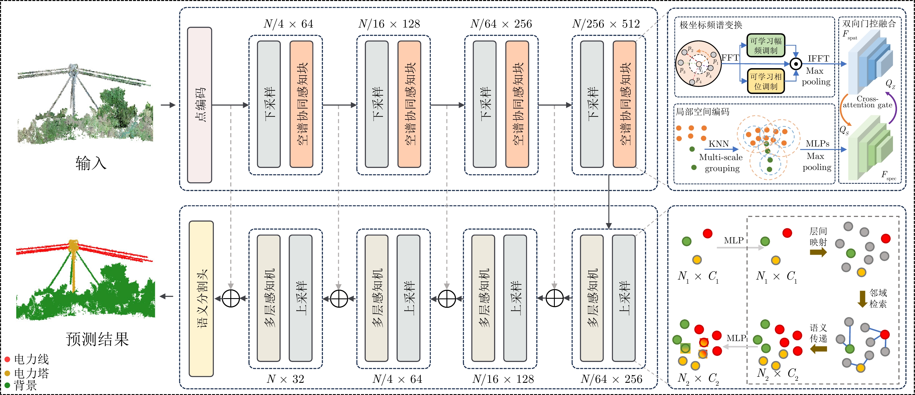配电网点云语义分割对于实现无人化巡检与智能电网运维具有重要意义. 尽管已有方法在空间建模与结构增强方面取得了一定进展, 但在频谱特征挖掘与大规模点云处理效率上仍面临突出挑战. 为此, 本文提出一种结构频谱感知框架(Structure Spectrum-Aware Framework, SSAF), 以提升长距离配网场景下的点云表达能力. 在数据预处理阶段, 提出了一种结合结构引导的层级点云去噪策略与结构感知的样本划分方法, 在压缩冗余背景点云的同时, 有效保持杆塔、导线等关键目标的结构完整性与连续性. 在语义分割阶段, 构建空谱协同语义分割网络(Spatial-Spectral Collaborative Semantic Segmentation Network, SSCNet), 引入局部极坐标系以增强方向敏感特征的建模能力, 并设计基于注意力图的动态融合机制, 实现空间特征与频谱特征之间的自适应交互与信息增强. 实验结果表明, SSAF能在真实配电网场景点云数据集上实现更高的分割精度与推理效率, 在多个关键指标上显著优于现有主流方法, 验证了其在复杂场景下的实用性与工程潜力.