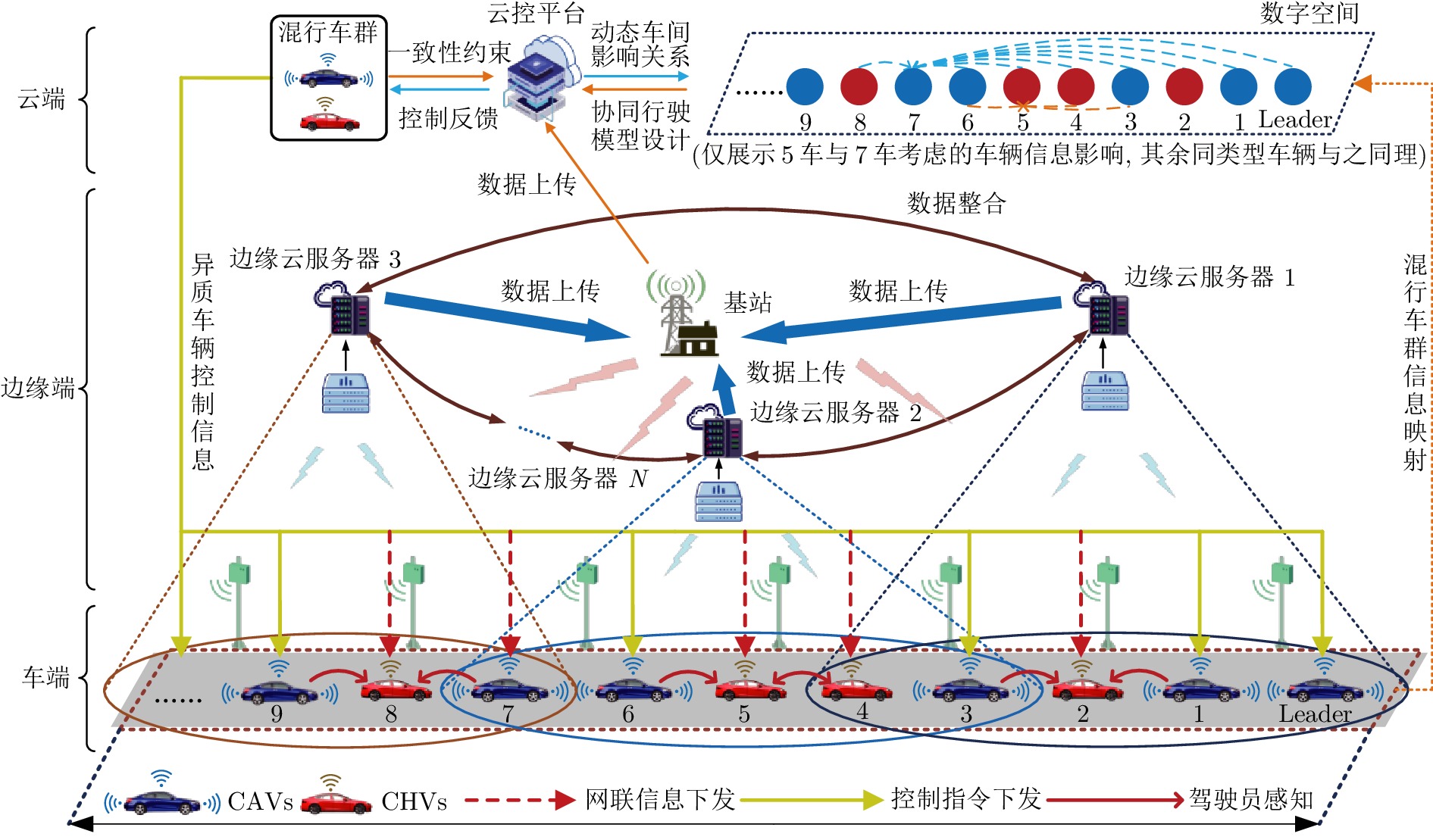 随着车联网技术的进步, 由网联人驾车与网联自动车组成的混行车群规模正逐渐增大, 导致混行车群间的协同与交互难度增加, 进而影响混行车群行驶状态的一致性. 为解决此问题, 提出一种云−边−端协同下考虑多车影响的混行车群集中式协同控制方法, 以提高混行车群协同行驶效率. 首先, 为有效处理和分析较大规模混行车群产生的海量异构信息数据, 设计混合交通场景下云−边−端协同架构. 然后, 考虑网联人驾车前方两辆车及紧邻后车状态信息的影响, 以及网联自动车前方所有车辆及紧邻后车状态信息的影响, 分别在云控平台建立基于分子动力学的网联自动车和固定权重的网联人驾车协同行驶模型. 再者, 根据混行车群间动态信息影响关系, 设计基于云−边−端协同架构的混行车群集中式协同控制方法, 并利用稳定性和串稳定性理论获得混行车群协同行驶一致性条件. 最后, 通过对比仿真实验验证了本文所提控制方法的有效性.