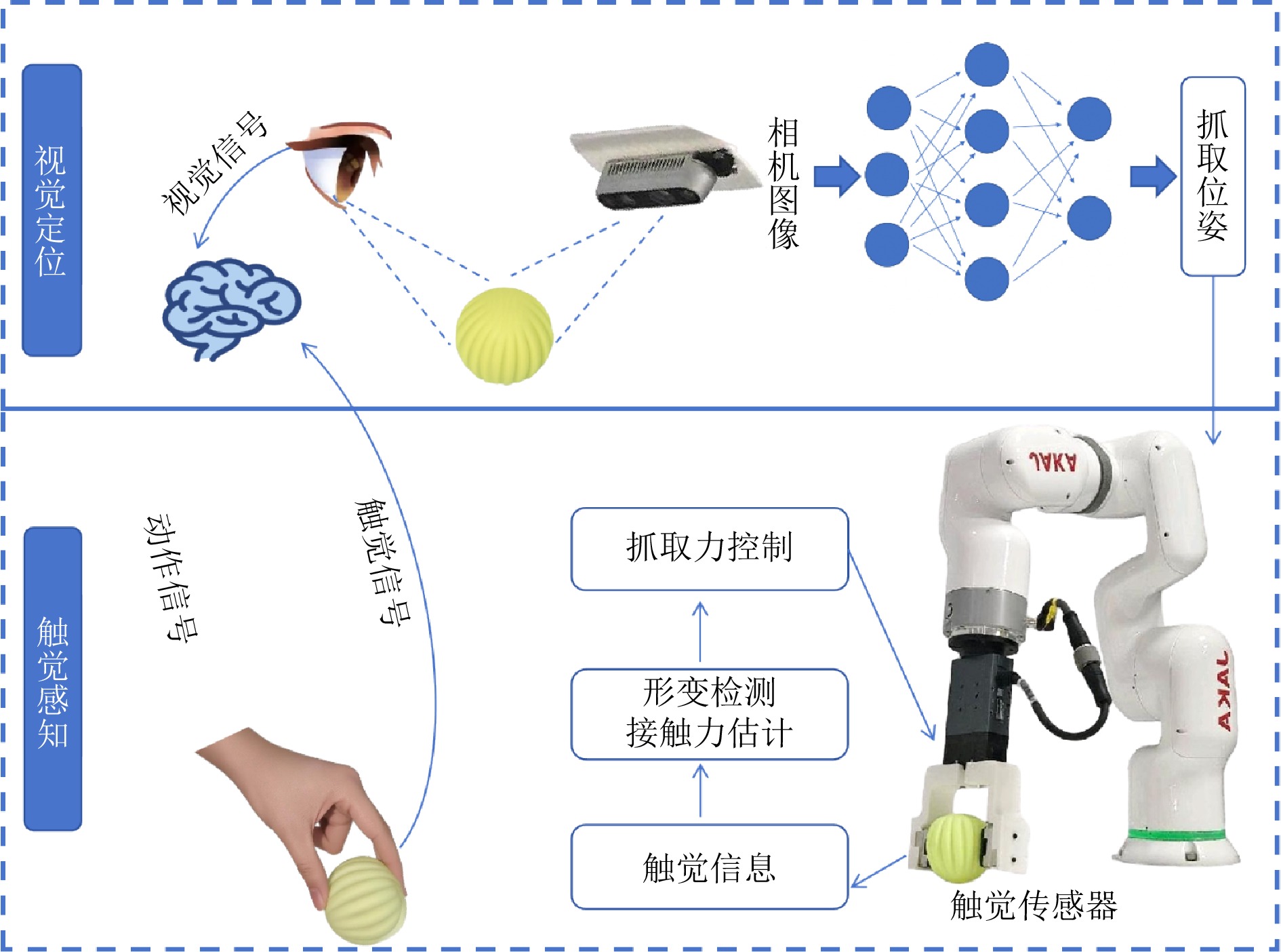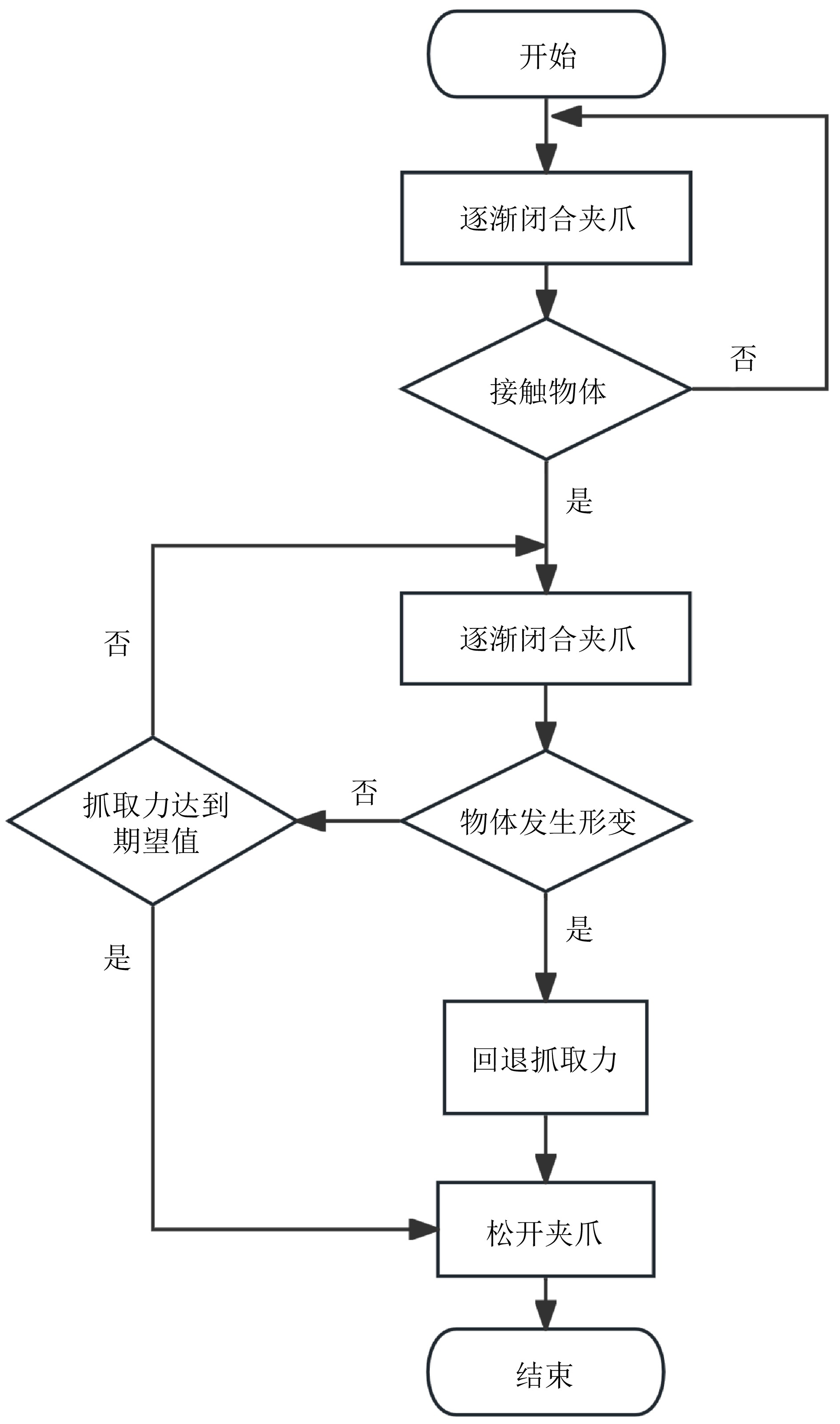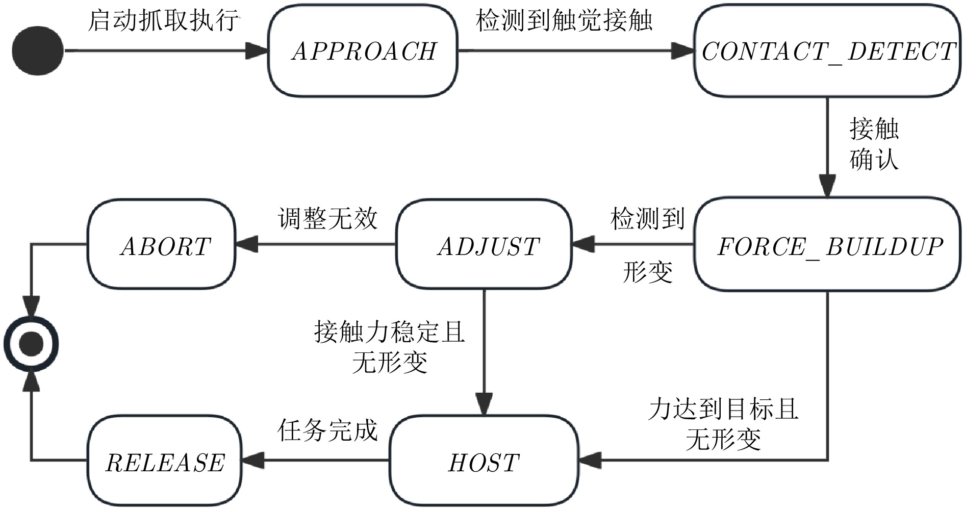 随着机器人技术快速发展, 其对精细感知能力需求日益增长. 然而, 现有机器人仍难以具备如人类般灵活的操作能力. 在精细抓取任务中, 机器人恒力抓取策略存在局限性: 抓取力过大易损伤物体, 抓取力过小则导致抓取不稳. 为应对上述问题, 提出一种基于视觉与触觉融合的机器人自适应力控抓取方法. 该方法由视觉模块、触觉模块和抓取策略组成: 视觉模块用于预测目标抓取位置; 在接触阶段, 触觉模块借助视触觉传感器恢复触觉深度并估算接触面积与法向力; 随后, 通过最大深度变化率和帧间均方差进行形变判定, 并触发抓取力调整策略, 从而实现“渐进增力–形变检测–力回退”的仿生反馈抓取机制. 实验结果表明, 该方法将多种日常物体的整体抓取成功率由87.50% 提升至98.75%, 在易碎物体抓取中实现零损坏.