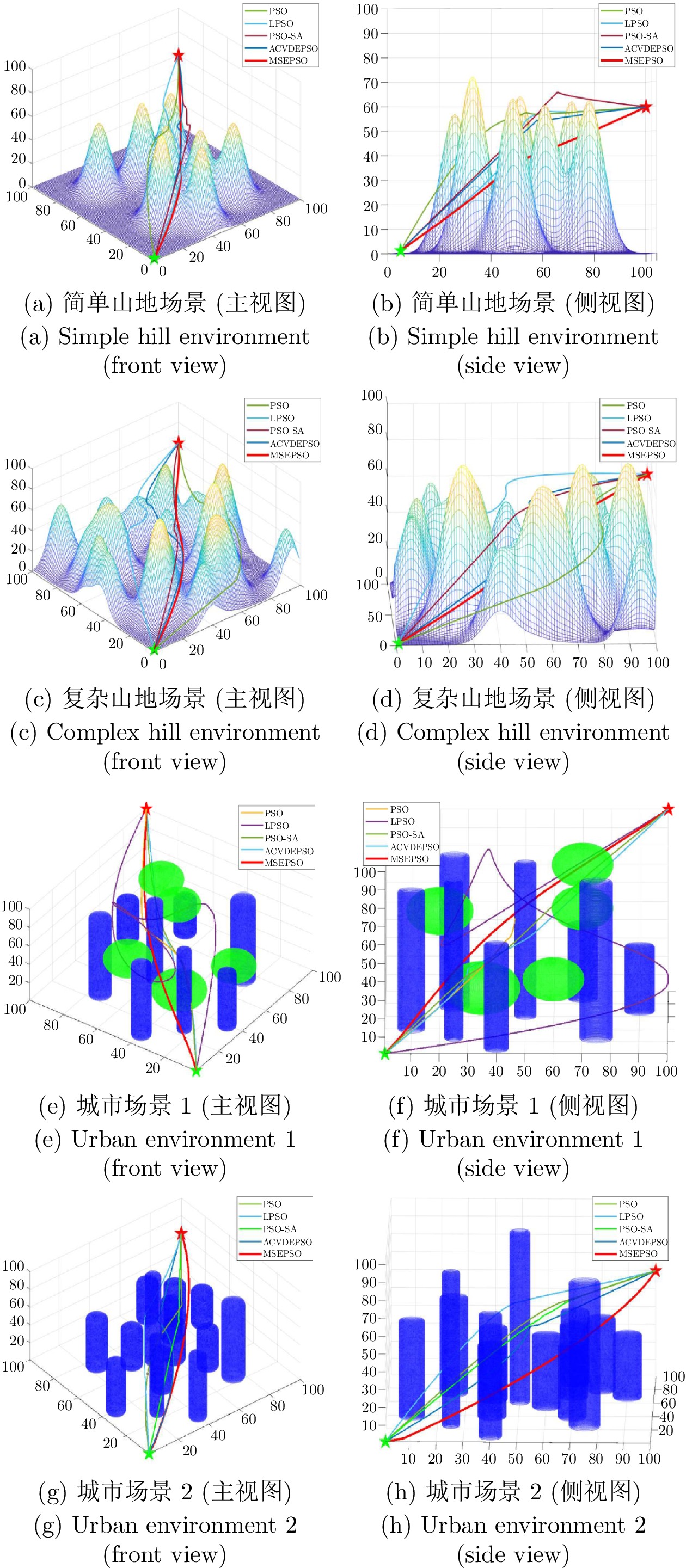 针对无人机(UAV)在三维多障碍物场景下路径规划存在的收敛精度低、稳定性不足等问题, 提出一种多策略进化粒子群算法(MSEPSO). 在初始化阶段, 针对粒子群算法(PSO)对粒子初始位置敏感的问题, 采用拉丁超立方采样(LHS)优化粒子初始分布, 提高种群多样性; 在进化阶段, 设计“平衡−记忆−增强”进化框架, 即利用非线性迭代策略来平衡全局开发和局部搜索, 采用个体历史记忆启发机制(PHMM)增强算法的全局开发能力, 并引入进化粒子, 增强种群对于群体极值附近空间的探索能力, 降低算法陷入局部最优的概率. 在CEC2020测试函数集上与山地/城市场景下的对比实验结果表明, MSEPSO展现出了稳定的寻优性能, 可以规划长度更短、平滑度更高的安全路径.