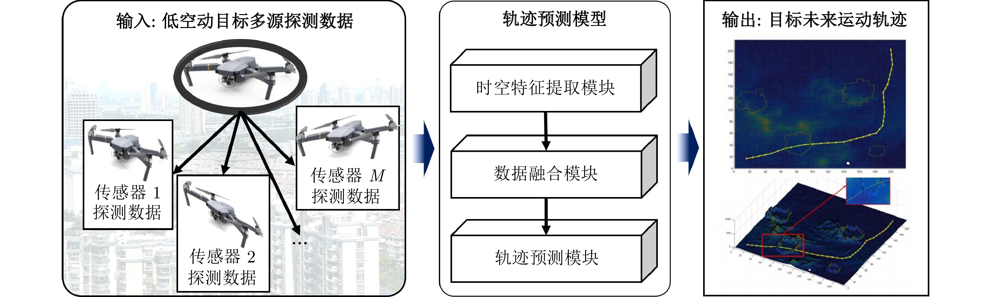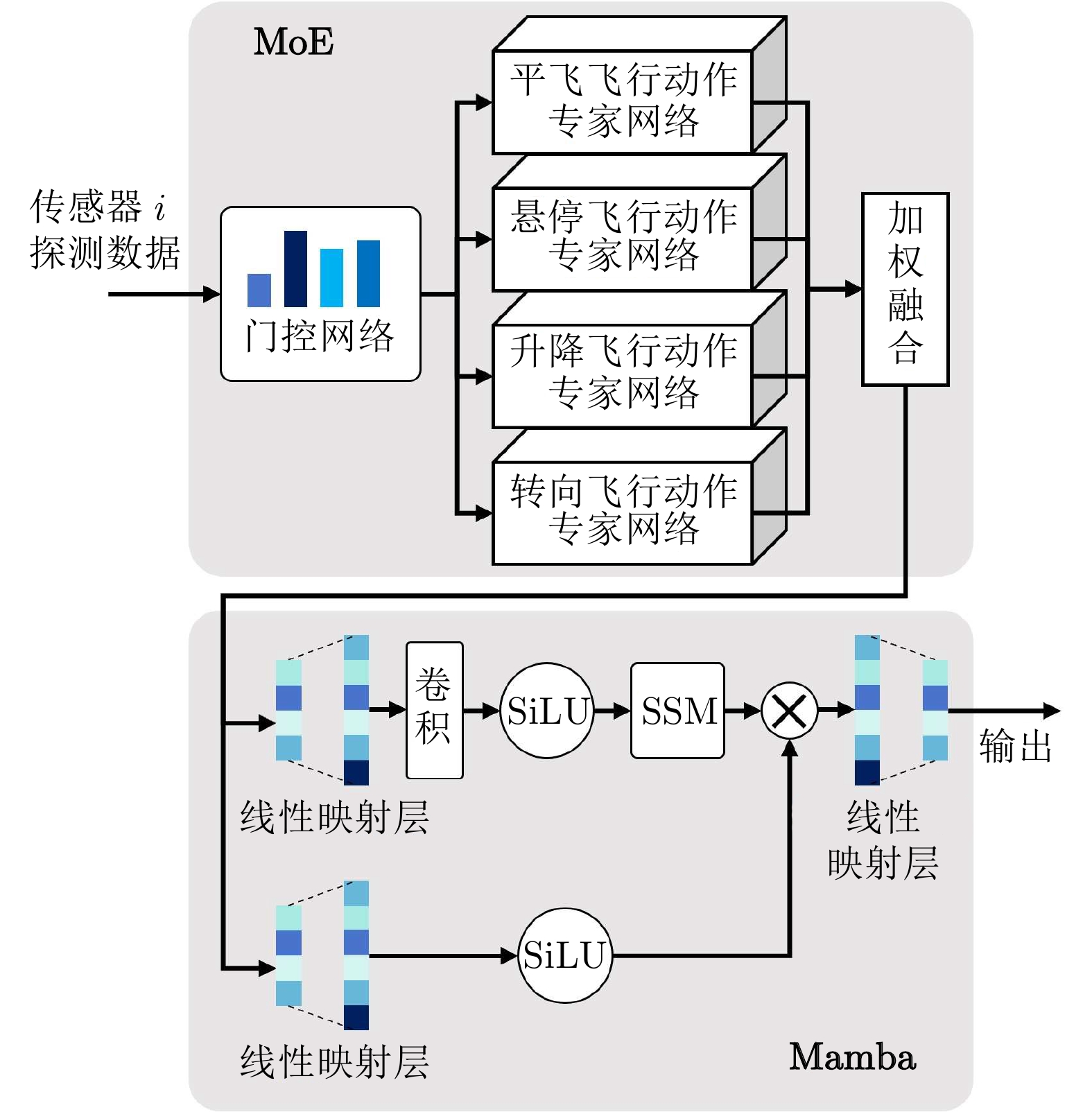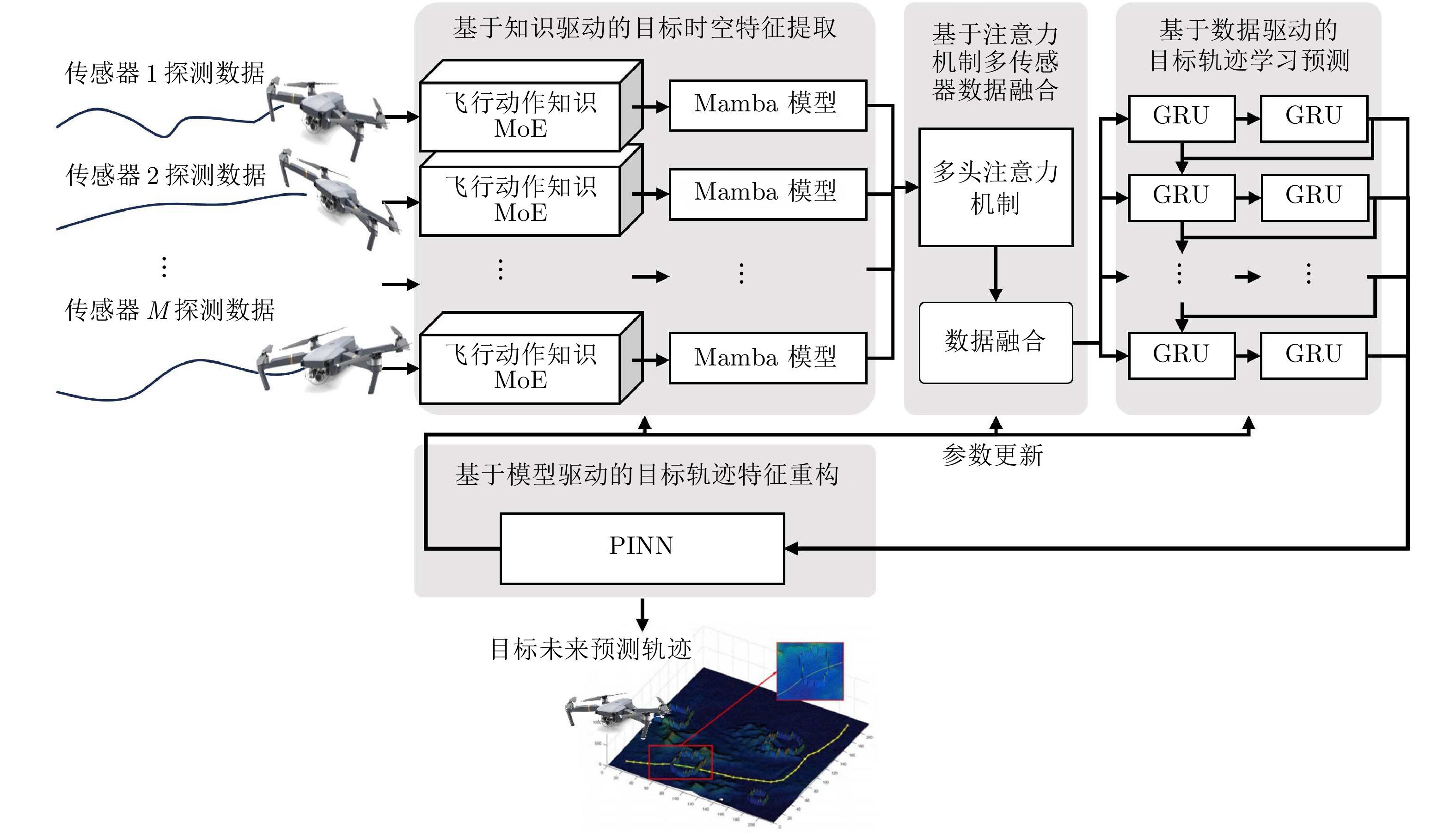 针对低空环境下动目标轨迹预测问题, 提出一种知识—数据—模型驱动的动目标轨迹融合预测框架. 基于低空飞行器运动特征构建飞行知识混合专家模型, 通过将多源传感器数据输入至各飞行知识专家模块, 实现目标机动模态的精细化识别, 并使用Mamba模型提取时空关联特征; 设计权值自适应调节机制, 利用注意力机制动态融合多源感知数据, 解决传感器时空异步问题; 采用门控循环单元建模长期时序依赖关系, 根据目标历史飞行数据生成初步预测轨迹; 基于低空目标运动学方程构建物理信息神经网络, 通过动态权衡数据驱动损失与物理约束损失, 矫正数据驱动偏差, 确保预测轨迹满足运动学约束并有效抑制多步预测误差累积. 数值仿真及实验验证结果表明, 所提出的知识—数据—模型驱动的动目标轨迹融合预测方法, 能够有效预测低空目标飞行轨迹.