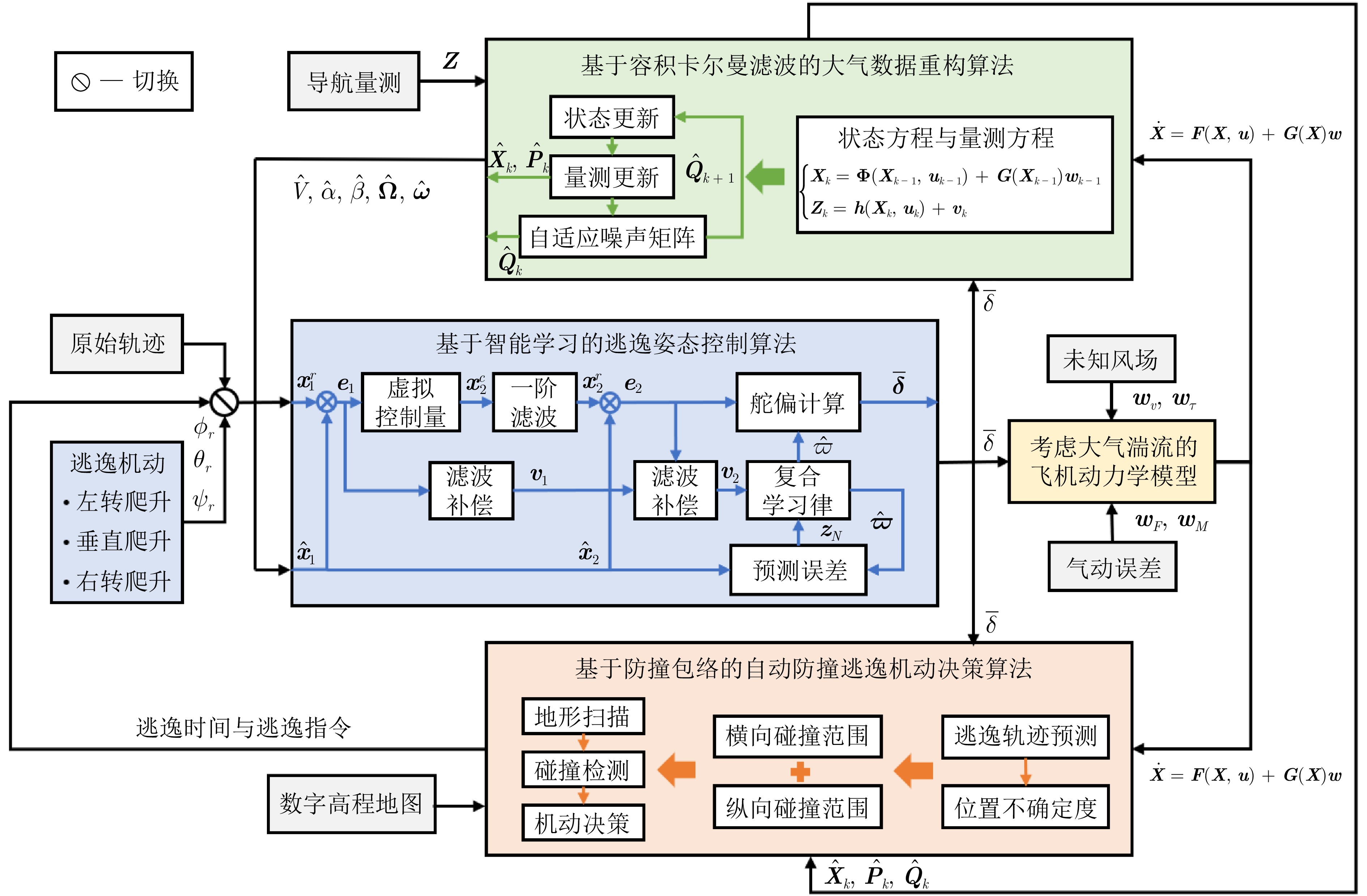 面向低空经济发展中无人飞行器对复杂空域安全飞行的需求, 系统考虑大气传感器在强风干扰下的失效问题, 并提出一种基于传感重构的高可靠自动防撞策略. 首先建立含湍流扰动的飞行器动力学模型, 采用自适应容积卡尔曼滤波融合导航量测与控制信号, 实现真空速与气流角等状态的鲁棒在线重构; 其次针对逃逸阶段的模型失配与噪声扰动, 设计智能学习自适应控制律补偿状态估计误差, 实现逃逸姿态指令稳定跟踪; 最后构建滤波协方差驱动的动态碰撞包络, 结合控制系统模型量化轨迹预测不确定度, 完成地形碰撞检测, 并生成多逃逸轨迹择优避障指令. 仿真结果表明, 在突风与强湍流条件下, 可实现气流角精确重构及鲁棒防撞告警与改出控制, 相关技术可为低空无人飞行器防撞系统设计提供可靠方案.