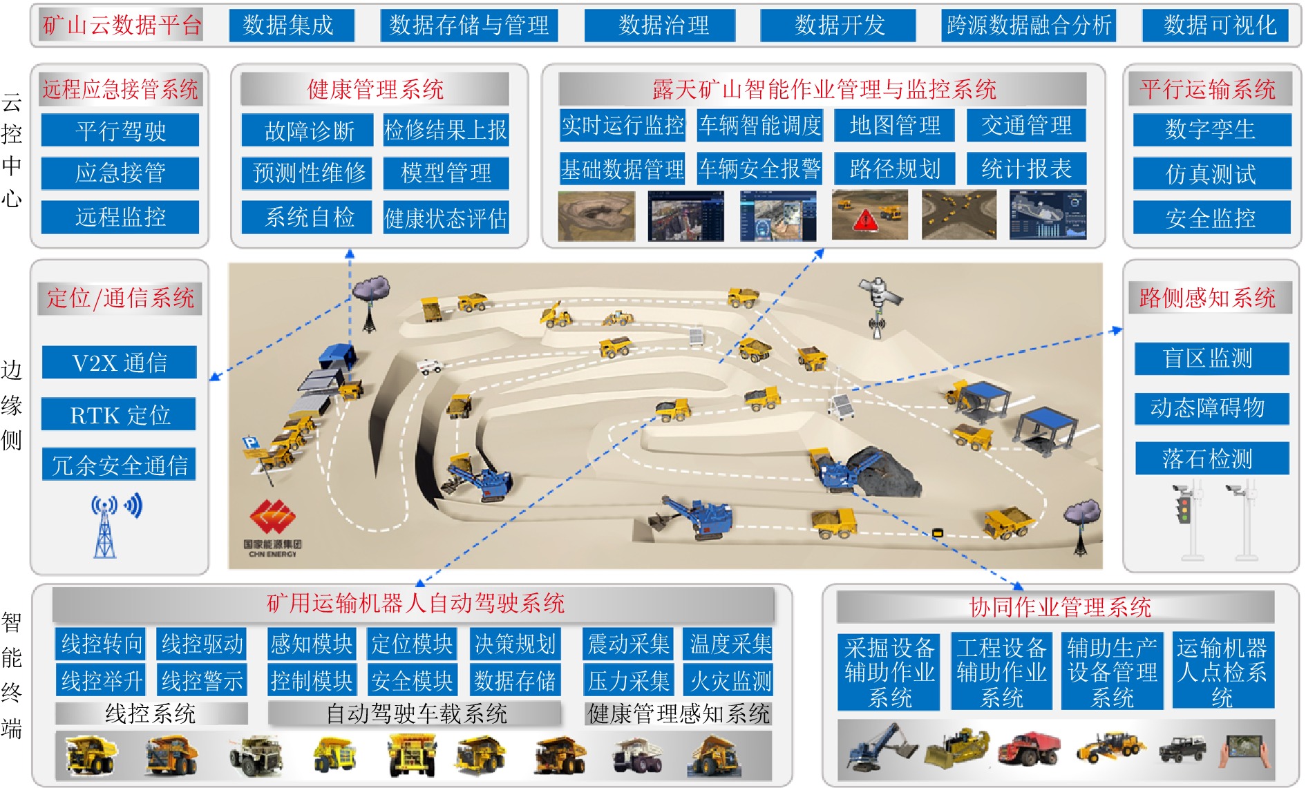 露天矿机器人化采运系统面临复杂特定场景数据不足、极端工况测试困难、现场试验与调试安全风险高、高动态变化环境的感知与建模复杂和全场景物理实验周期长等挑战, 亟需突破提效开采演化机理、高精度全域融合感知、高效率稳定协同控制、高可靠安全群体管控4大科学问题. 通过研究极端环境全域多模感知与变载稳健自适应控制、动态装卸区多机装载协同与多车高效卸载规划、采运系统自主学习建模与虚实融合平行仿真、高适用性工程应用方案, 提出露天矿立足机器人化采运“端边感知、平行控制”的智慧生产模式, 从感控、协同、调度、应用等多层次提出机器人化采运关键理论与技术. 通过技术创新和迭代优化, 实现我国露天矿机器人化采运系统技术自主创新和关键技术自主可控, 确保露天煤矿机器人化运输车的大批量安全高效作业运行, 形成我国露天煤矿迈向高水平智能化的“双十 (10项创新技术、10项机器人化采运标准)、双百 (100台车应用示范, 较有人系统的110%的综合运输运行效率)、双千 (