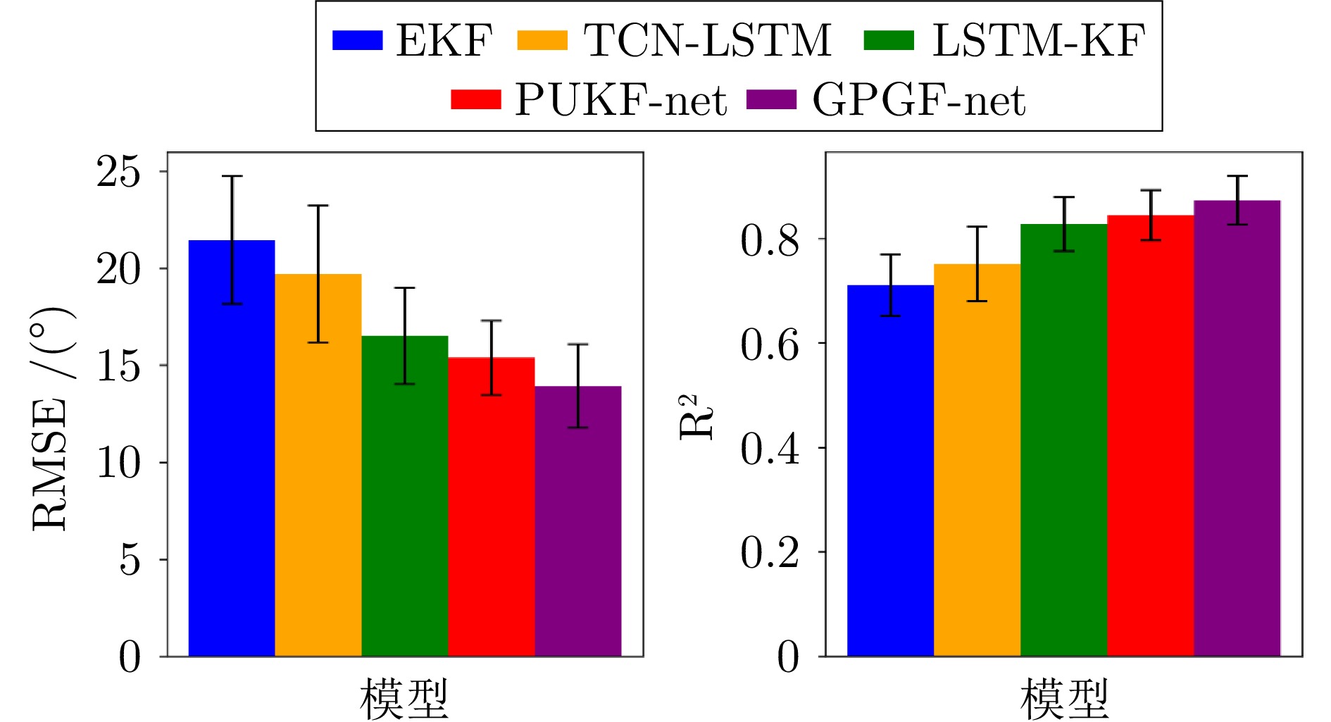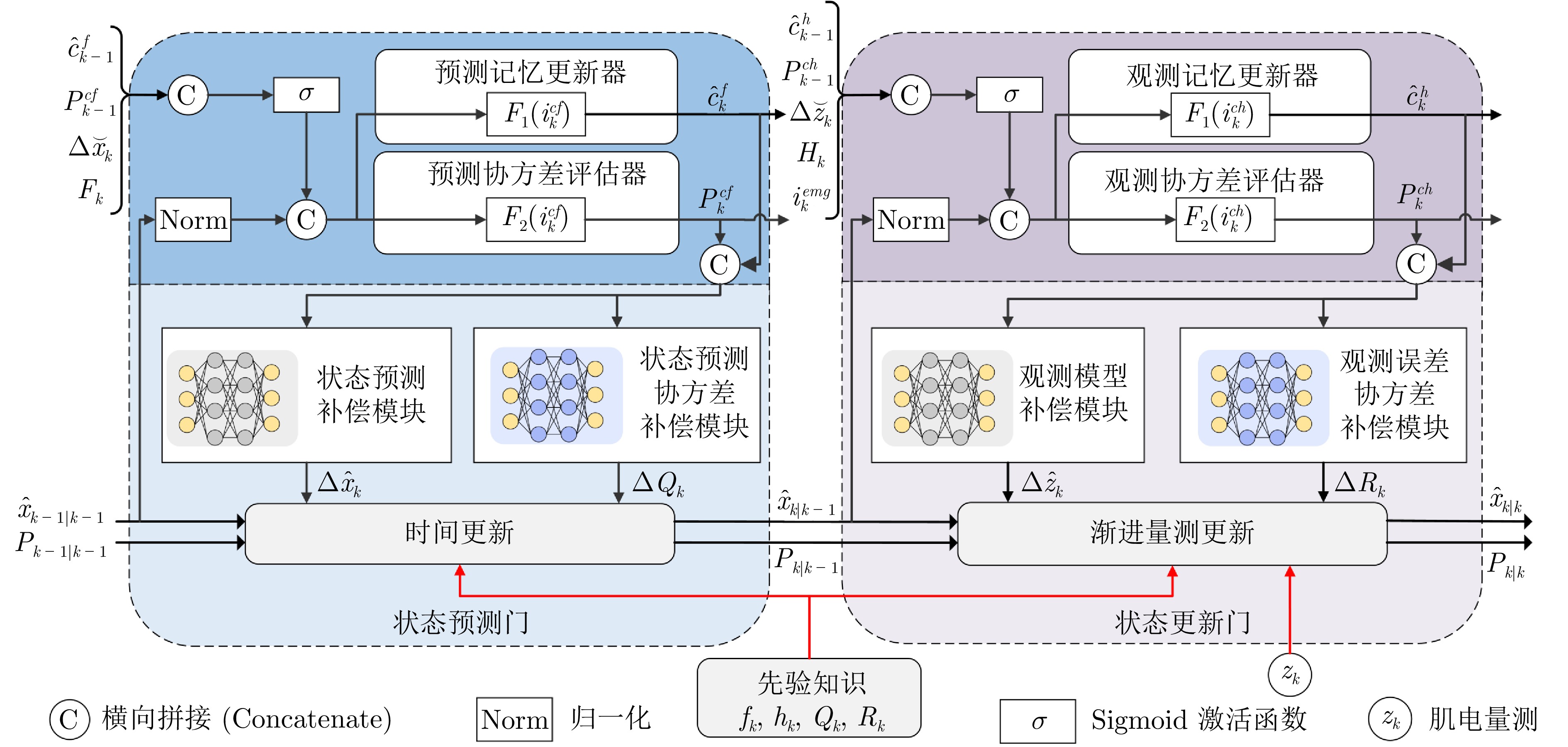 针对表面肌电信号和人体运动等模型误差引起的运动估计性能下降问题, 提出一种基于门控渐进高斯滤波网络(gated progressive Gaussian filtering network, GPGF-net) 的人体运动估计方法, 以实现对模型误差的补偿以及提升运动估计的精度. 首先, 设计门控记忆机制来调控信息流, 以学习出系统状态的长期依赖与观测信号的时变特性, 从而动态调整误差补偿项的分布参数. 其次, 通过融合贝叶斯滤波与深度学习的优势, 引入渐进式观测更新策略到GPGF-net, 以减小非线性近似误差以及增强模型鲁棒性. 最后, 通过人体肢体运动估计实验表明, 相较于现有方法, GPGF-net显著提高了估计精度, 均方根误差降低15.62 %, 相关系数R2提升5.08 %, 验证了所提方法的有效性.