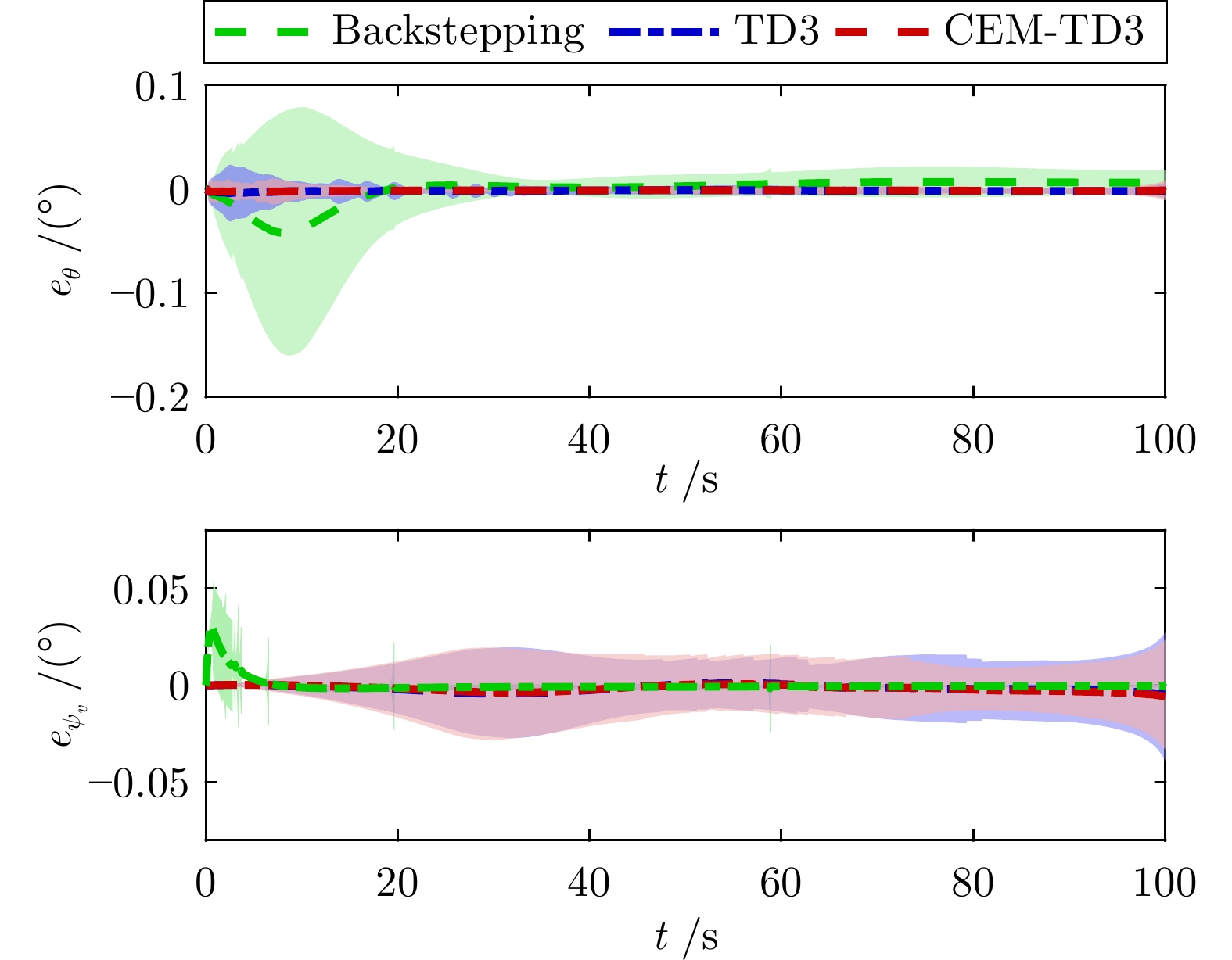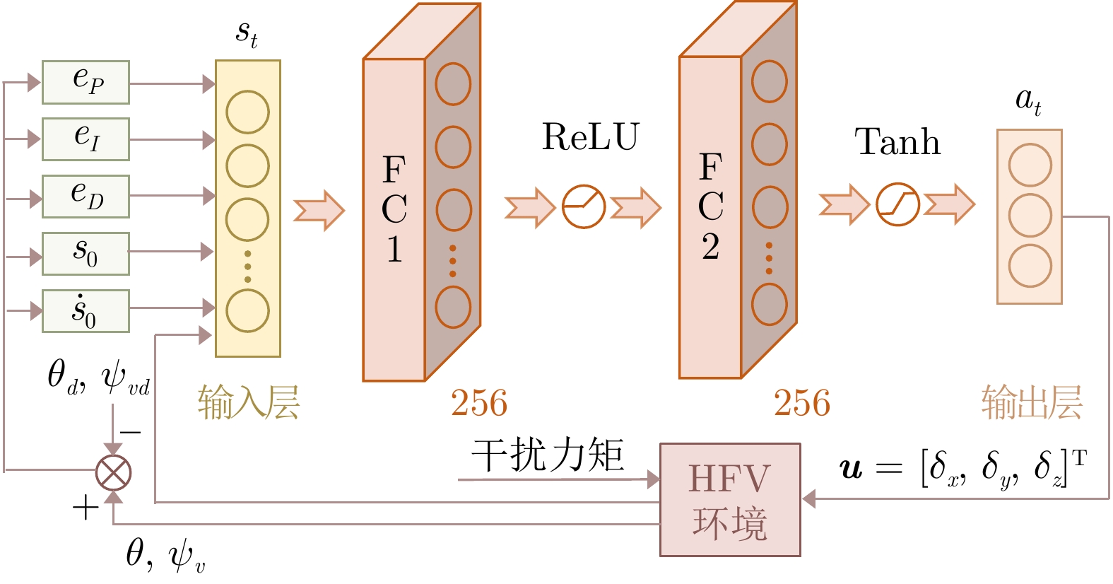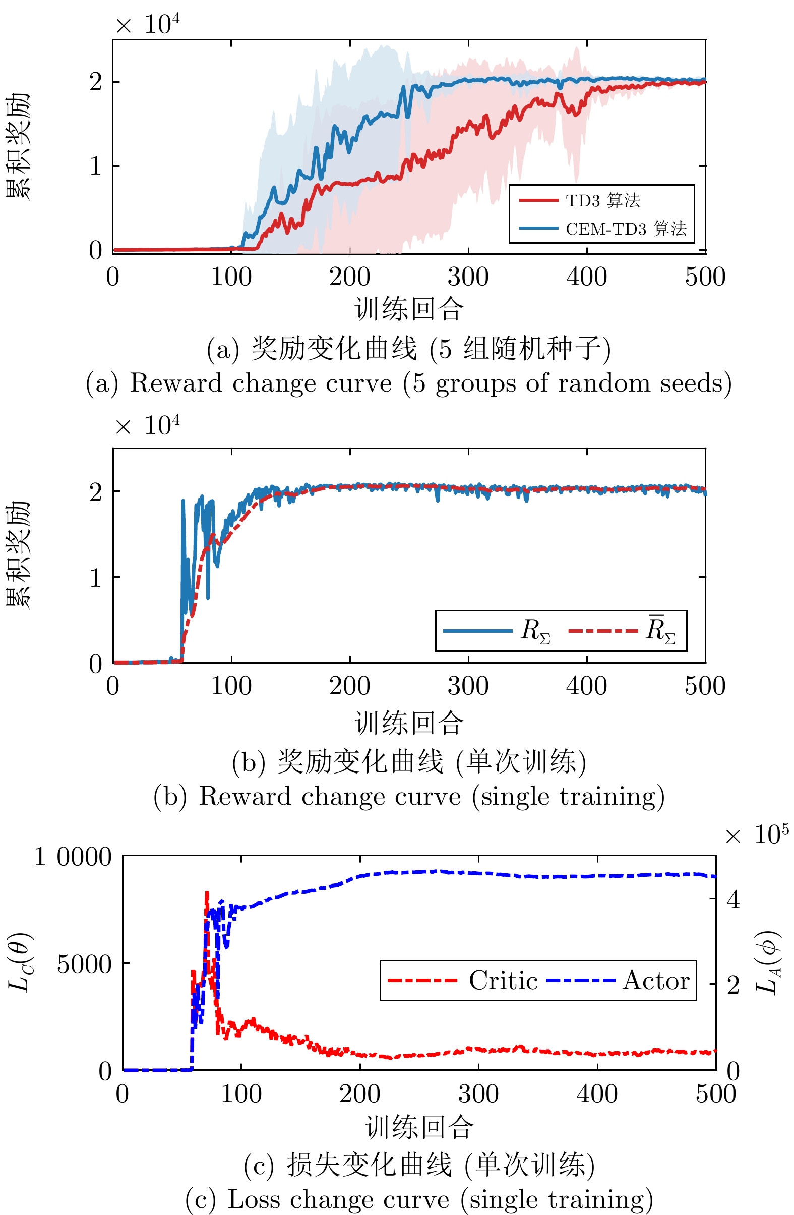 针对高超声速飞行器在外界干扰与模型不确定性影响下的制导控制难题, 提出一种融合双延迟深度确定性策略梯度与交叉熵方法 (cross-entropy method, CEM) 的进化强化学习框架. 首先, 构建高超声速飞行器的运动模型与制导控制一体化模型; 其次, 将复杂干扰环境下的多约束控制问题转化为强化学习决策优化过程, 依托深度强化学习的无模型数据驱动特性, 建立从状态观测到舵偏角指令的端到端映射机制. 同时, 引入基于CEM的动作空间采样机制, 通过Q值最大化准则筛选精英候选动作集, 利用价值函数引导进化搜索方向, 有效克服传统强化学习探索低效、盲目性强的缺陷, 提升样本利用效率. 最后, 仿真结果表明所提算法能够适应初始高度偏差±300 m、速度偏差±200 m/s及气动参数±40%不确定性等变任务飞行条件, 且在终端控制精度与鲁棒性等核心指标上显著优于传统控制方法.