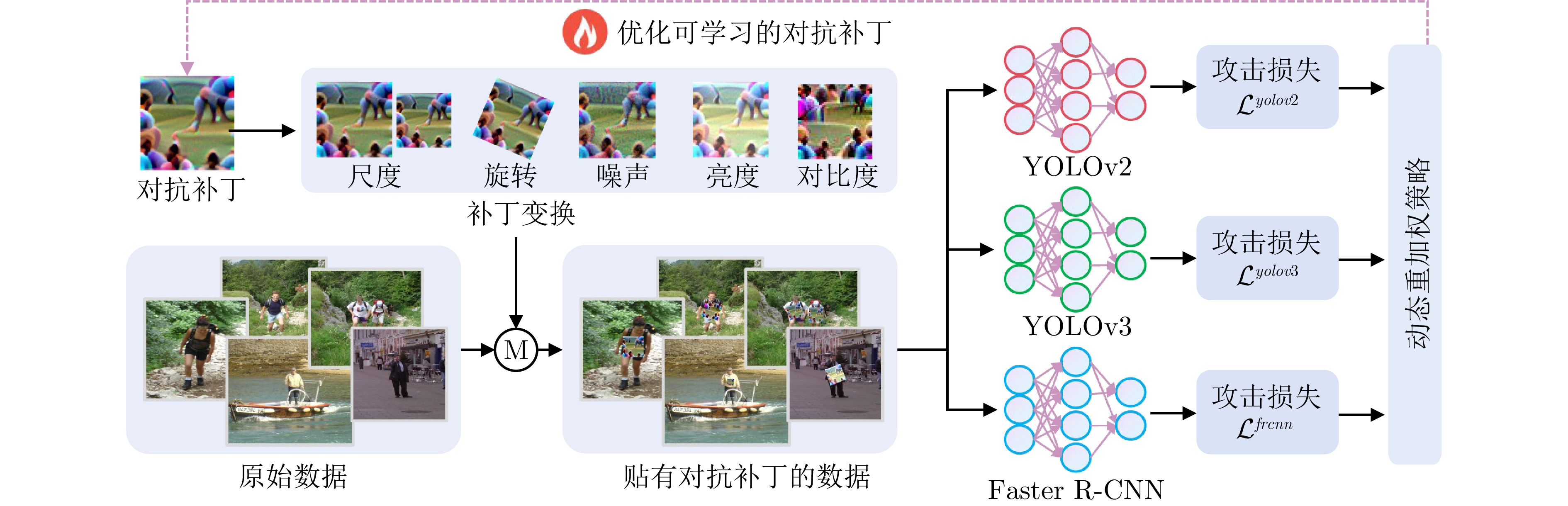 随着目标检测模型在实际应用中的广泛部署, 其安全性问题日益成为研究热点. 对抗攻击技术通过精心设计对抗补丁, 能够有效诱导模型产生错误预测, 揭示了深度神经网络在决策过程中存在的内在脆弱性. 为提升对抗补丁在不同检测器上的攻击迁移性, 现有方法大多依赖静态权重融合策略进行联合优化, 难以充分协调不同检测器在脆弱性分布及优化动态上的差异, 导致攻击效果无法在各模型间兼顾, 迁移能力受到显著限制. 针对这一挑战, 提出一种基于多任务动态重加权机制的可迁移性对抗补丁生成框架. 该框架设计全局校正因子和局部校正因子, 分别从任务间整体优化进度及单任务细粒度收敛行为两个层面动态调整任务权重, 实现多模型联合优化过程中的协调与鲁棒性提升. 通过系统性的数字域与物理域实验验证, 所提方法显著增强了对抗补丁在不同目标检测器上的对抗攻击迁移性, 并且在真实物理的部署中表现出优秀的攻击效果.