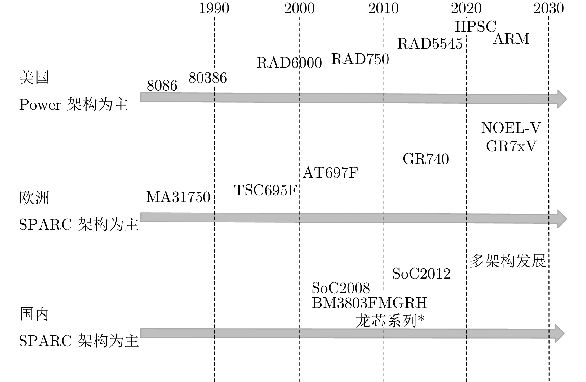 本文系统回顾美国、欧洲及我国在宇航用处理器领域的技术演进, 重点分析了基于PowerPC架构的美国代表性处理器产品以及采用SPARC架构的欧洲与我国典型处理器方案. 研究揭示, 未来宇航用处理器的发展将显著分化为通用型与智能型两大技术路线. 通用型宇航用处理器将呈现高性能(如提升多核并行计算能力)、高集成度(如实现系统级芯片SoC)、高可靠性(如强化抗辐射设计)及低功耗的协同发展趋势; 而智能型处理器则将侧重于提升在轨实时智能信息处理能力.