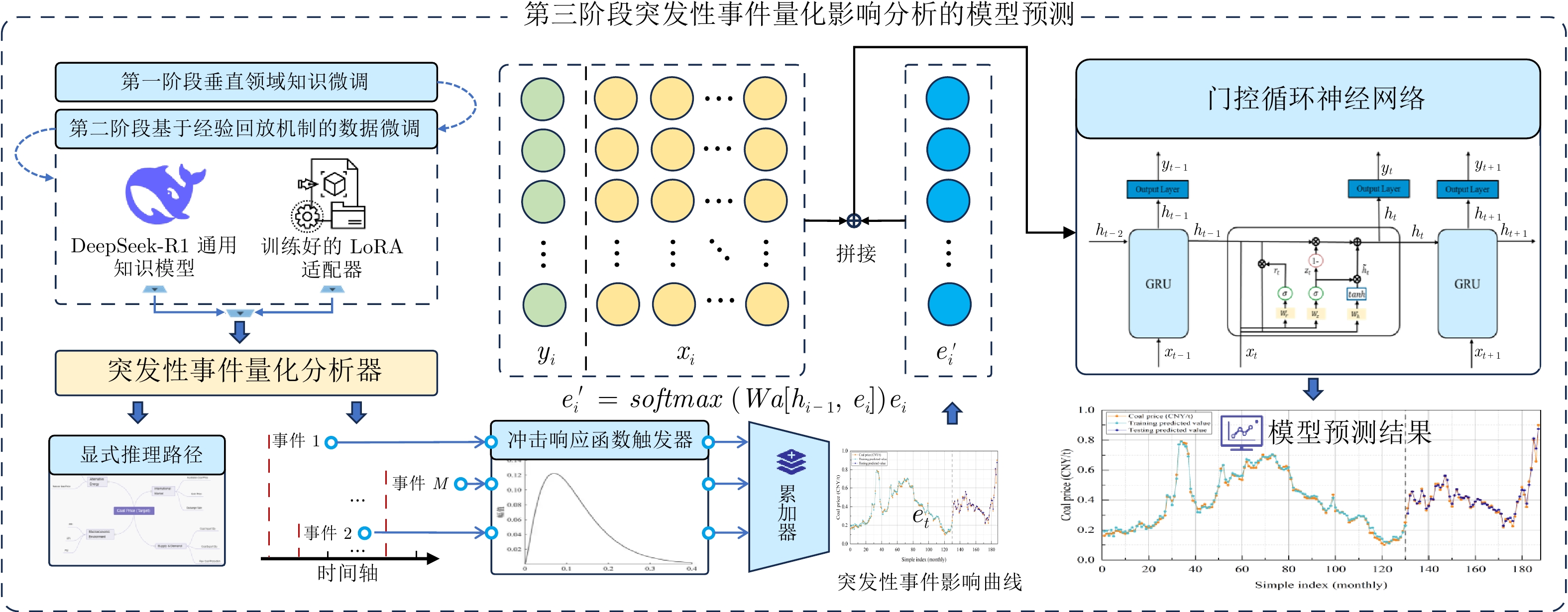 能源是现代工业运行的核心要素, 其价格波动对工业企业的成本结构和竞争力具有显著影响. 然而, 受政策变化和地缘冲突等突发事件影响, 工业能源价格呈现高频波动特征, 难以实现精准预测. 此外, 现有深度学习方法在事件量化、动态响应及可解释性方面存在不足, 导致预测结果的不确定性显著增加. 为此, 提出一种基于大模型量化突发事件影响的工业能源价格预测方法. 首先, 为实现突发事件的量化表征与显式推理路径提取, 构建领域知识微调与结构化数据微调的两阶段协同机制, 设计事件冲击函数驱动的多尺度事件解析器, 并结合注意力机制自适应调整衰减速率, 将事件影响分解为短期冲击、中期传导与长期趋势. 其次, 为统一事件量化与价格预测过程, 将量化结果作为外部输入增强模型响应能力, 并输入门控循环神经网络实现价格预测. 最后, 在秦皇岛港煤炭月度价格和布伦特原油月度价格两个真实工业数据集上开展系统实验, 验证了所提方法的有效性, 并进一步分析大模型推理文本对预测性能的贡献机制.