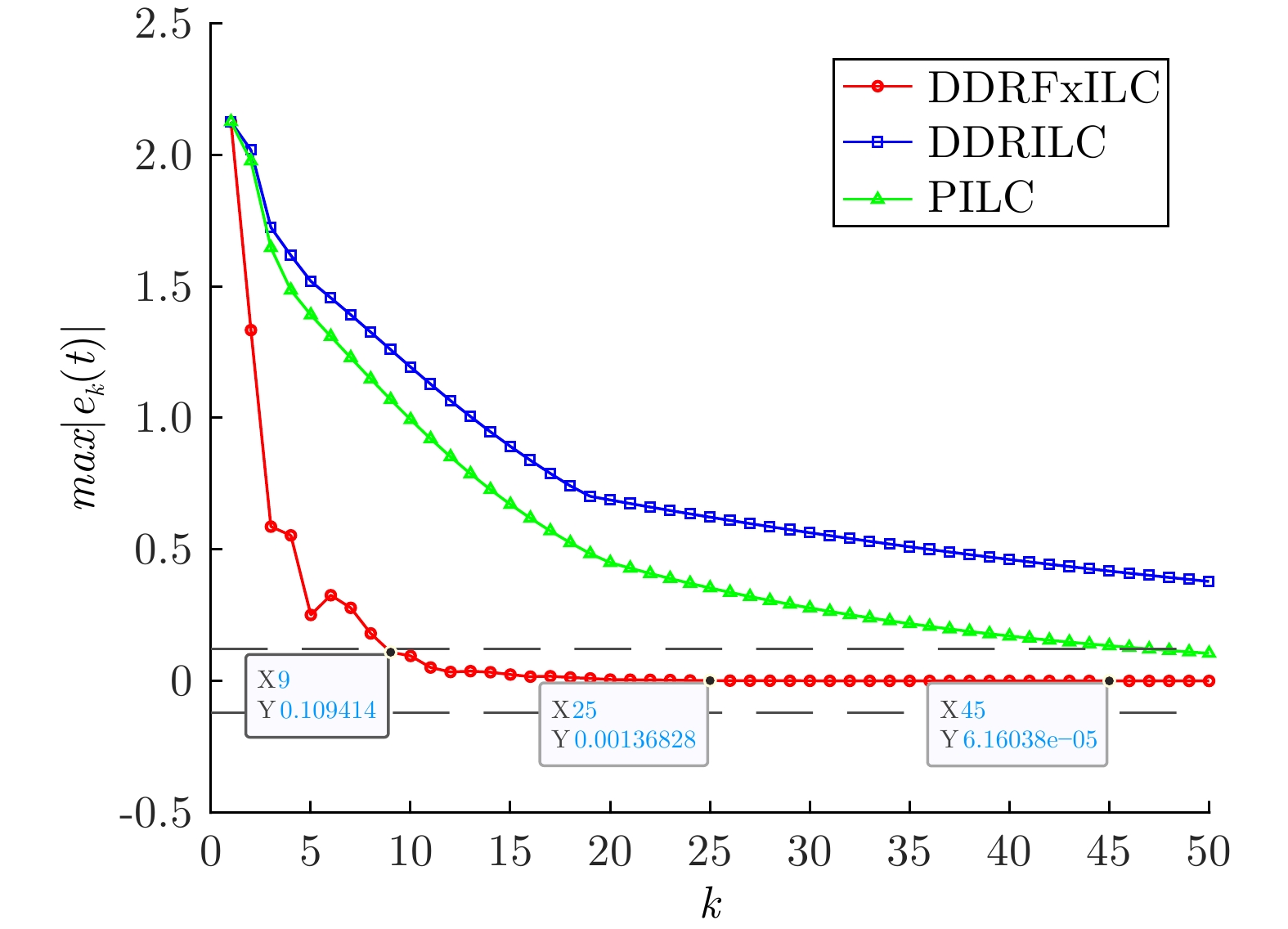 本文针对一类在有限时间内执行重复任务的不确定离散时间系统轨迹跟踪问题, 提出一种有限次迭代学习误差跟踪控制方法. 首先, 构造不依赖于参考轨迹的期望误差轨迹, 放宽传统迭代学习控制中的初值一致条件, 且离散形式的期望误差轨迹设计仅需已知每次迭代的误差初值, 简化设计要求. 其次, 通过在迭代轴上构建饱和迭代吸引律, 设计带有干扰补偿的迭代学习控制器, 并推导出跟踪误差的稳态误差带和满足精度要求所需的最大迭代次数表达式, 根据期望精度选择控制器参数, 在参数设计阶段保证系统鲁棒性, 实现跟踪误差有限次迭代收敛. 最后, 通过数值仿真和实验结果验证所提控制方法的有效性.