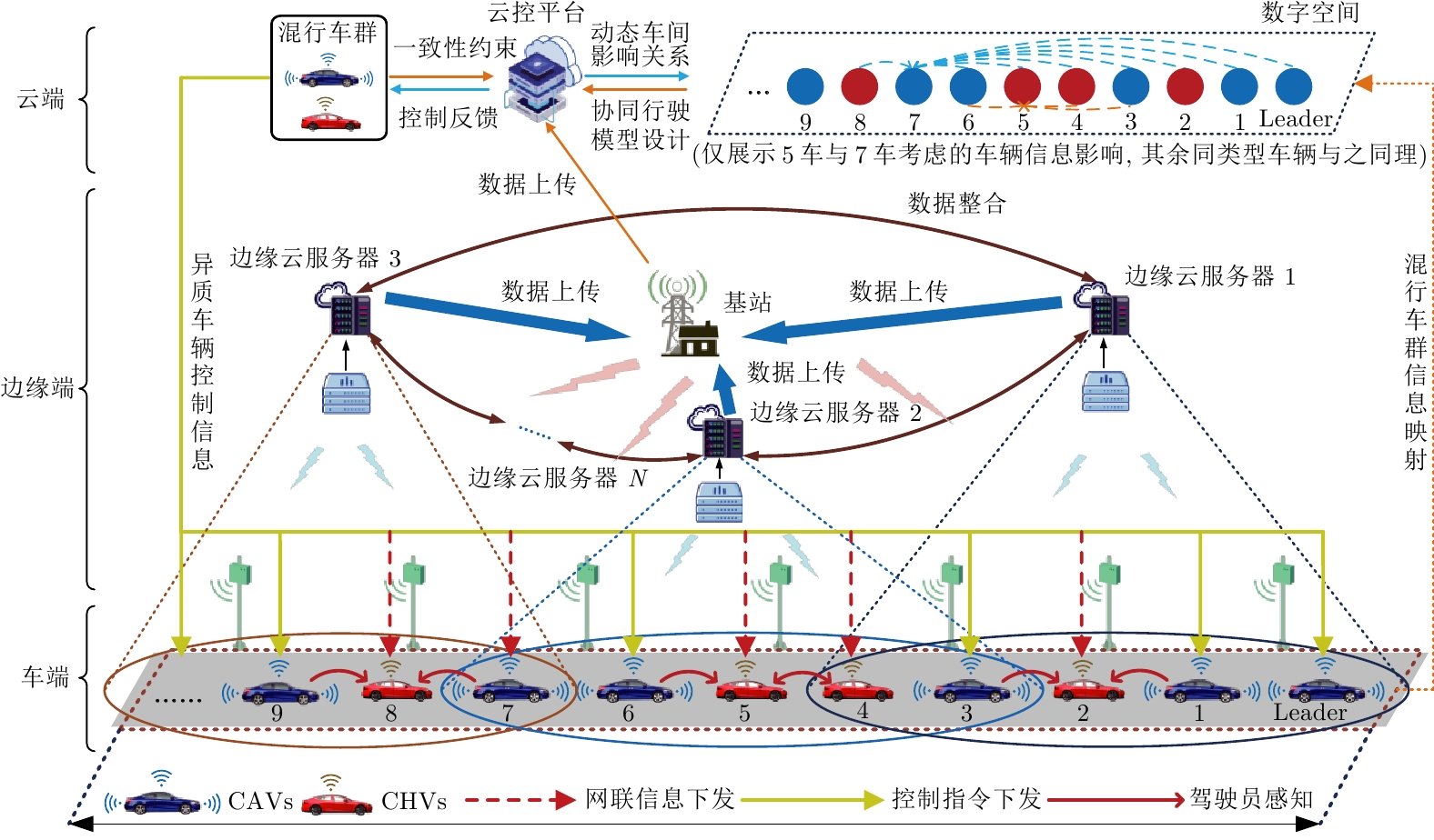 随着车联网技术的进步, 由网联人驾车与网联自动车组成的混行车群规模正逐渐增大, 导致混行车群间的协同与交互难度增加, 进而影响混行车群行驶状态的一致性. 为解决此问题, 提出一种云−边−端协同下考虑多车影响的混行车群集中式协同控制方法. 首先, 为有效处理和分析较大规模混行车群产生的海量异构数据, 设计混合交通场景下云−边−端协同架构. 然后, 考虑网联人驾车前方两辆车及紧邻后车状态的影响, 以及网联自动车前方所有车辆及紧邻后车状态的影响, 分别在云控平台建立基于分子动力学的网联自动车和固定权重的网联人驾车协同行驶模型. 再者, 根据混行车群间动态影响关系, 设计基于云−边−端协同架构的混行车群集中式协同控制方法, 并利用稳定性和串稳定性理论获得混行车群协同行驶一致性条件. 最后, 通过对比仿真实验验证了所提方法的有效性.