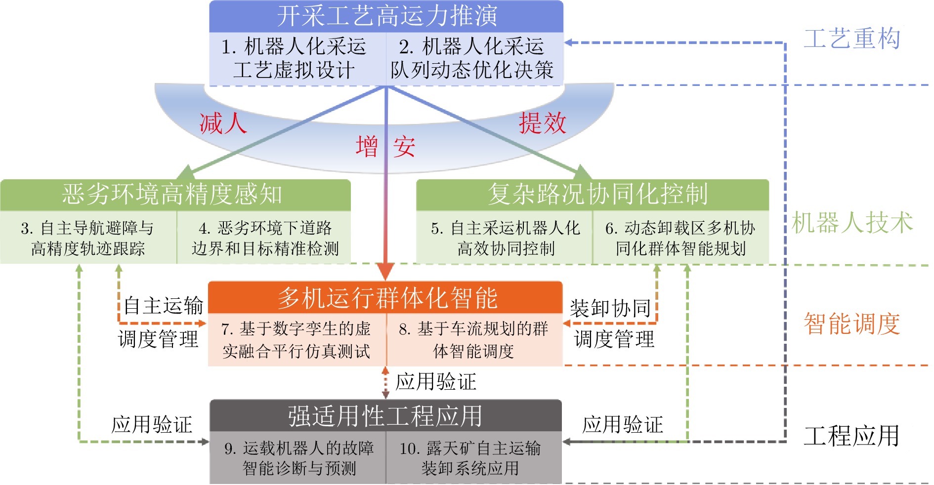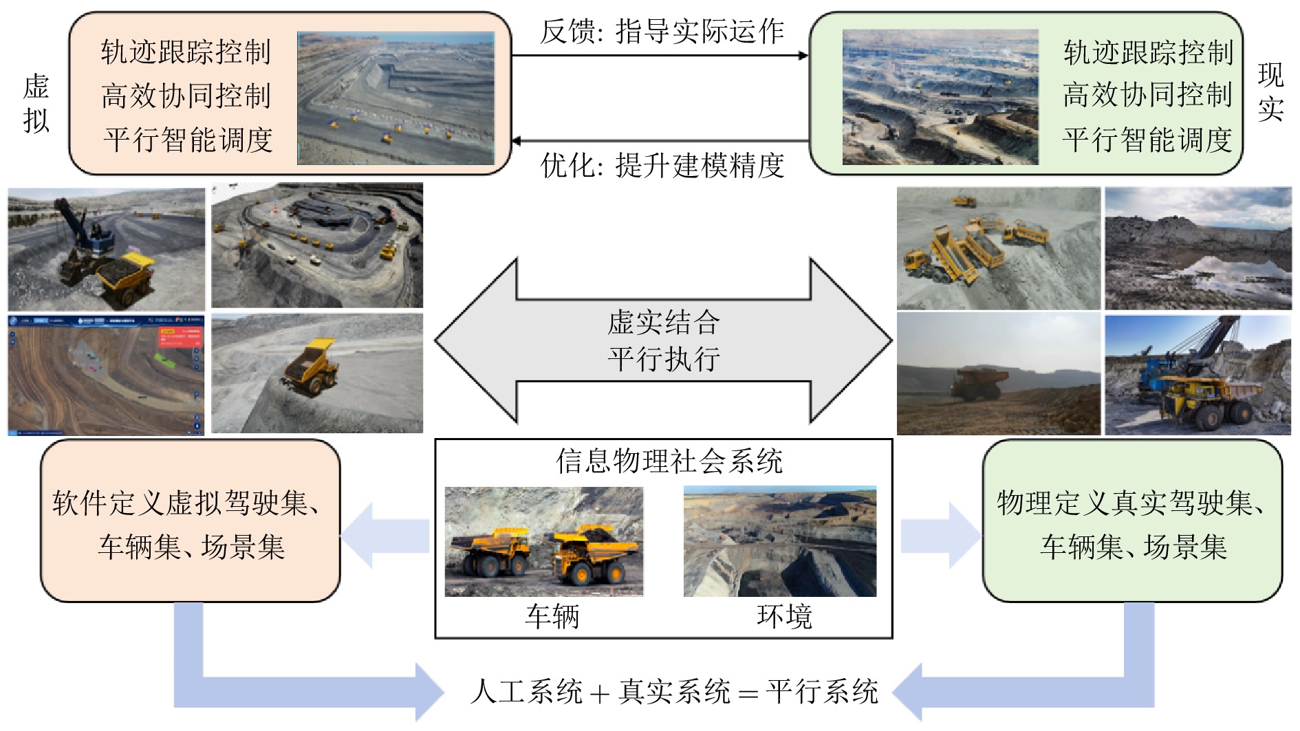 露天矿机器人化开采面临复杂环境数据不足、极端工况测试难、现场试验风险高、动态感知建模复杂及实验周期长等挑战. 为此, 提出基于“端边感知、平行控制”的露天矿机器人化采运智慧生产模式, 从车辆感控、车铲协同、集群调度与工程示范等多层面入手, 系统地突破提效开采机理、高精度全域感知、稳定协同控制与可靠群体管控等核心科学问题. 通过技术集成与工艺优化, 实现百吨级以上无人驾驶运输车的规模化运行, 形成我国露天煤矿高水平智能化的“双十” (10项创新技术、10项标准)、“双百” (100台车示范, 运输效率达有人系统110%)、“双千” (千台车监控平台、千小时无故障运行)中国方案, 有力支撑了我国矿山智能化绿色开采发展战略.