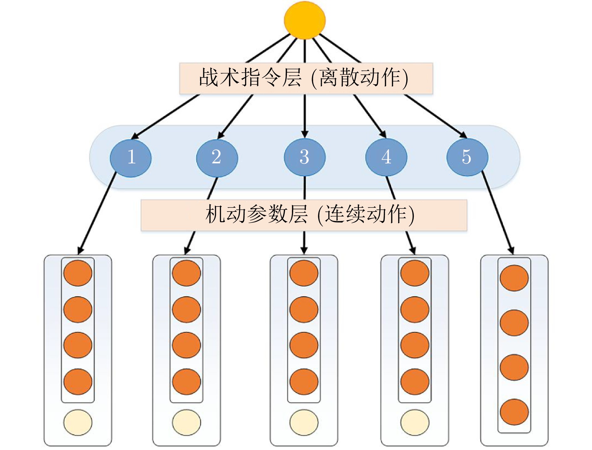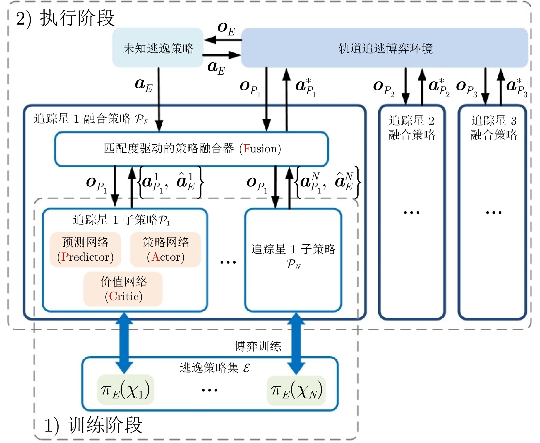 轨道追逃博弈中逃逸策略的高度未知性与行为多样性, 给追踪策略的泛化能力带来严峻挑战. 深度强化学习虽可提升追踪星的博弈效能, 但当逃逸策略偏离训练分布时, 策略网络易产生次优甚至失效的决策. 为此, 提出一种基于行为预测和策略融合的轨道博弈决策方法. 在训练阶段, 首先采用“预测制导 + 人工势场法”构建多样化逃逸策略集. 随后在传统演员−评论家训练框架的基础上, 通过引入预测网络构建预测器−演员−评论家算法, 针对每类逃逸策略分别训练以获得对应的追踪子策略. 其中预测网络用于估计逃逸星动作, 并通过预测结果与真实动作的相似性衡量子策略与未知逃逸策略的匹配度. 在执行阶段, 策略融合器以逃逸星历史动作与各追踪子策略的预测结果为输入, 动态计算匹配度并选择最优子策略进行博弈决策. 实验结果表明, 预测网络能有效评估追踪子策略对未知逃逸策略的适应性, 策略融合器可显著提升追踪星面对多样化逃逸策略的泛化能力与可靠性.