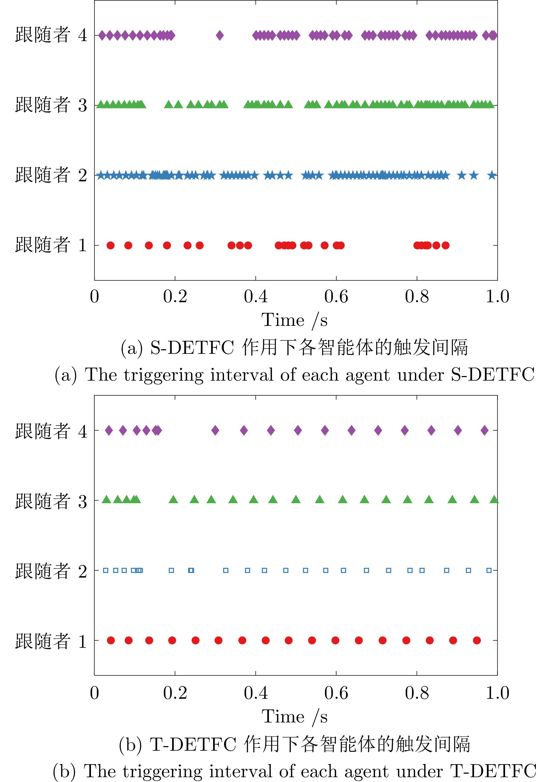 研究通信拓扑固定下受有界扰动影响的非线性多智能体系统固定时间一致性问题. 针对现有事件触发控制方法存在的收敛时间依赖初值、扰动下触发可靠性低、控制参数缺乏理论设计依据等挑战, 提出一种动态事件触发固定时间一致性控制方法. 首先, 设计融合非线性增益与双曲正切扰动补偿的固定时间控制器, 在消除抖振的同时保证收敛时间上界严格独立于系统初始状态. 其次, 构造基于动态变量自适应调节的事件触发机制, 显著降低通信频率并严格证明系统不存在Zeno行为. 进一步, 通过建立新型Lyapunov稳定性分析框架, 显式给出收敛时间上界与事件触发间隔下界. 仿真结果表明, 所提方法在保证固定时间收敛性能的同时, 有效实现通信效率的优化提升.