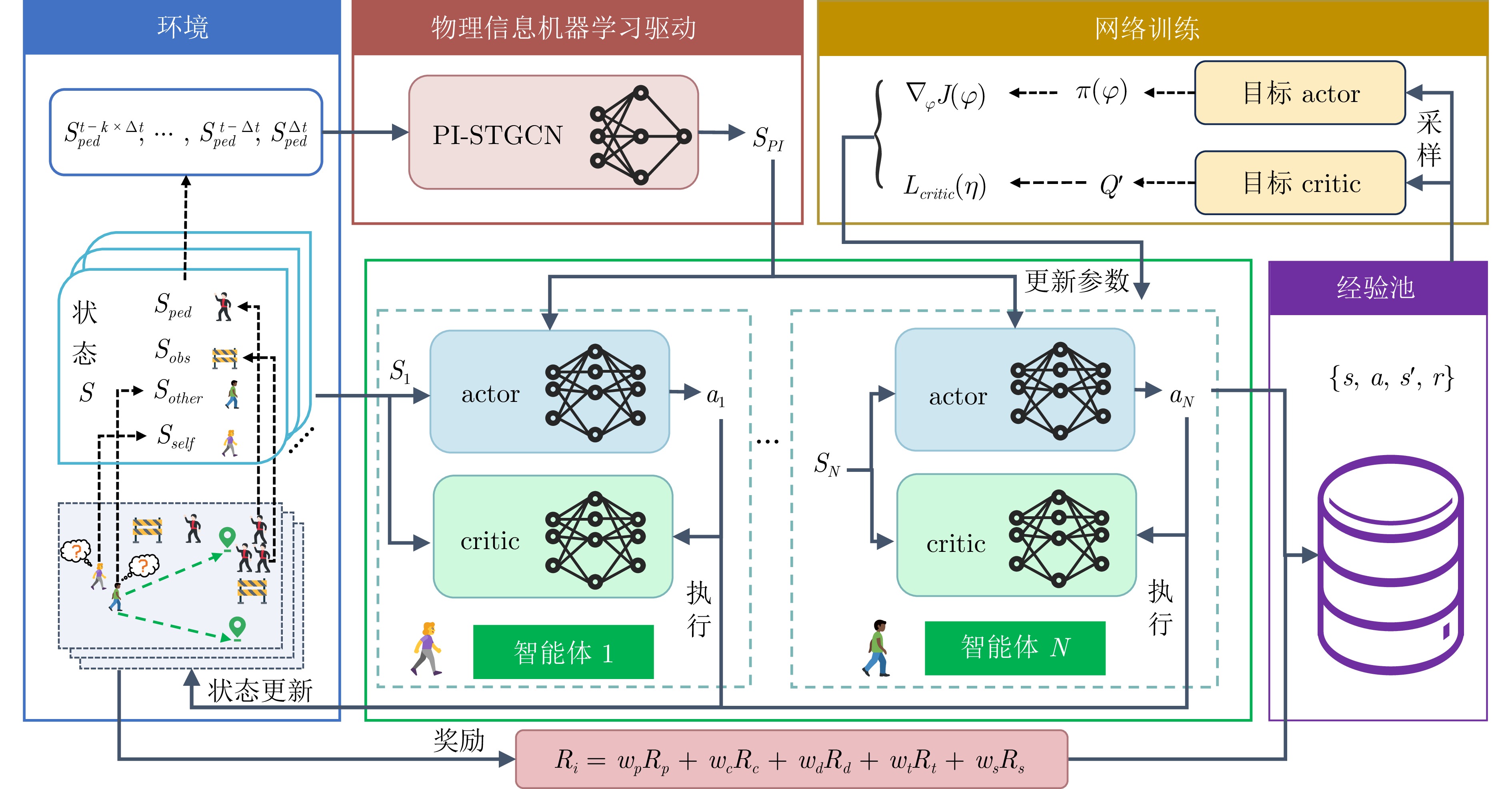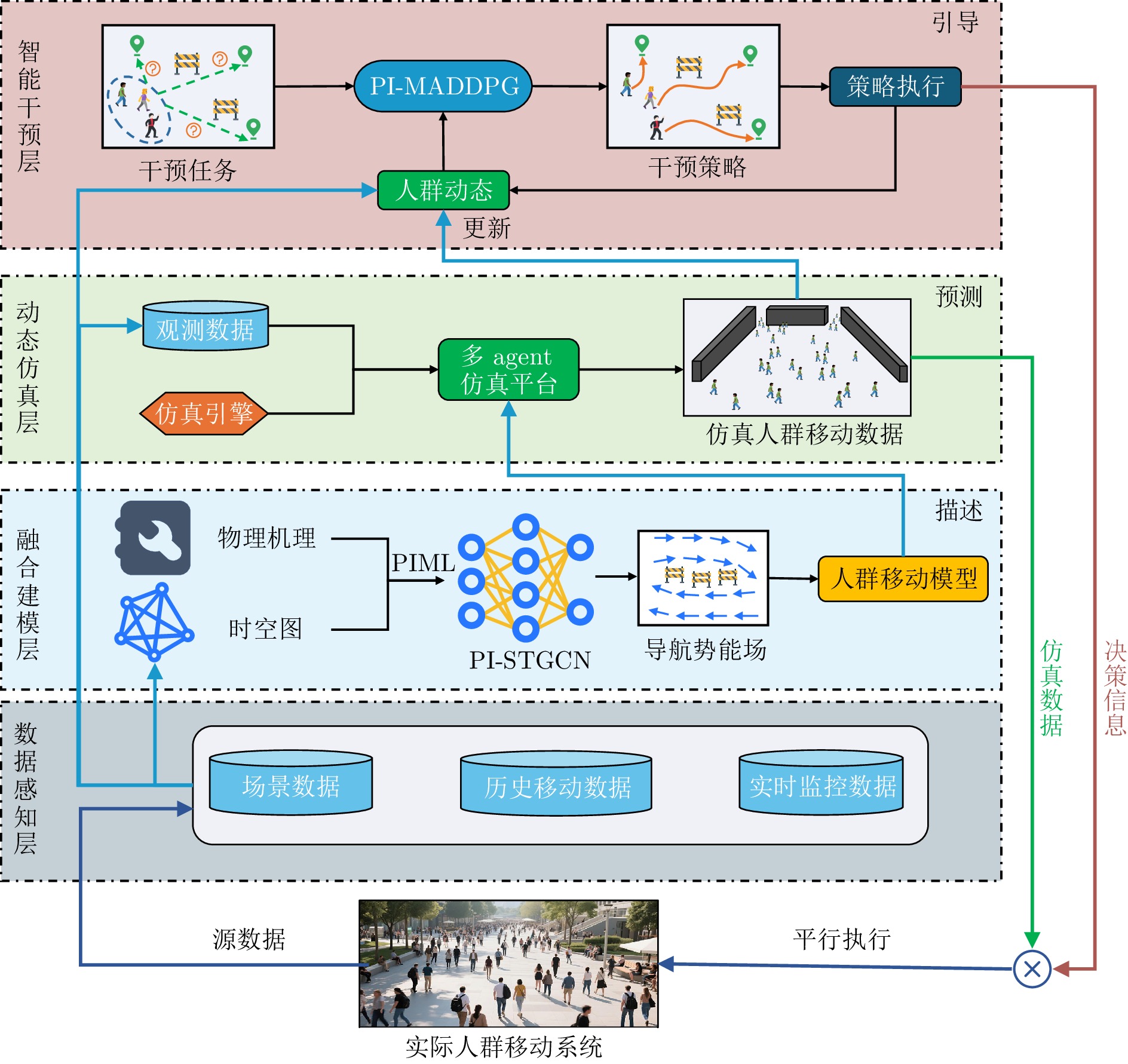 人群移动是影响城市公共安全及应急管理的重要因素, 如何对其进行高精度的建模仿真和有效干预是亟待解决的问题. 为此, 提出一种物理信息机器学习驱动的微观人群移动建模仿真与干预决策框架. 基于平行智能思想, 该框架构建“数据感知−融合建模−动态仿真−智能干预”四层闭环结构, 形成从建模仿真到策略生成、执行及反馈修正的完整链路. 针对人群的移动仿真与引导决策问题, 分别提出基于物理信息时空图卷积网络的导航势能场模型和物理信息多智能体深度确定性策略梯度算法, 有效解决了传统方法中模型准确性较差、仿真与干预孤立以及决策依赖人工经验的问题. 最后, 基于真实数据集开展仿真实验验证了所提框架的有效性.