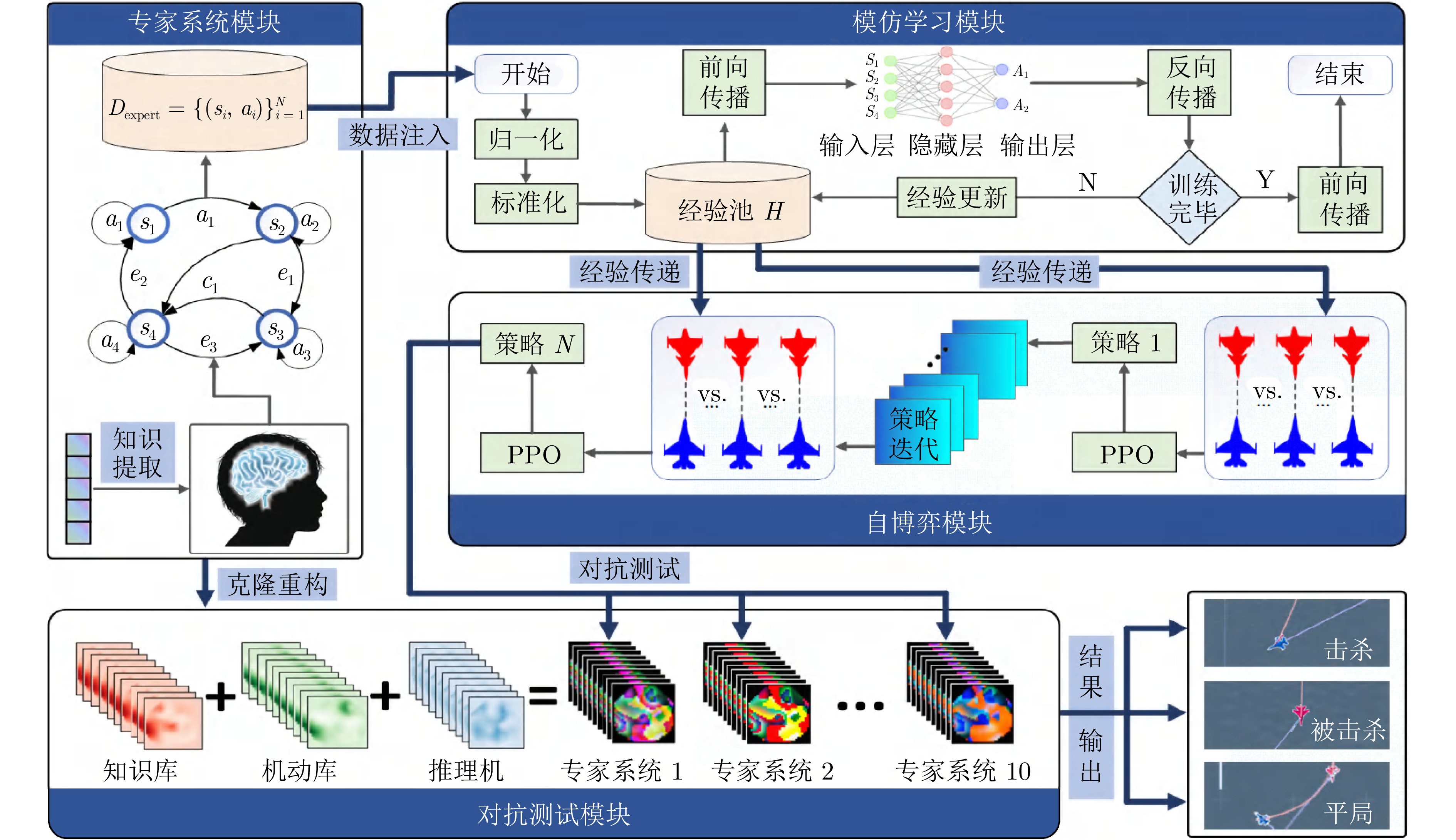 随着机载传感器和中远距空空导弹技术的快速发展, 超视距空战已经成为现代空战的主流形式. 在这种复杂多变的作战环境中, 开发能够实时掌握战场态势并制定合理机动决策的智能化技术, 已成为军事技术研究领域的热点问题. 首先, 构建一个涵盖飞机六自由度动力学模型、导弹制导系统模型和雷达传感器系统的高保真仿真环境; 接着, 融合模仿学习和自博弈方法, 提出基于对手学习的空战决策框架, 以解决深度强化学习在空战中适应性和泛化性差的缺点, 提升智能体在复杂多变战场环境中快速适应和策略优化的能力; 最后, 构建10种具有显著战术差异性的专家系统, 在高保真空战仿真平台中与智能体进行博弈对抗. 结果表明, 在收敛速度和胜率等关键指标上, 所提出的空战决策框架优于传统深度强化学习决策策略, 有效性和泛化性强, 可为复杂超视距空战态势下快速生成可靠策略提供技术支持.