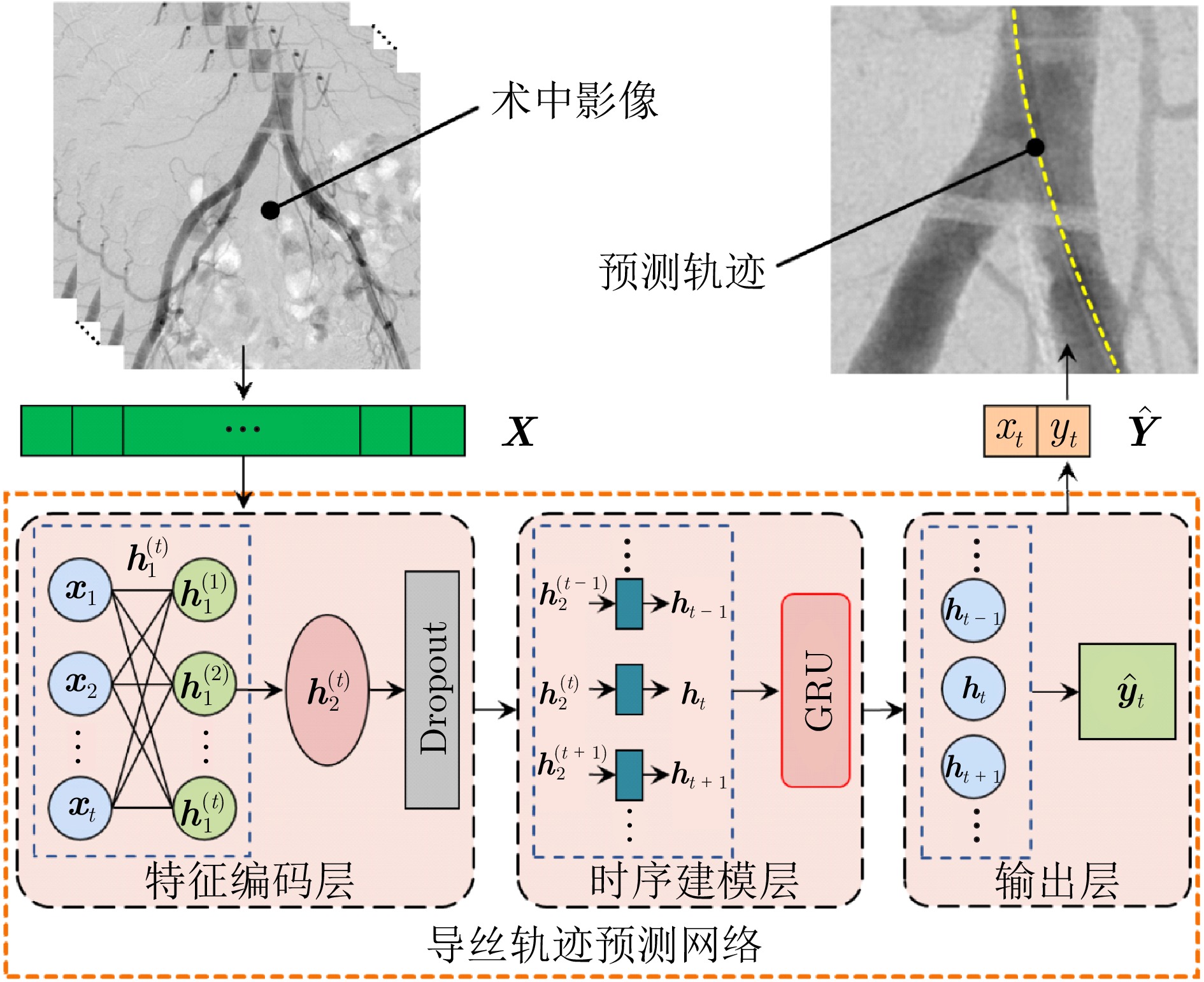 针对介入导航场景中的导丝轨迹重建问题, 提出一种保持因果性的序列估计方法. 不同于通用循环基线模型, 所提方法将序列级常量特征 (包括导丝刚度、进入角度和有效摩擦描述符) 按时间步广播, 与动态几何量(中心线坐标、直径等)拼接, 经两层特征编码后由单向门控循环单元解码器逐时输出二维坐标. 为处理变长序列, 本文采用时间步长分类的训练策略, 并结合掩码损失函数, 以抑制填充引入的无效梯度, 在不改变网络结构的前提下提升训练与推理效率. 基于覆盖多类导丝与多进入角度的仿体实验平台, 所提方法在保持因果性的同时, 实现0.40 ~ 0.54 mm的位置误差范围(平均误差为0.46 mm); 相较于未采用时间步分类策略的基线模型, 收敛epoch降低42%, 训练时间降低52%, 单次推理时延降低51%. 结果表明, 该方法可为导丝轨迹估计与术中导航提供可部署的算法基础.