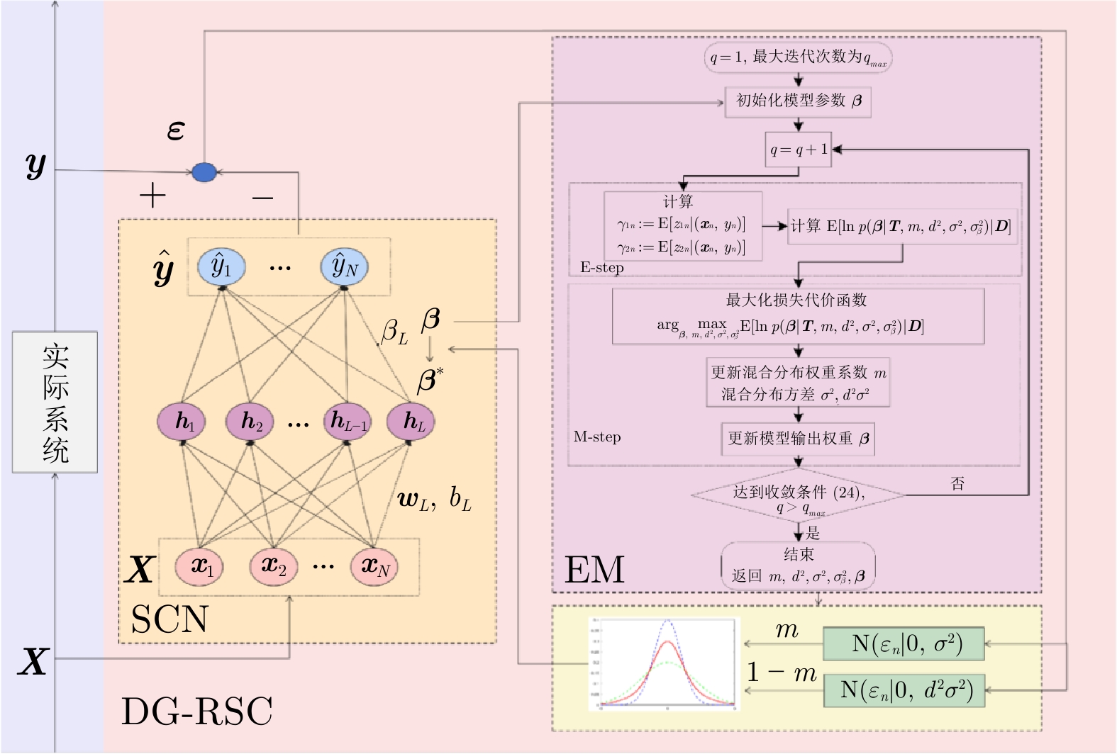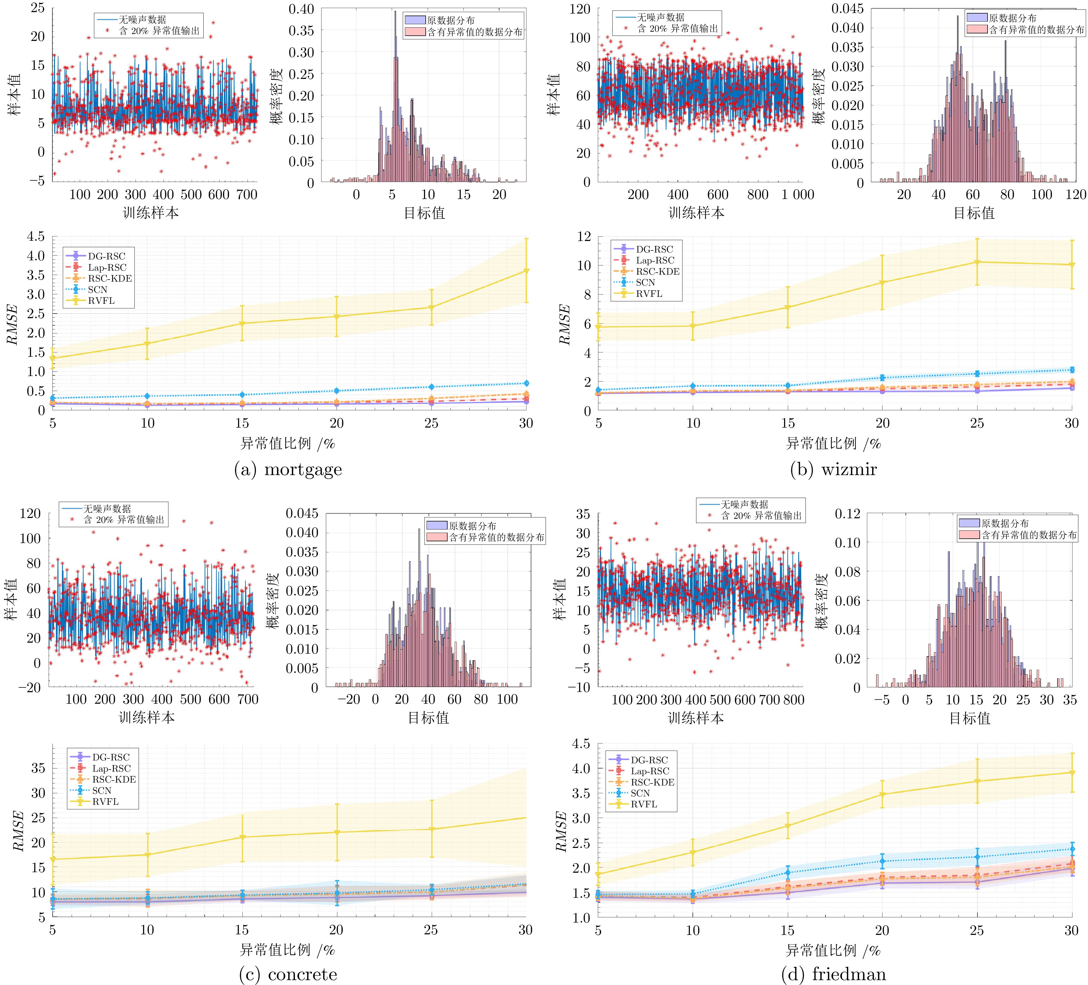 工业过程数据常常受到混合噪声干扰, 传统基于单一重尾分布的鲁棒建模方法在处理混合噪声问题时, 在准确性与可解释性方面均存在一定局限. 基于此, 提出一种混合双高斯分布的可解释鲁棒自适应建模方法. 该方法首先采用随机配置算法构建基础的随机配置网络学习模型, 确定模型的隐含层节点数、输入权重和偏置; 其次为保证模型对混合噪声的鲁棒性, 构建双高斯分布(一大一小方差)加权组合而成的噪声表征模型; 随后利用期望最大化算法自适应迭代学习随机配置网络输出权值和混合高斯模型噪声参数, 最终形成基于双高斯分布混合鲁棒建模方法. 该方法具有以下优势: 噪声模型能够通过参数自适应学习逼近实际混合噪声特性, 其中大方差高斯分量负责对异常噪声进行粗调, 小方差高斯分量则用于精细拟合主体噪声, 从而增强模型的可解释性; 在网络模型输出权值估计过程中, 通过为每个输出数据点自适应分配惩罚权重, 保障模型的鲁棒性能. 为验证所提方法的有效性, 分别在函数仿真、基准数据集和工业实例上设计多组对比实验, 结果均表明所提方法具备良好的可靠性与实用性.