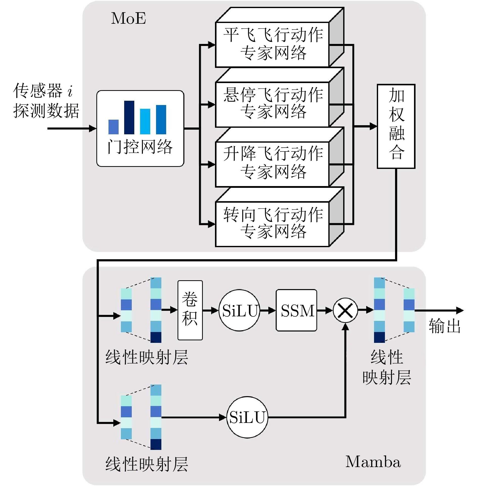 针对低空环境下动目标轨迹预测问题, 提出一种知识—数据—模型驱动的动目标轨迹融合预测框架. 基于低空飞行器运动特征构建飞行知识混合专家模型, 通过将多源传感器数据输入至各飞行知识专家模块, 实现目标机动模态的精细化识别, 并使用Mamba模型提取时空关联特征; 设计权值自适应调节机制, 利用注意力机制动态融合多源感知数据, 解决传感器时空异步问题; 采用门控循环单元建模长期时序依赖关系, 根据目标历史飞行数据生成初步预测轨迹; 基于低空目标运动学方程构建物理信息神经网络, 通过动态权衡数据驱动损失与物理约束损失, 矫正数据驱动偏差, 确保预测轨迹满足运动学约束并有效抑制多步预测误差累积. 数值仿真及实验验证结果表明, 所提出的知识—数据—模型驱动的动目标轨迹融合预测方法, 能够有效预测低空目标飞行轨迹.